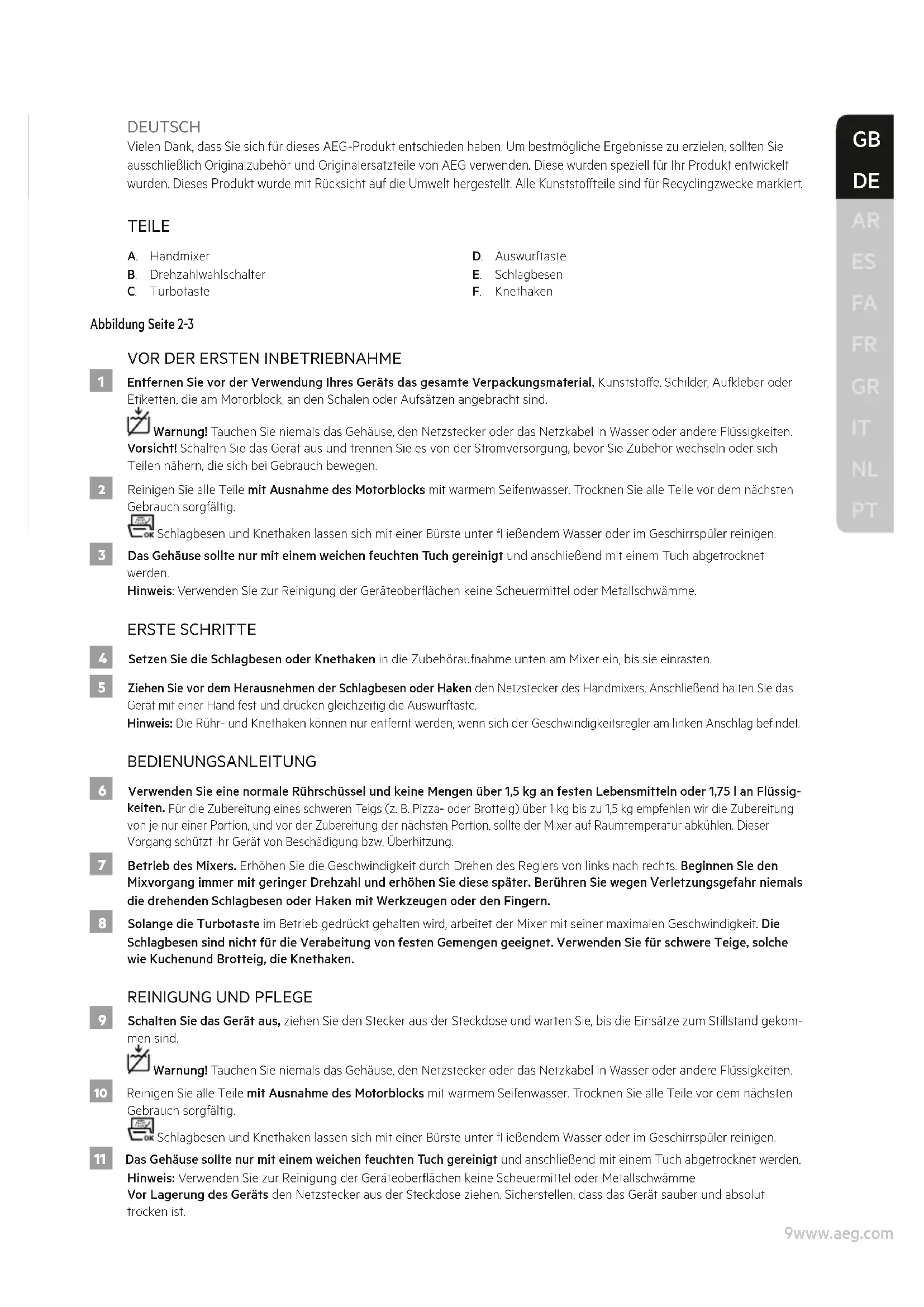 9 Schalten Sie das Gerät aus, ziehen Sie den Stecker aus der Steckdose und warten Sie, bis die Einsätze zum Stillstand gekom- men sind. Warnung! Tauchen Sie niemals das Gehäuse, den Netzstecker oder das Netzkabel in Wasser oder andere Flüssigkeiten. 10 Reinigen Sie alle Teile mit Ausnahme des Motorblocks mit warmem Seifenwasser. Trocknen Sie alle Teile vor dem nächsten Gebrauch sorgfältig. Schlagbesen und Knethaken lassen sich mit einer Bürste unter ießendem Wasser oder im Geschirrspüler reinigen. 11 Das Gehäuse sollte nur mit einem weichen feuchten Tuch gereinigt und anschließend mit einem Tuch abgetrocknet werden. Hinweis: Verwenden Sie zur Reinigung der Geräteoberächen keine Scheuermittel oder Metallschwämme Vor Lagerung des Geräts den Netzstecker aus der Steckdose ziehen. Sicherstellen, dass das Gerät sauber und absolut trocken ist.10www.aeg.com Wir wünschen Ihnen viel Spaß mit Ihrem neuen Produkt von AEG! SICHERHEITSHINWEISE Lesen Sie die nachfolgenden Anweisungen sorgfältig durch, bevor Sie das Gerät zum ersten Mal in Betrieb nehmen.