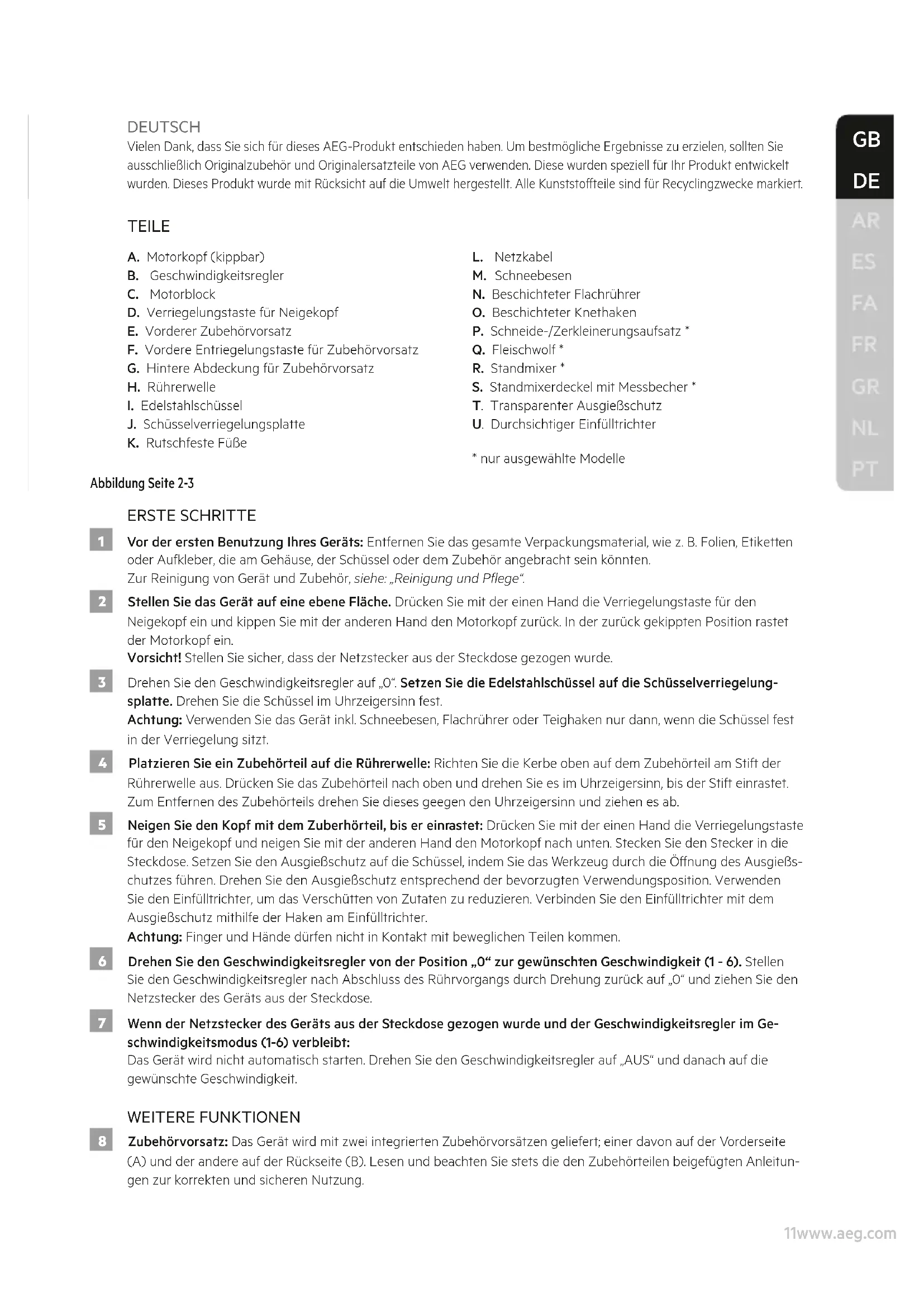 - nur ausgewählte Modelle Abbildung Seite 2-3 ERSTE SCHRITTE 1 Vor der ersten Benutzung Ihres Geräts: Entfernen Sie das gesamte Verpackungsmaterial, wie z. B. Folien, Etiketten oder Aufkleber, die am Gehäuse, der Schüssel oder dem Zubehör angebracht sein könnten. Zur Reinigung von Gerät und Zubehör, siehe: „Reinigung und Pege“. 2 Stellen Sie das Gerät auf eine ebene Fläche. Drücken Sie mit der einen Hand die Verriegelungstaste für den Neigekopf ein und kippen Sie mit der anderen Hand den Motorkopf zurück. In der zurück gekippten Position rastet der Motorkopf ein. Vorsicht! Stellen Sie sicher, dass der Netzstecker aus der Steckdose gezogen wurde. 3 Drehen Sie den Geschwindigkeitsregler auf „0“. Setzen Sie die Edelstahlschüssel auf die Schüsselverriegelung- splatte. Drehen Sie die Schüssel im Uhrzeigersinn fest. Achtung: Verwenden Sie das Gerät inkl. Schneebesen, Flachrührer oder Teighaken nur dann, wenn die Schüssel fest in der Verriegelung sitzt. 4 Platzieren Sie ein Zubehörteil auf die Rührerwelle: Richten Sie die Kerbe oben auf dem Zubehörteil am Stift der Rührerwelle aus. Drücken Sie das Zubehörteil nach oben und drehen Sie es im Uhrzeigersinn, bis der Stift einrastet. Zum Entfernen des Zubehörteils drehen Sie dieses geegen den Uhrzeigersinn und ziehen es ab. 5 Neigen Sie den Kopf mit dem Zuberhörteil, bis er einrastet: Drücken Sie mit der einen Hand die Verriegelungstaste für den Neigekopf und neigen Sie mit der anderen Hand den Motorkopf nach unten. Stecken Sie den Stecker in die Steckdose. Setzen Sie den Ausgießschutz auf die Schüssel, indem Sie das Werkzeug durch die Önung des Ausgießs- chutzes führen. Drehen Sie den Ausgießschutz entsprechend der bevorzugten Verwendungsposition. Verwenden Sie den Einfülltrichter, um das Verschütten von Zutaten zu reduzieren. Verbinden Sie den Einfülltrichter mit dem Ausgießschutz mithilfe der Haken am Einfülltrichter. Achtung: Finger und Hände dürfen nicht in Kontakt mit beweglichen Teilen kommen. 6 Drehen Sie den Geschwindigkeitsregler von der Position „0“ zur gewünschten Geschwindigkeit (1 - 6). Stellen Sie den Geschwindigkeitsregler nach Abschluss des Rührvorgangs durch Drehung zurück auf „0“ und ziehen Sie den Netzstecker des Geräts aus der Steckdose. 7 Wenn der Netzstecker des Geräts aus der Steckdose gezogen wurde und der Geschwindigkeitsregler im Ge- schwindigkeitsmodus (1-6) verbleibt: Das Gerät wird nicht automatisch starten. Drehen Sie den Geschwindigkeitsregler auf „AUS“ und danach auf die gewünschte Geschwindigkeit. WEITERE FUNKTIONEN 8 Zubehörvorsatz: Das Gerät wird mit zwei integrierten Zubehörvorsätzen geliefert; einer davon auf der Vorderseite (A) und der andere auf der Rückseite (B). Lesen und beachten Sie stets die den Zubehörteilen beigefügten Anleitun- gen zur korrekten und sicheren Nutzung.12www.aeg.com