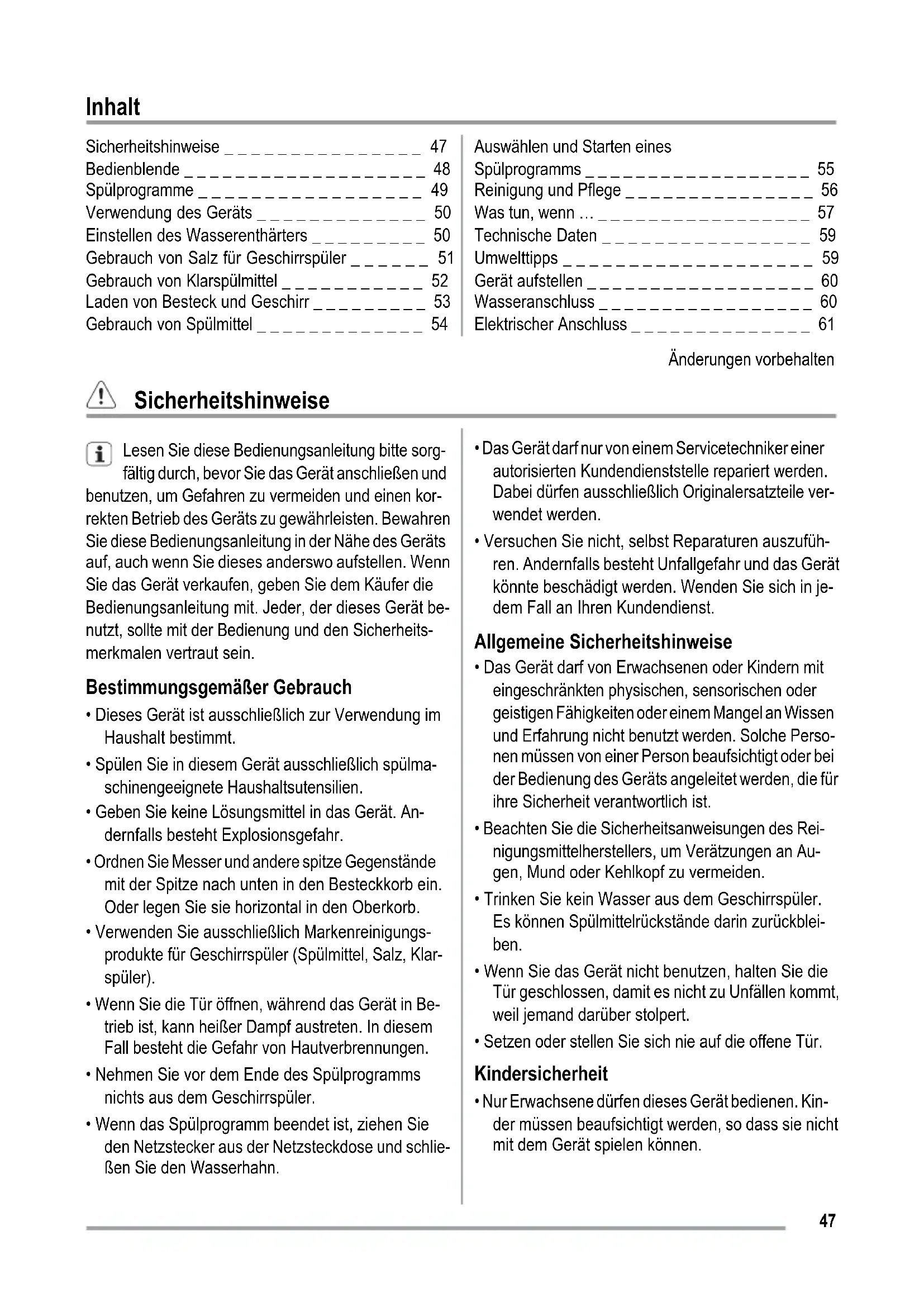 - Verwenden Sie ausschließlich Markenreinigungs- produkte für Geschirrspüler (Spülmittel, Salz, Klar- spüler).
