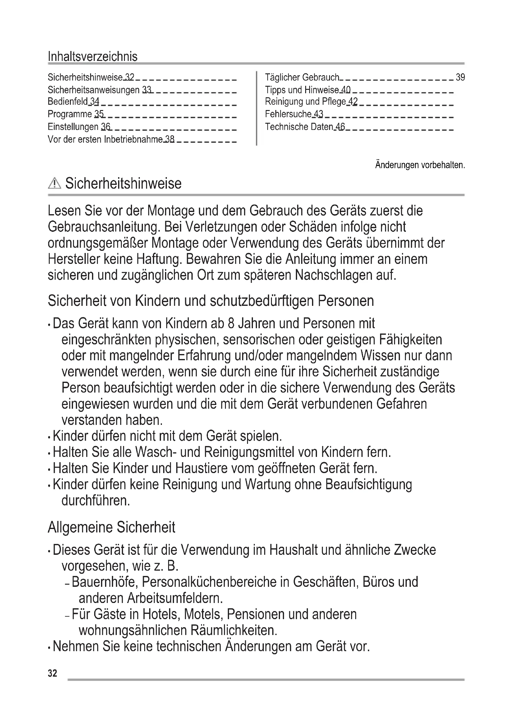 Tipps und Hinweise 40 Reinigung und Pflege 42 Fehlersuche 43 Technische Daten 46 Änderungen vorbehalten. Sicherheitshinweise Lesen Sie vor der Montage und dem Gebrauch des Geräts zuerst die Gebrauchsanleitung. Bei Verletzungen oder Schäden infolge nicht ordnungsgemäßer Montage oder Verwendung des Geräts übernimmt der Hersteller keine Haftung. Bewahren Sie die Anleitung immer an einem sicheren und zugänglichen Ort zum späteren Nachschlagen auf. Sicherheit von Kindern und schutzbedürftigen Personen