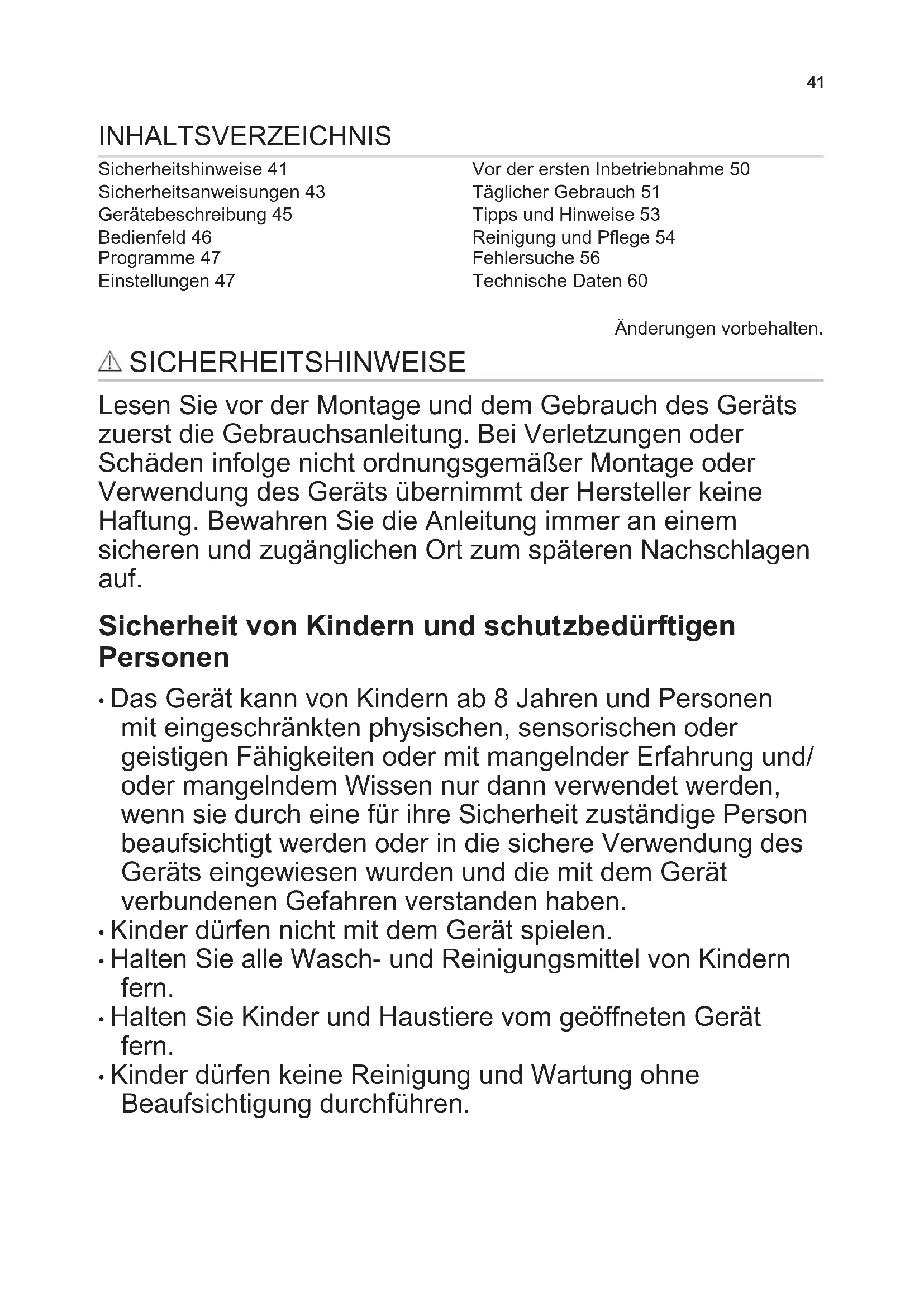 - Kinder dürfen keine Reinigung und Wartung ohne Beaufsichtigung durchführen. 41Allgemeine Sicherheit