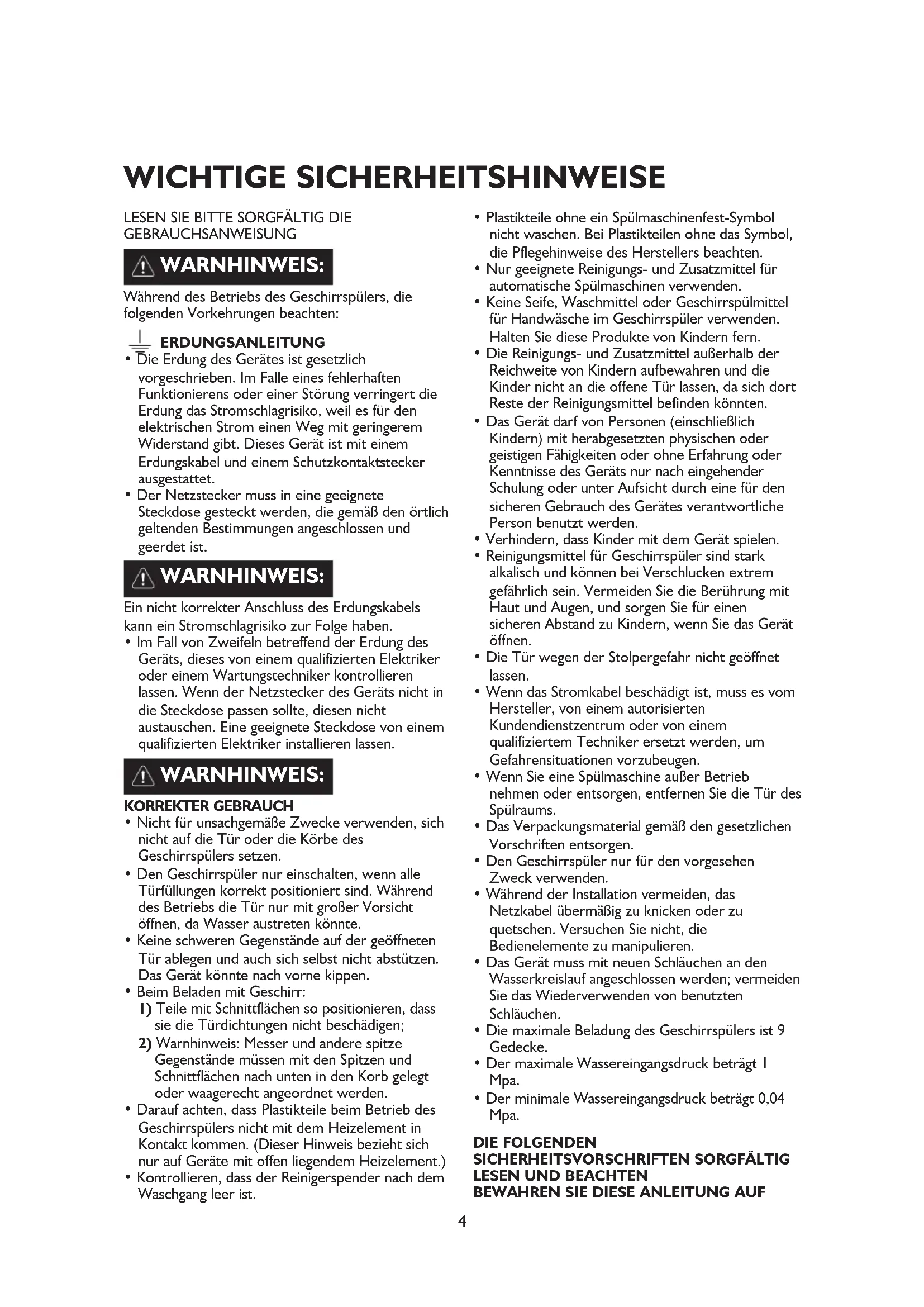 GEBRAUCHSANWEISUNG Während des Betriebs des Geschirrspülers, die folgenden Vorkehrungen beachten: ERDUNGSANLEITUNG