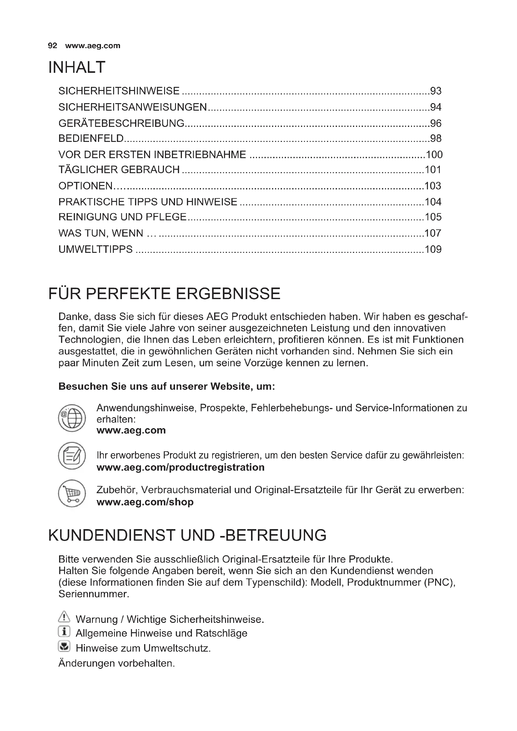 Danke, dass Sie sich für dieses AEG Produkt entschieden haben. Wir haben es geschaf- fen, damit Sie viele Jahre von seiner ausgezeichneten Leistung und den innovativen Technologien, die Ihnen das Leben erleichtern, protieren können. Es ist mit Funktionen ausgestattet, die in gewöhnlichen Geräten nicht vorhanden sind. Nehmen Sie sich ein paar Minuten Zeit zum Lesen, um seine Vorzüge kennen zu lernen. Besuchen Sie uns auf unserer Website, um: Anwendungshinweise, Prospekte, Fehlerbehebungs- und Service-Informationen zu erhalten: www.aeg.com Ihr erworbenes Produkt zu registrieren, um den besten Service dafür zu gewährleisten: www.aeg.com/productregistration Zubehör, Verbrauchsmaterial und Original-Ersatzteile für Ihr Gerät zu erwerben: www.aeg.com/shop