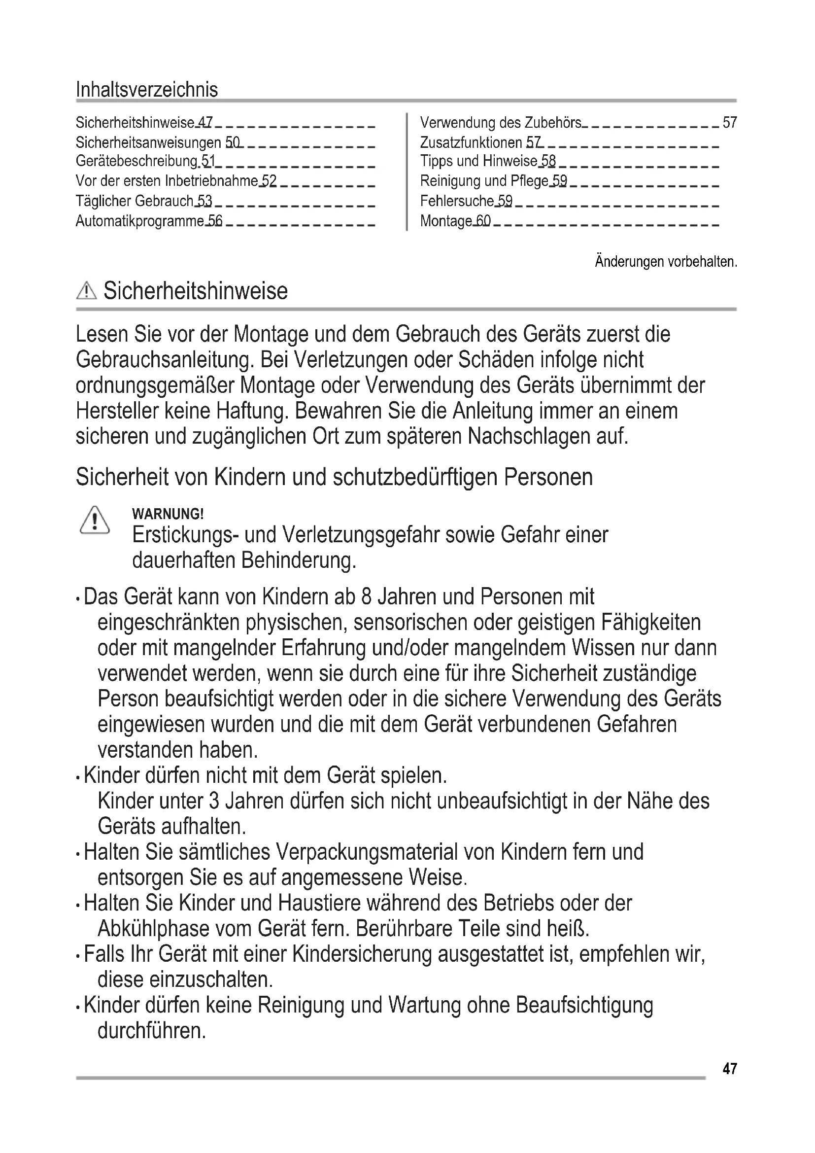 Zusatzfunktionen 57 Tipps und Hinweise 58 Reinigung und Pflege 59 Fehlersuche 59 Montage 60 Änderungen vorbehalten. Sicherheitshinweise Lesen Sie vor der Montage und dem Gebrauch des Geräts zuerst die Gebrauchsanleitung. Bei Verletzungen oder Schäden infolge nicht ordnungsgemäßer Montage oder Verwendung des Geräts übernimmt der Hersteller keine Haftung. Bewahren Sie die Anleitung immer an einem sicheren und zugänglichen Ort zum späteren Nachschlagen auf. Sicherheit von Kindern und schutzbedürftigen Personen WARNUNG! Erstickungs- und Verletzungsgefahr sowie Gefahr einer dauerhaften Behinderung.