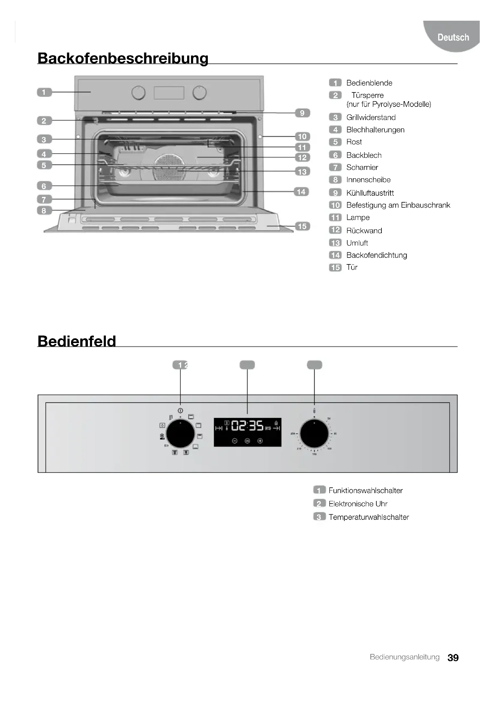 ECO AUFTAUEN HYDROCLEAN PYROLYSE SCHNELLAUFHEIZUNG HINWEIS In der zu Ihrem Backofen gehörenden Anleitung zum Garen finden Sie eine Be- schreibung der einzelnen Funktionen.41 Bedienungsanleitung Deutsch Beschreibung der elektronischen Uhr