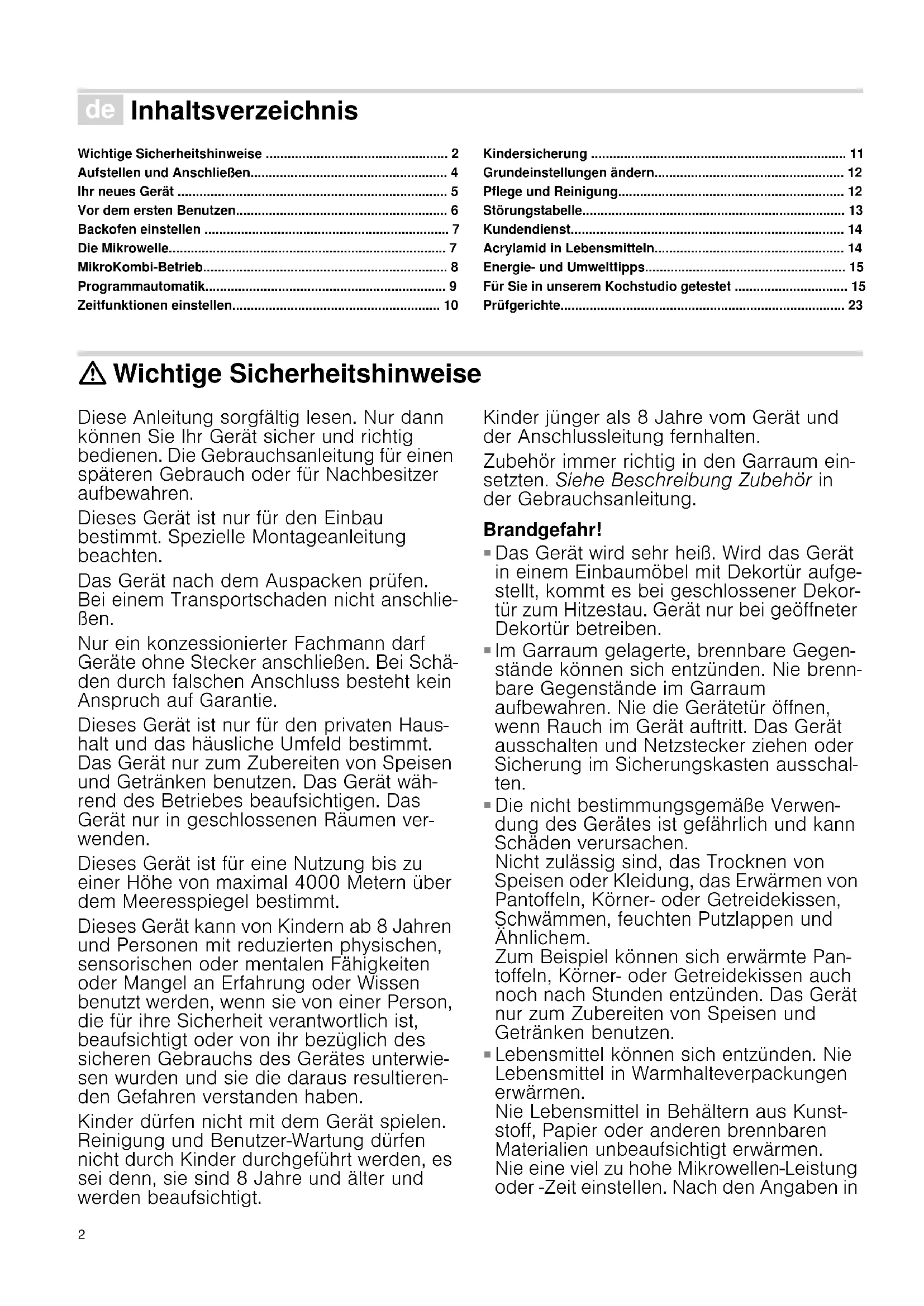 - Prüfgerichte : Wichtige Sicherheitshinweise Diese Anleitung sorgfältig lesen. Nur dann können Sie Ihr Gerät sicher und richtig bedienen. Die Gebrauchsanleitung für einen späteren Gebrauch oder für Nachbesitzer aufbewahren. Dieses Gerät ist nur für den Einbau bestimmt. Spezielle Montageanleitung beachten. Das Gerät nach dem Auspacken prüfen. Bei einem Transportschaden nicht anschlie- ßen. Nur ein konzessionierter Fachmann darf Geräte ohne Stecker anschließen. Bei Schä- den durch falschen Anschluss besteht kein Anspruch auf Garantie. Dieses Gerät ist nur für den privaten Haus- halt und das häusliche Umfeld bestimmt. Das Gerät nur zum Zubereiten von Speisen und Getränken benutzen. Das Gerät wäh- rend des Betriebes beaufsichtigen. Das Gerät nur in geschlossenen Räumen ver- wenden. Dieses Gerät ist für eine Nutzung bis zu einer Höhe von maximal 4000 Metern über dem Meeresspiegel bestimmt. Dieses Gerät kann von Kindern ab 8 Jahren und Personen mit reduzierten physischen, sensorischen oder mentalen Fähigkeiten oder Mangel an Erfahrung oder Wissen benutzt werden, wenn sie von einer Person, die für ihre Sicherheit verantwortlich ist, beaufsichtigt oder von ihr bezüglich des sicheren Gebrauchs des Gerätes unterwie- sen wurden und sie die daraus resultieren- den Gefahren verstanden haben. Kinder dürfen nicht mit dem Gerät spielen. Reinigung und Benutzer-Wartung dürfen nicht durch Kinder durchgeführt werden, es sei denn, sie sind 8 Jahre und älter und werden beaufsichtigt. Kinder jünger als 8 Jahre vom Gerät und der Anschlussleitung fernhalten. Zubehör immer richtig in den Garraum ein- setzten. Siehe Beschreibung Zubehör in der Gebrauchsanleitung. Brandgefahr! p. 23