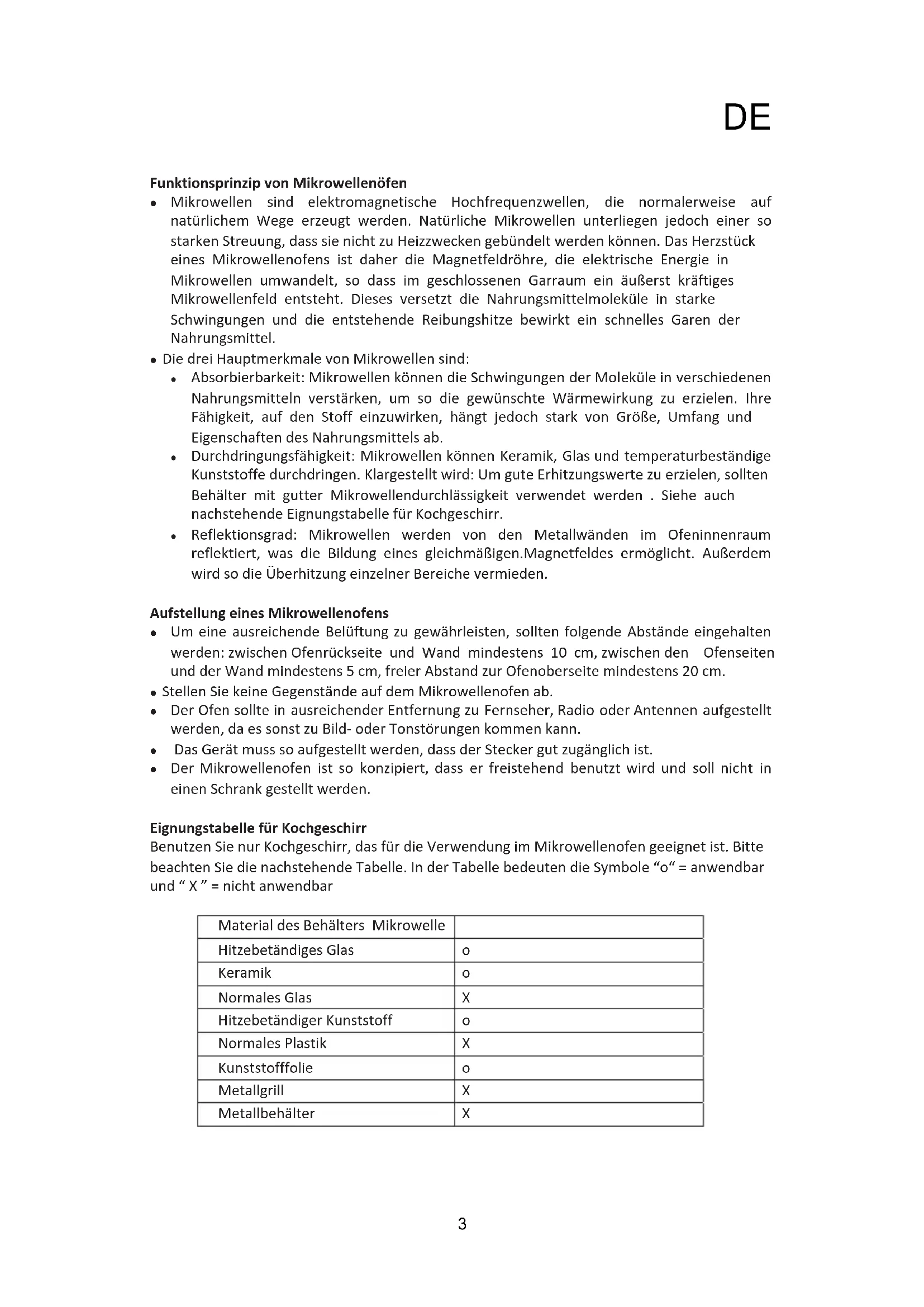 DEVor dem Erstgebrauch Da es möglich ist, dass sich noch Produ ände oder Öl im Innenraum oder am Heizelement en, kann Geruch entstehen. Sogar leichter Rauch kann Dies ist ein normaler Vorgang, der nach mehrmaliger Benutzung der Mikrowelle au ört. Halten Sie die Tür oder ein Fenster g, um für eine ausreichende Be zu sorgen. Wir empfehlen dringend, folgendermaßen vorzugehen: Stellen Sie bei dem Ofen ohne integrierte Gr eine Tasse Wasser auf das Drehteller, stellen Sie die Leistung hoch ein und schalten Sie ihn mehrere Male ein. Produktbeschreibung