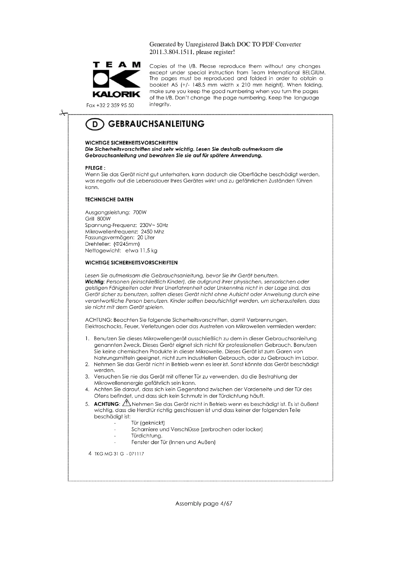 ACHTUNG: DIESES GERÄT MUSS GEERDET SEIN. Die Anschlussleitung ist 1,4 Meter lang, die Steckdose sollte sich daher innerhalb dieses Bereiches befinden. Für mehr Auskünfte oder Hilfe für die technische Installation Ihres Gerätes, wenden Sie sich an einen Fachmann.Generated by Unregistered Batch DOC TO PDF Converter 2011.3.804.1511, please register! Copies of the I/B. Please reproduce them without any changes except under special instruction from Team International BELGIUM. The pages must be reproduced and folded in order to obtain a booklet A5 (+/- 148.5 mm width x 210 mm height). When folding, make sure you keep the good numbering when you turn the pages of the I/B. Don‟t change the page numbering. Keep the language integrity.