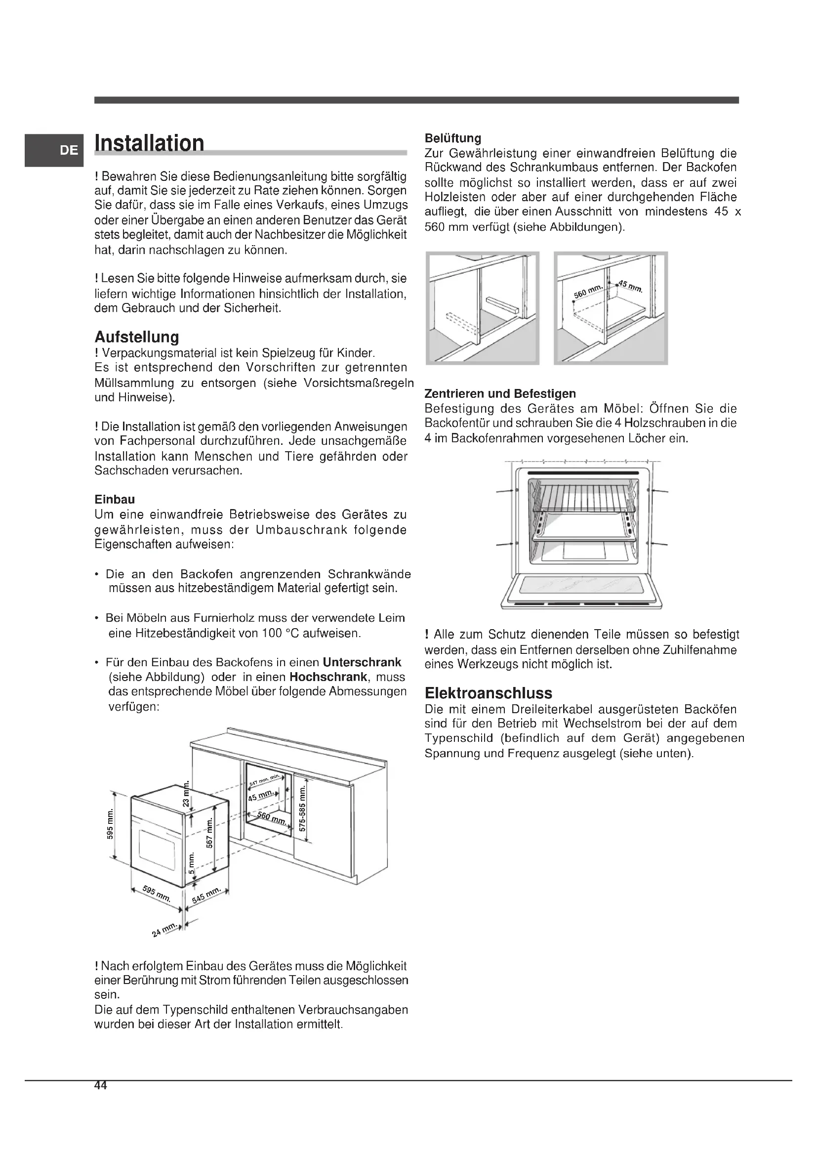 - Für den Einbau des Backofens in einen Unterschrank (siehe Abbildung) oder in einen Hochschrank, muss das entsprechende Möbel über folgende Abmessungen verfügen: 595 mm. 595 mm.24 mm.545 mm.5 mm.567 mm.23 mm.575-585 mm.45 mm.560 mm. 547 mm. min. ! Nach erfolgtem Einbau des Gerätes muss die Möglichkeit einer Berührung mit Strom führenden Teilen ausgeschlossen sein. Die auf dem Typenschild enthaltenen Verbrauchsangaben wurden bei dieser Art der Installation ermittelt. Belüftung Zur Gewährleistung einer einwandfreien Belüftung die Rückwand des Schrankumbaus entfernen. Der Backofen sollte möglichst so installiert werden, dass er auf zwei Holzleisten oder aber auf einer durchgehenden Fläche auiegt, die über einen Ausschnitt von mindestens 45 x 560 mm verfügt (siehe Abbildungen). 560 mm. 45 mm. Zentrieren und Befestigen Befestigung des Gerätes am Möbel: Öffnen Sie die Backofentür und schrauben Sie die 4 Holzschrauben in die 4 im Backofenrahmen vorgesehenen Löcher ein. ! Alle zum Schutz dienenden Teile müssen so befestigt werden, dass ein Entfernen derselben ohne Zuhilfenahme eines Werkzeugs nicht möglich ist. Elektroanschluss Die mit einem Dreileiterkabel ausgerüsteten Backöfen sind für den Betrieb mit Wechselstrom bei der auf dem Typenschild (befindlich auf dem Gerät) angegebenen Spannung und Frequenz ausgelegt (siehe unten).45