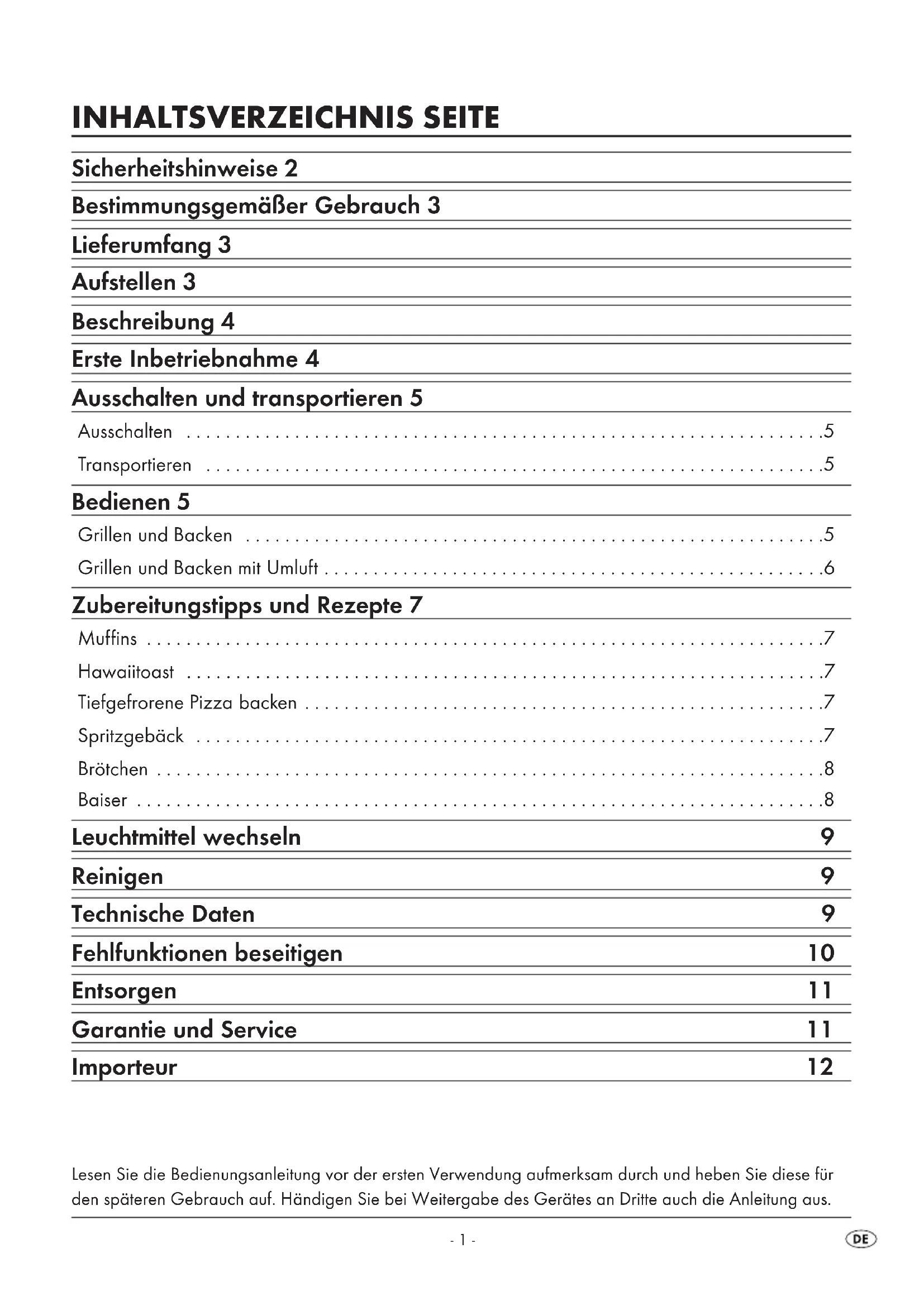 - Baiser Leuchtmittel wechseln 9 Reinigen 9 Technische Daten 9 Fehlfunktionen beseitigen 10 Entsorgen 11 Garantie und Service 11 Importeur 12 Lesen Sie die Bedienungsanleitung vor der ersten Verwendung aufmerksam durch und heben Sie diese für den späteren Gebrauch auf. Händigen Sie bei Weitergabe des Gerätes an Dritte auch die Anleitung aus. IB_63914_SGB1380A1_LB1 06.04.2011 14:40 Uhr Seite 1- 2 - Grill- und Backautomat Sicherheitshinweise Achtung! Gefahr! p. 8