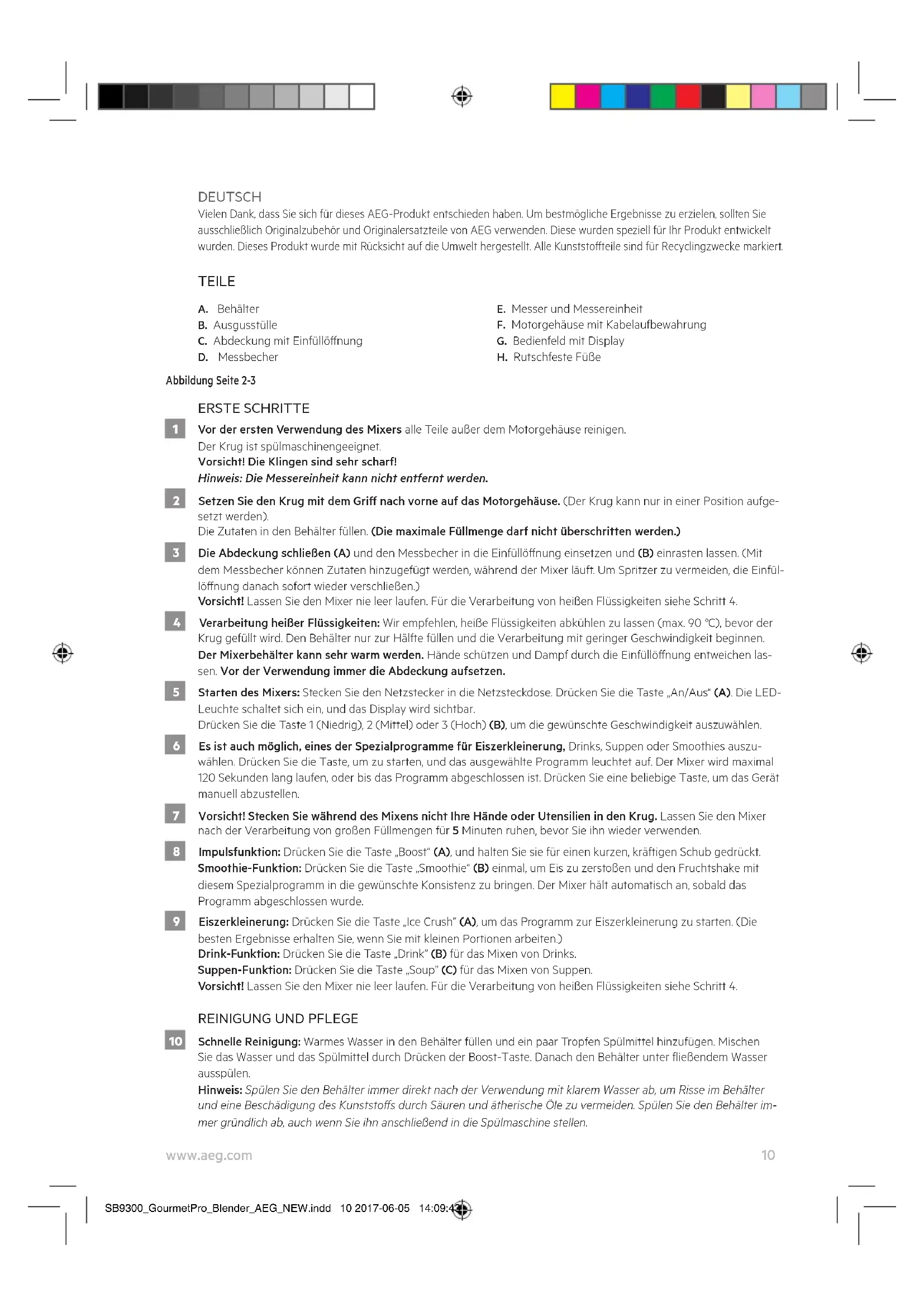 The blender does not switch on. Jug/base are not xed properly. Check if all the components are in correct position. Note! the jug can only be placed on the base with handle towards the user interface. The Power button is not pressed. Make sure the Power button is illuminated. If not, press the Power button to turn the blender on. The motor has overheated. The display is blinking. Wait until the product has cooled down and all the buttons are lit. The plug is not properly connected to the power outlet. Check the connection of the plug to the outlet or try another outlet. Power outage. Wait until power outage is over. Functional problem. Contact authorized service. DISPOSAL This symbol on the product indicates that this product contains a battery which shall not be disposed with normal household waste. This symbol on the product or on its packaging indicates that the product may not be treated as household waste. To recycle your product, please take it to an oicial collection point or to an AEG service center that can remove and recycle the battery and electric parts in a safe and professional way. Follow your country’s rules for the separate collection of electrical products and rechargeable batteries. AEG reserves the right to change products, information and specications without notice. SB9300_GourmetPro_Blender_AEG_NEW.indd 9 2017-06-05 14:09:4210 www.aeg.com DEUTSCH Vielen Dank, dass Sie sich für dieses AEG-Produkt entschieden haben. Um bestmögliche Ergebnisse zu erzielen, sollten Sie ausschließlich Originalzubehör und Originalersatzteile von AEG verwenden. Diese wurden speziell für Ihr Produkt entwickelt wurden. Dieses Produkt wurde mit Rücksicht auf die Umwelt hergestellt. Alle Kunststoteile sind für Recyclingzwecke markiert. TEILE A. Behälter B. Ausgusstülle C. Abdeckung mit Einfüllönung D. Messbecher E. Messer und Messereinheit F. Motorgehäuse mit Kabelaufbewahrung G. Bedienfeld mit Display H. Rutschfeste Füße Abbildung Seite 2-3 ERSTE SCHRITTE 1 Vor der ersten Verwendung des Mixers alle Teile außer dem Motorgehäuse reinigen. Der Krug ist spülmaschinengeeignet. Vorsicht! Die Klingen sind sehr scharf! Hinweis: Die Messereinheit kann nicht entfernt werden. 2 Setzen Sie den Krug mit dem Gri nach vorne auf das Motorgehäuse. (Der Krug kann nur in einer Position aufge- setzt werden). Die Zutaten in den Behälter füllen. (Die maximale Füllmenge darf nicht überschritten werden.) 3 Die Abdeckung schließen (A) und den Messbecher in die Einfüllönung einsetzen und (B) einrasten lassen. (Mit dem Messbecher können Zutaten hinzugefügt werden, während der Mixer läuft. Um Spritzer zu vermeiden, die Einfül- lönung danach sofort wieder verschließen.) Vorsicht! Lassen Sie den Mixer nie leer laufen. Für die Verarbeitung von heißen Flüssigkeiten siehe Schritt 4. 4 Verarbeitung heißer Flüssigkeiten: Wir empfehlen, heiße Flüssigkeiten abkühlen zu lassen (max. 90 °C), bevor der Krug gefüllt wird. Den Behälter nur zur Hälfte füllen und die Verarbeitung mit geringer Geschwindigkeit beginnen. Der Mixerbehälter kann sehr warm werden. Hände schützen und Dampf durch die Einfüllönung entweichen las- sen. Vor der Verwendung immer die Abdeckung aufsetzen. 5 Starten des Mixers: Stecken Sie den Netzstecker in die Netzsteckdose. Drücken Sie die Taste „An/Aus“ (A). Die LED- Leuchte schaltet sich ein, und das Display wird sichtbar. Drücken Sie die Taste 1 (Niedrig), 2 (Mittel) oder 3 (Hoch) (B), um die gewünschte Geschwindigkeit auszuwählen. 6 Es ist auch möglich, eines der Spezialprogramme für Eiszerkleinerung, Drinks, Suppen oder Smoothies auszu- wählen. Drücken Sie die Taste, um zu starten, und das ausgewählte Programm leuchtet auf. Der Mixer wird maximal 120 Sekunden lang laufen, oder bis das Programm abgeschlossen ist. Drücken Sie eine beliebige Taste, um das Gerät manuell abzustellen. 7 Vorsicht! Stecken Sie während des Mixens nicht Ihre Hände oder Utensilien in den Krug. Lassen Sie den Mixer nach der Verarbeitung von großen Füllmengen für 5 Minuten ruhen, bevor Sie ihn wieder verwenden. 8 Impulsfunktion: Drücken Sie die Taste „Boost“ (A), und halten Sie sie für einen kurzen, kräftigen Schub gedrückt. Smoothie-Funktion: Drücken Sie die Taste „Smoothie“ (B) einmal, um Eis zu zerstoßen und den Fruchtshake mit diesem Spezialprogramm in die gewünschte Konsistenz zu bringen. Der Mixer hält automatisch an, sobald das Programm abgeschlossen wurde. 9 Eiszerkleinerung: Drücken Sie die Taste „Ice Crush” (A), um das Programm zur Eiszerkleinerung zu starten. (Die besten Ergebnisse erhalten Sie, wenn Sie mit kleinen Portionen arbeiten.) Drink-Funktion: Drücken Sie die Taste „Drink” (B) für das Mixen von Drinks. Suppen-Funktion: Drücken Sie die Taste „Soup” (C) für das Mixen von Suppen. Vorsicht! Lassen Sie den Mixer nie leer laufen. Für die Verarbeitung von heißen Flüssigkeiten siehe Schritt 4.