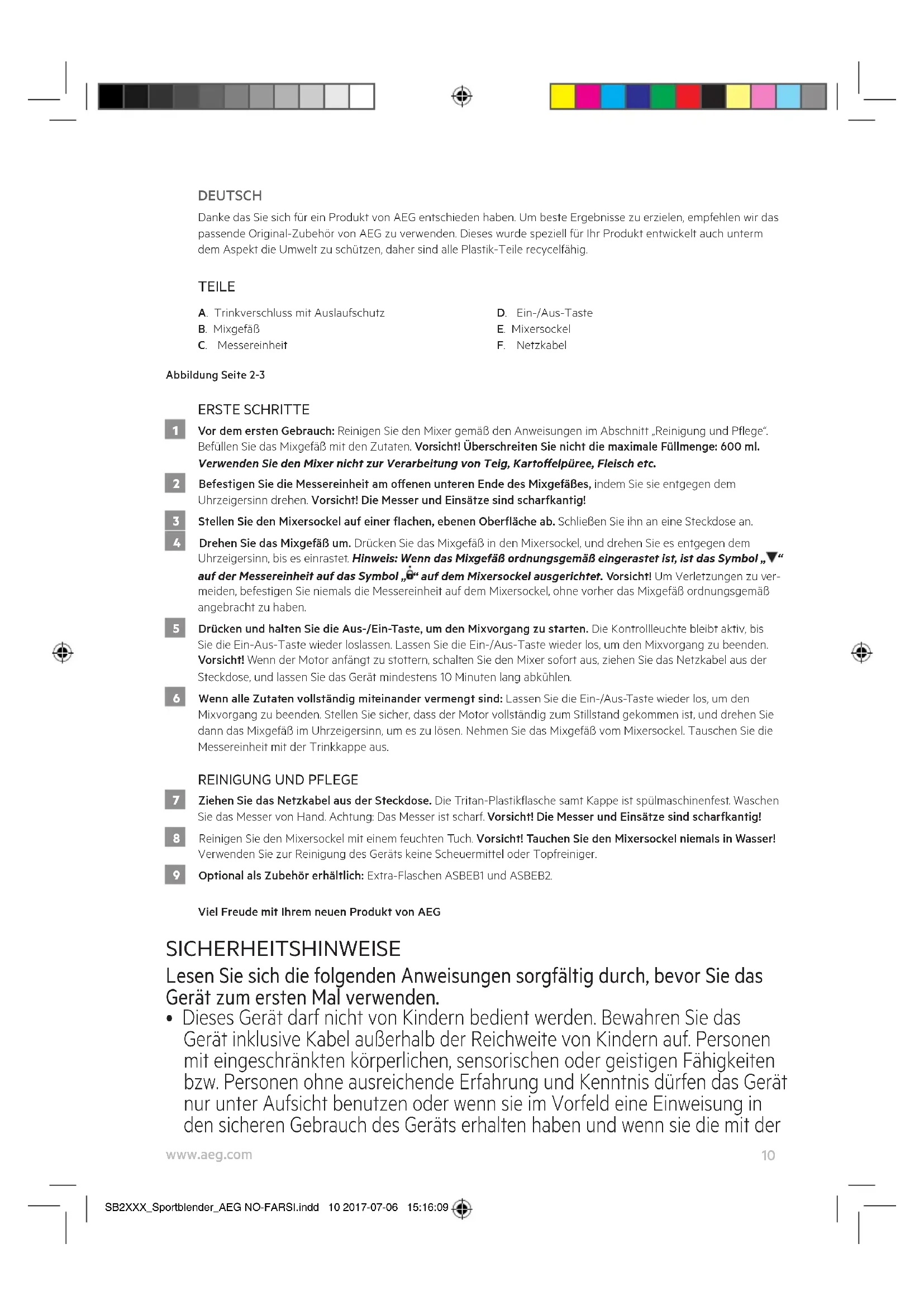 - Dieses Gerät darf nicht von Kindern bedient werden. Bewahren Sie das Gerät inklusive Kabel außerhalb der Reichweite von Kindern auf. Personen mit eingeschränkten körperlichen, sensorischen oder geistigen Fähigkeiten bzw. Personen ohne ausreichende Erfahrung und Kenntnis dürfen das Gerät nur unter Aufsicht benutzen oder wenn sie im Vorfeld eine Einweisung in den sicheren Gebrauch des Geräts erhalten haben und wenn sie die mit der SB2XXX_Sportblender_AEG NO-FARSI.indd 10 2017-07-06 15:16:0911 www.aeg.com
