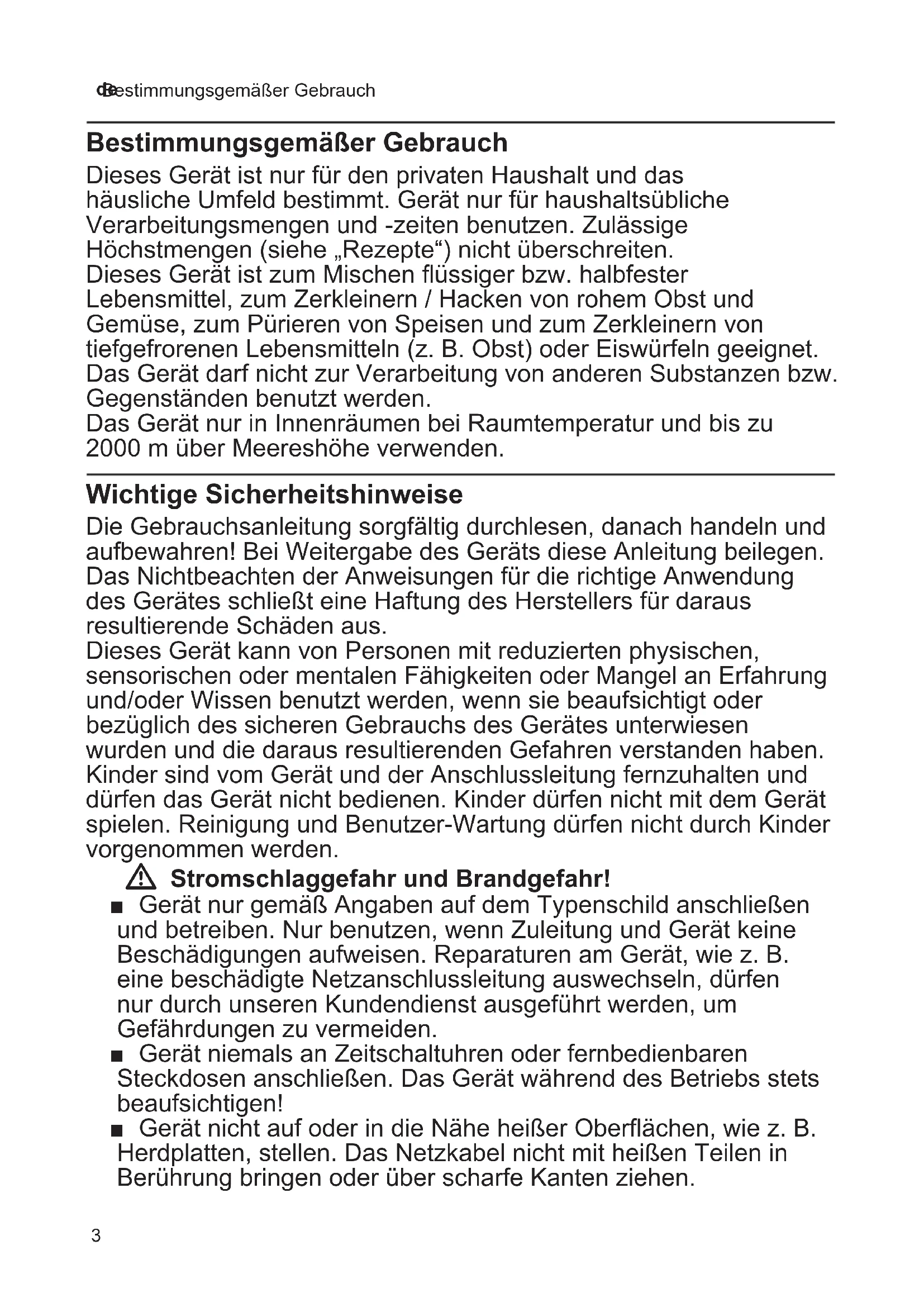 Bestimmungsgemäßer Gebrauch Bestimmungsgemäßer Gebrauch Dieses Gerät ist nur für den privaten Haushalt und das häusliche Umfeld bestimmt. Gerät nur für haushaltsübliche Verarbeitungsmengen und -zeiten benutzen. Zulässige Höchstmengen (siehe „Rezepte“) nicht überschreiten. Dieses Gerät ist zum Mischen üssiger bzw. halbfester Lebensmittel, zum Zerkleinern / Hacken von rohem Obst und Gemüse, zum Pürieren von Speisen und zum Zerkleinern von tiefgefrorenen Lebensmitteln (z. B. Obst) oder Eiswürfeln geeignet. Das Gerät darf nicht zur Verarbeitung von anderen Substanzen bzw. Gegenständen benutzt werden. Das Gerät nur in Innenräumen bei Raumtemperatur und bis zu 2000 m über Meereshöhe verwenden. Wichtige Sicherheitshinweise Die Gebrauchsanleitung sorgfältig durchlesen, danach handeln und aufbewahren! Bei Weitergabe des Geräts diese Anleitung beilegen. Das Nichtbeachten der Anweisungen für die richtige Anwendung des Gerätes schließt eine Haftung des Herstellers für daraus resultierende Schäden aus. Dieses Gerät kann von Personen mit reduzierten physischen, sensorischen oder mentalen Fähigkeiten oder Mangel an Erfahrung und/oder Wissen benutzt werden, wenn sie beaufsichtigt oder bezüglich des sicheren Gebrauchs des Gerätes unterwiesen wurden und die daraus resultierenden Gefahren verstanden haben. Kinder sind vom Gerät und der Anschlussleitung fernzuhalten und dürfen das Gerät nicht bedienen. Kinder dürfen nicht mit dem Gerät spielen. Reinigung und Benutzer-Wartung dürfen nicht durch Kinder vorgenommen werden. W Stromschlaggefahr und Brandgefahr! ■ Gerät nur gemäß Angaben auf dem Typenschild anschließen und betreiben. Nur benutzen, wenn Zuleitung und Gerät keine Beschädigungen aufweisen. Reparaturen am Gerät, wie z. B. eine beschädigte Netzanschlussleitung auswechseln, dürfen nur durch unseren Kundendienst ausgeführt werden, um Gefährdungen zu vermeiden. ■ Gerät niemals an Zeitschaltuhren oder fernbedienbaren Steckdosen anschließen. Das Gerät während des Betriebs stets beaufsichtigen! ■ Gerät nicht auf oder in die Nähe heißer Oberächen, wie z. B. Herdplatten, stellen. Das Netzkabel nicht mit heißen Teilen in Berührung bringen oder über scharfe Kanten ziehen.4 de Wichtige Sicherheitshinweise ■ Das Grundgerät niemals in Wasser tauchen oder in den Geschirrspüler geben. Keinen Dampfreiniger benutzen. Das Gerät nicht mit feuchten Händen benutzen. ■ Das Gerät muss nach jedem Gebrauch, bei nicht vorhandener Aufsicht, vor dem Zusammenbau, Auseinandernehmen oder Reinigen und im Fehlerfall stets vom Netz getrennt werden. W Verletzungsgefahr! ■ Vor dem Auswechseln von Zubehör oder Zusatzteilen, die im Betrieb bewegt werden, muss das Gerät ausgeschaltet und vom Netz getrennt werden. ■ Niemals in den aufgesetzten Mixer greifen! Mixer nie ohne aufgesetzen Deckel betreiben. ■ Vorsicht beim Umgang mit den scharfen Messern, bei der Entleerung des Behälters und bei der Reinigung. ■ Vor dem Ausschalten unbedingt den Drehwähler bis zum Anschlag gegen den Uhrzeigersinn drehen (Nullstellung). ■ Nach dem Ausschalten läuft der Antrieb kurze Zeit nach. Vollständigen Stillstand des Antriebs abwarten. ■ Gerät nur im komplett zusammengesetzten Zustand verwenden. W Verbrühungsgefahr! ■ Vorsicht beim Einfüllen heißer Flüssigkeiten. Durch plötzliche Dampfbildung kann die Flüssigkeit aus dem Behälter herausspritzen. ■ Den Deckel während der Arbeit immer mit einer Hand festhalten. Dabei nicht über die Nachfüllönung greifen! Beim Verarbeiten von heißem Mixgut tritt Dampf durch die Nachfüllönung im Deckel aus. W Erstickungsgefahr! Kinder nicht mit Verpackungsmaterial spielen lassen. W Achtung! ■ Darauf achten, dass sich keine Fremdkörper im Mixbecher benden. Nicht mit Gegenständen (z. B. Messer, Löel) im Mixbecher hantieren. Ausschließlich den mitgelieferten Stopfer bei aufgesetztem Deckel verwenden! ■ Es wird empfohlen, das Gerät niemals länger eingeschaltet zu lassen, wie für die Verarbeitung der Lebensmittel notwendig. Nicht im Leerlauf betreiben. W Wichtig! Das Gerät nach jeder Verwendung oder nach längerem Nichtgebrauch unbedingt gründlich reinigen. X „Reinigung und Pege“ siehe Seite 95