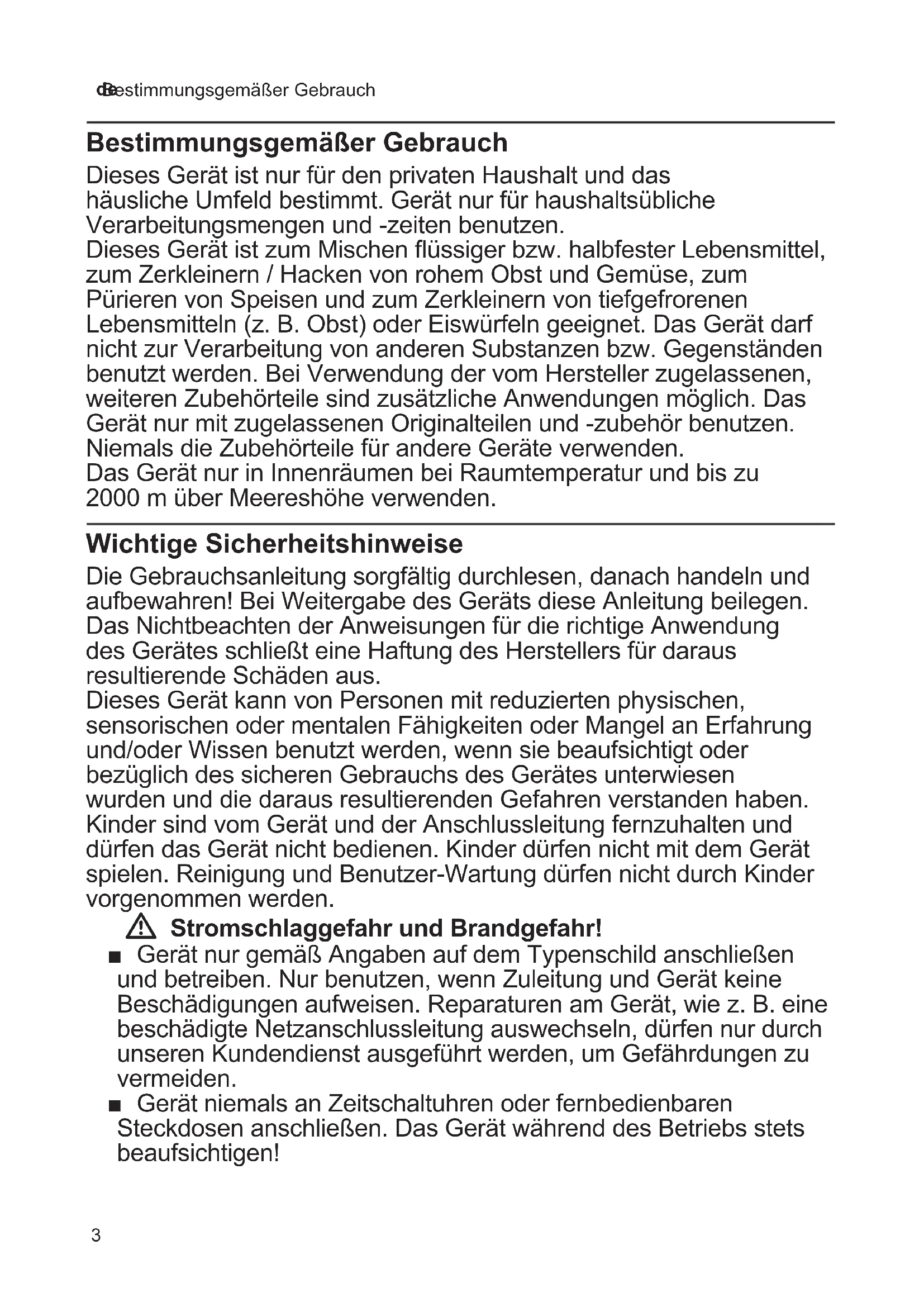 Bestimmungsgemäßer Gebrauch Bestimmungsgemäßer Gebrauch Dieses Gerät ist nur für den privaten Haushalt und das häusliche Umfeld bestimmt. Gerät nur für haushaltsübliche Verarbeitungsmengen und -zeiten benutzen. Dieses Gerät ist zum Mischen üssiger bzw. halbfester Lebensmittel, zum Zerkleinern / Hacken von rohem Obst und Gemüse, zum Pürieren von Speisen und zum Zerkleinern von tiefgefrorenen Lebensmitteln (z. B. Obst) oder Eiswürfeln geeignet. Das Gerät darf nicht zur Verarbeitung von anderen Substanzen bzw. Gegenständen benutzt werden. Bei Verwendung der vom Hersteller zugelassenen, weiteren Zubehörteile sind zusätzliche Anwendungen möglich. Das Gerät nur mit zugelassenen Originalteilen und -zubehör benutzen. Niemals die Zubehörteile für andere Geräte verwenden. Das Gerät nur in Innenräumen bei Raumtemperatur und bis zu 2000 m über Meereshöhe verwenden. Wichtige Sicherheitshinweise Die Gebrauchsanleitung sorgfältig durchlesen, danach handeln und aufbewahren! Bei Weitergabe des Geräts diese Anleitung beilegen. Das Nichtbeachten der Anweisungen für die richtige Anwendung des Gerätes schließt eine Haftung des Herstellers für daraus resultierende Schäden aus. Dieses Gerät kann von Personen mit reduzierten physischen, sensorischen oder mentalen Fähigkeiten oder Mangel an Erfahrung und/oder Wissen benutzt werden, wenn sie beaufsichtigt oder bezüglich des sicheren Gebrauchs des Gerätes unterwiesen wurden und die daraus resultierenden Gefahren verstanden haben. Kinder sind vom Gerät und der Anschlussleitung fernzuhalten und dürfen das Gerät nicht bedienen. Kinder dürfen nicht mit dem Gerät spielen. Reinigung und Benutzer-Wartung dürfen nicht durch Kinder vorgenommen werden. W Stromschlaggefahr und Brandgefahr! ■ Gerät nur gemäß Angaben auf dem Typenschild anschließen und betreiben. Nur benutzen, wenn Zuleitung und Gerät keine Beschädigungen aufweisen. Reparaturen am Gerät, wie z. B. eine beschädigte Netzanschlussleitung auswechseln, dürfen nur durch unseren Kundendienst ausgeführt werden, um Gefährdungen zu vermeiden. ■ Gerät niemals an Zeitschaltuhren oder fernbedienbaren Steckdosen anschließen. Das Gerät während des Betriebs stets beaufsichtigen!4 de Wichtige Sicherheitshinweise ■ Gerät nicht auf oder in die Nähe heißer Oberächen, wie z. B. Herdplatten, stellen. Das Netzkabel nicht mit heißen Teilen in Berührung bringen oder über scharfe Kanten ziehen. ■ Das Grundgerät niemals in Wasser tauchen oder in den Geschirrspüler geben. Keinen Dampfreiniger benutzen. Das Gerät nicht mit feuchten Händen benutzen. ■ Das Gerät muss nach jedem Gebrauch, bei nicht vorhandener Aufsicht, vor dem Zusammenbau, Auseinandernehmen oder Reinigen und im Fehlerfall stets vom Netz getrennt werden. W Verletzungsgefahr! ■ Vorsicht beim Umgang mit den scharfen Messern, bei der Entleerung des Behälters und bei der Reinigung. ■ Vor dem Auswechseln von Zubehör oder Zusatzteilen, die im Betrieb bewegt werden, muss das Gerät ausgeschaltet und vom Netz getrennt werden. ■ Nie in den aufgesetzten Mixer greifen. Immer mit komplett zusammengesetztem Mixer und immer mit aufgesetztem Deckel arbeiten! Mixbecher nur bei ausgeschaltetem Gerät und bei Stillstand des Antriebs abnehmen oder aufsetzen. Nach dem Ausschalten läuft das Messer noch kurze Zeit nach. ■ Immer mit komplett zusammengesetztem Universalzerkleinerer arbeiten! Universalzerkleinerer nur bei ausgeschaltetem Gerät und bei Stillstand des Antriebs abnehmen oder aufsetzen. W Verbrühungsgefahr! ■ Beim Verarbeiten von heißem Mixgut tritt Dampf durch den Trichter im Deckel aus. Den Deckel während der Arbeit immer mit einer Hand festhalten. Dabei nicht über die Nachfüllönung greifen! ■ Maximal 0,5 Liter heiße oder schäumende Flüssigkeit in den Mixbecher einfüllen. ■ Vorsicht beim Einfüllen heißer Flüssigkeiten in das Gerät, da plötzlich heißer Dampf austreten kann. W Erstickungsgefahr! Kinder nicht mit Verpackungsmaterial spielen lassen. W Achtung! ■ Es wird empfohlen, das Gerät niemals länger eingeschaltet zu lassen, wie für die Verarbeitung der Lebensmittel notwendig. Nicht im Leerlauf betreiben. W Wichtig! Das Gerät nach jeder Verwendung oder nach längerem Nichtgebrauch unbedingt gründlich reinigen. X „Reinigung und Pege“ siehe Seite 85