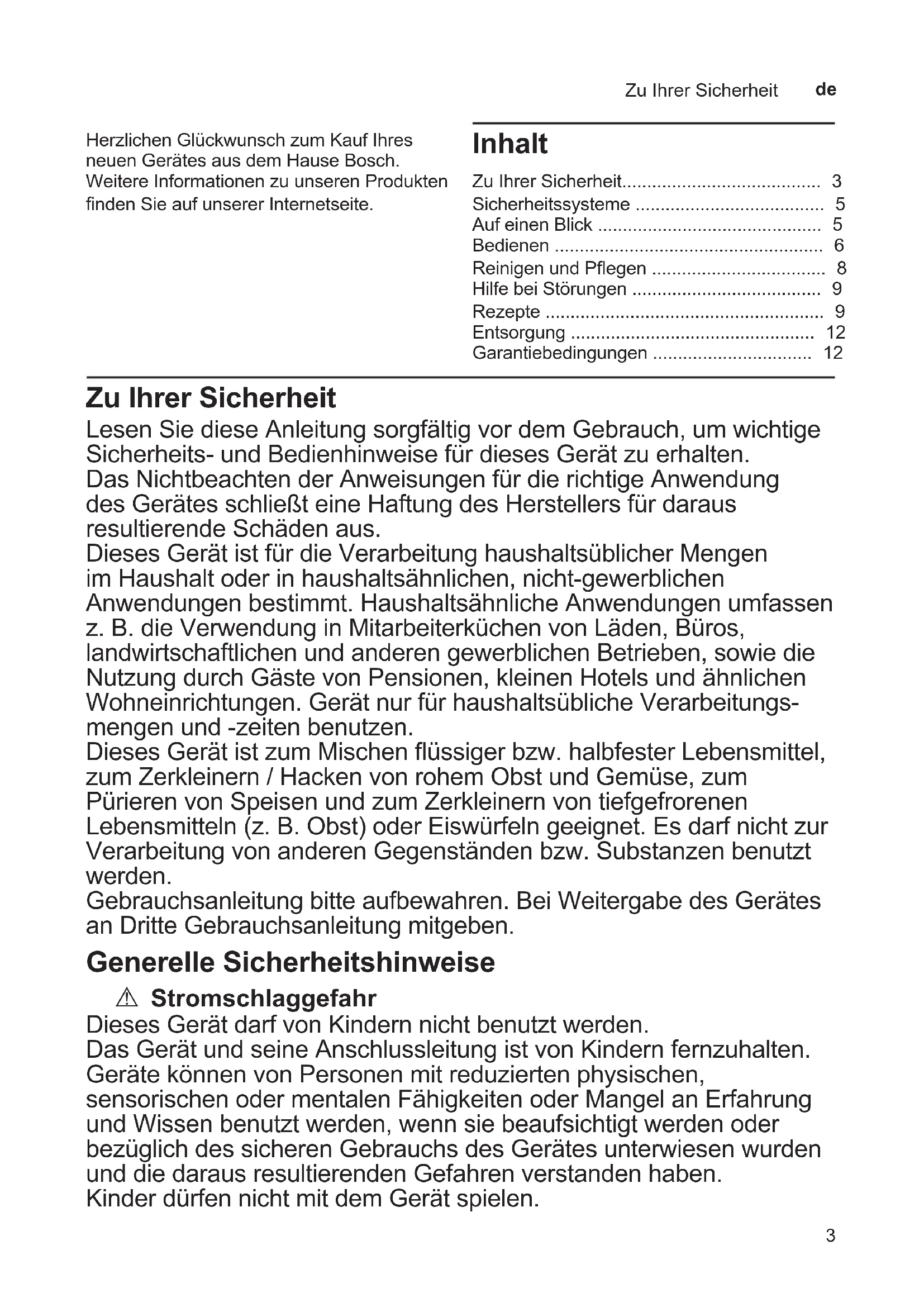 - Zu Ihrer Sicherheit LesenSiedieseAnleitungsorgfältigvordemGebrauch,umwichtige Sicherheits-undBedienhinweisefürdiesesGerätzuerhalten. DasNichtbeachtenderAnweisungenfürdierichtigeAnwendung desGerätesschließteineHaftungdesHerstellersfürdaraus resultierendeSchädenaus. DiesesGerätistfürdieVerarbeitunghaushaltsüblicherMengen imHaushaltoderinhaushaltsähnlichen,nicht-gewerblichen Anwendungenbestimmt.HaushaltsähnlicheAnwendungenumfassen z.B.dieVerwendunginMitarbeiterküchenvonLäden,Büros, landwirtschaftlichenundanderengewerblichenBetrieben,sowiedie NutzungdurchGästevonPensionen,kleinenHotelsundähnlichen Wohneinrichtungen.GerätnurfürhaushaltsüblicheVerarbeitungs- mengenund-zeitenbenutzen. DiesesGerätistzumMischenüssigerbzw.halbfesterLebensmittel, zumZerkleinern/HackenvonrohemObstundGemüse,zum PürierenvonSpeisenundzumZerkleinernvontiefgefrorenen Lebensmitteln(z.B.Obst)oderEiswürfelngeeignet.Esdarfnichtzur VerarbeitungvonanderenGegenständenbzw.Substanzenbenutzt werden. Gebrauchsanleitungbitteaufbewahren.BeiWeitergabedesGerätes anDritteGebrauchsanleitungmitgeben. Generelle Sicherheitshinweise A Stromschlaggefahr DiesesGerätdarfvonKindernnichtbenutztwerden. DasGerätundseineAnschlussleitungistvonKindernfernzuhalten. GerätekönnenvonPersonenmitreduziertenphysischen, sensorischenodermentalenFähigkeitenoderMangelanErfahrung undWissenbenutztwerden,wennsiebeaufsichtigtwerdenoder bezüglichdessicherenGebrauchsdesGerätesunterwiesenwurden unddiedarausresultierendenGefahrenverstandenhaben. KinderdürfennichtmitdemGerätspielen. HerzlichenGlückwunschzumKaufIhres neuenGerätesausdemHauseBosch. WeitereInformationenzuunserenProdukten ndenSieaufunsererInternetseite. Inhalt ZuIhrerSicherheit p. 3
