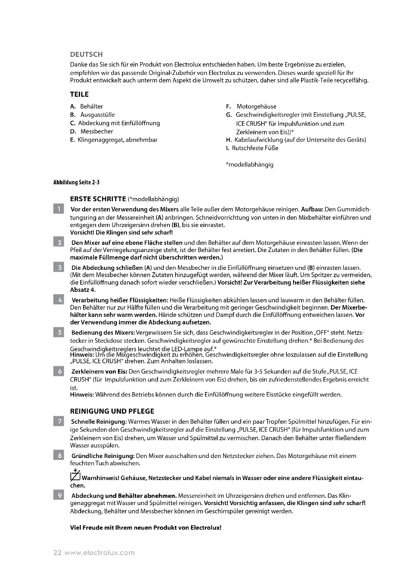 7 Schnelle Reinigung: Warmes Wasser in den Behälter füllen und ein paar Tropfen Spülmittel hinzufügen. Für ein- ige Sekunden den Geschwindigkeitsregler auf die Einstellung „PULSE, ICE CRUSH“ (für Impulsfunktion und zum Zerkleinern von Eis) drehen, um Wasser und Spülmittel zu vermischen. Danach den Behälter unter ießendem Wasser ausspülen. 8 Gründliche Reinigung: Den Mixer ausschalten und den Netzstecker ziehen. Das Motorgehäuse mit einem feuchten Tuch abwischen. Warnhinweis! Gehäuse, Netzstecker und Kabel niemals in Wasser oder eine andere Flüssigkeit eintau- chen. 9 Abdeckung und Behälter abnehmen. Messereinheit im Uhrzeigersinn drehen und entfernen. Das Klin- genaggregat mit Wasser und Spülmittel reinigen. Vorsicht! Vorsichtig anfassen, die Klingen sind sehr scharf! Abdeckung, Behälter und Messbecher können im Geschirrspüler gereinigt werden. Viel Freude mit Ihrem neuen Produkt von Electrolux!23www.electrolux.com