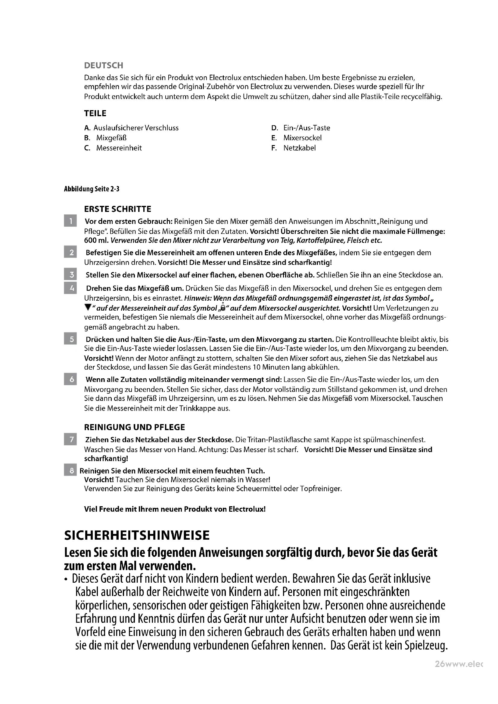 7 Ziehen Sie das Netzkabel aus der Steckdose. Die Tritan-Plastikasche samt Kappe ist spülmaschinenfest. Waschen Sie das Messer von Hand. Achtung: Das Messer ist scharf. Vorsicht! Die Messer und Einsätze sind scharfkantig! 8 Reinigen Sie den Mixersockel mit einem feuchten Tuch. Vorsicht! Tauchen Sie den Mixersockel niemals in Wasser! Verwenden Sie zur Reinigung des Geräts keine Scheuermittel oder Topfreiniger. Viel Freude mit Ihrem neuen Produkt von Electrolux! SICHERHEITSHINWEISE Lesen Sie sich die folgenden Anweisungen sorgfältig durch, bevor Sie das Gerät zum ersten Mal verwenden.