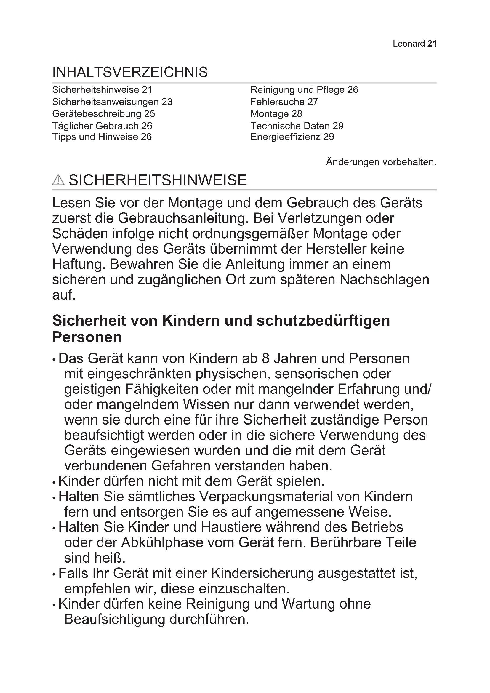 - Vous pouvez utiliser la chaleur résiduelle pour conserver les aliments au chaud ou pour faire fondre. EN MATIÈRE DE PROTECTION DE L'ENVIRONNEMENT Recyclez les matériaux portant le symbole . Déposez les emballages dans les conteneurs prévus à cet effet. Contribuez à la protection de l'environnement et à votre sécurité, recyclez vos produits électriques et électroniques. Ne jetez pas les appareils portant le symbole avec les ordures ménagères. Emmenez un tel produit dans votre centre local de recyclage ou contactez vos services municipaux. 20 LeonardINHALTSVERZEICHNIS Sicherheitshinweise 21 Sicherheitsanweisungen 23 Gerätebeschreibung 25 Täglicher Gebrauch 26 Tipps und Hinweise 26 Reinigung und Pflege 26 Fehlersuche 27 Montage 28 Technische Daten 29 Energieeffizienz 29 Änderungen vorbehalten. SICHERHEITSHINWEISE Lesen Sie vor der Montage und dem Gebrauch des Geräts zuerst die Gebrauchsanleitung. Bei Verletzungen oder Schäden infolge nicht ordnungsgemäßer Montage oder Verwendung des Geräts übernimmt der Hersteller keine Haftung. Bewahren Sie die Anleitung immer an einem sicheren und zugänglichen Ort zum späteren Nachschlagen auf. Sicherheit von Kindern und schutzbedürftigen Personen