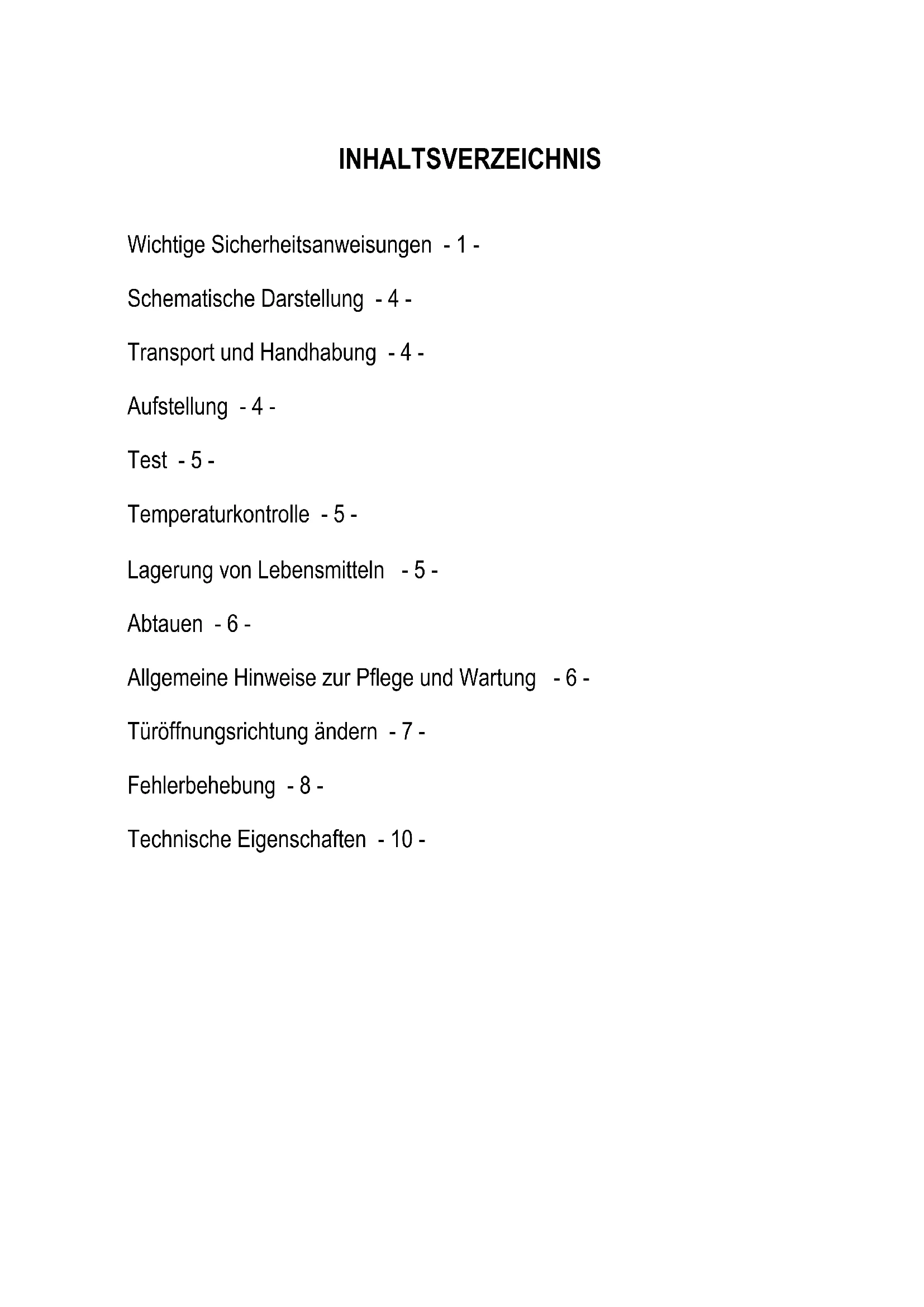 HFK-136AA;HFK-136AAB;HFK-136AASGefrierschrank BENUTZUNGSHINWEISE HFK-136AA HFK-136AAB HFK-136AASINHALTSVERZEICHNIS Wichtige Sicherheitsanweisungen - 1 - Schematische Darstellung - 4 - Transport und Handhabung - 4 - Aufstellung - 4 - Test - 5 - Temperaturkontrolle - 5 - Lagerung von Lebensmitteln - 5 - Abtauen - 6 - Allgemeine Hinweise zur Pege und Wartung - 6 - Türöffnungsrichtung ändern - 7 - Fehlerbehebung - 8 - Technische Eigenschaften - 10 -Dieses Gerät ist nur für den Gebrauch im Haushalt vorgesehen. Bitte lesen Sie sich diese Hinweise aufmerksam durch, bevor Sie das Gerät in Betrieb ne- hmen. Bewahren Sie diese Unterlagen für späteres Nachschlagen auf. WICHTIGE SICHERHEITSHINWEISE