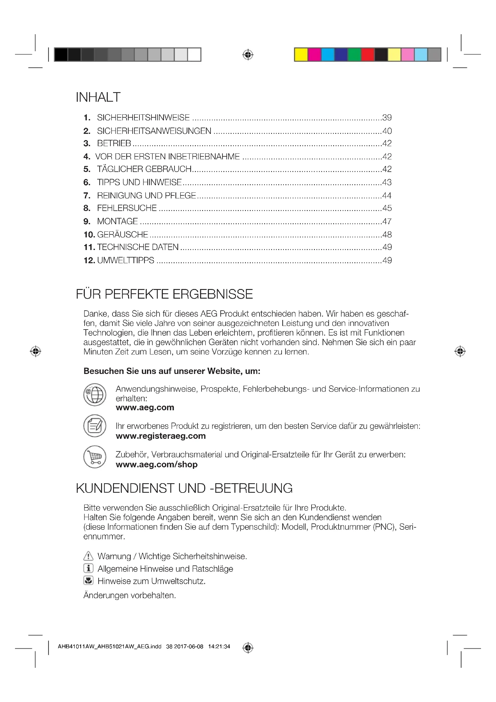 AHB41011AW_AHB51021AW_AEG.indd 38 2017-06-08 14:21:3439 DEUTSCH Lesen Sie vor der Montage und dem ersten Gebrauch des Geräts die mitgelieferte Anleitung sorgfältig durch. Der Hersteller übernimmt keine Verantwortung für Verletzungen und Beschädigungen durch unsachgemäße Montage. Bewahren Sie die Anleitung zusammen mit dem Gerät für den zukünftigen Gebrauch auf. Sicherheit von Kindern und hilfsbedürftigen Personen