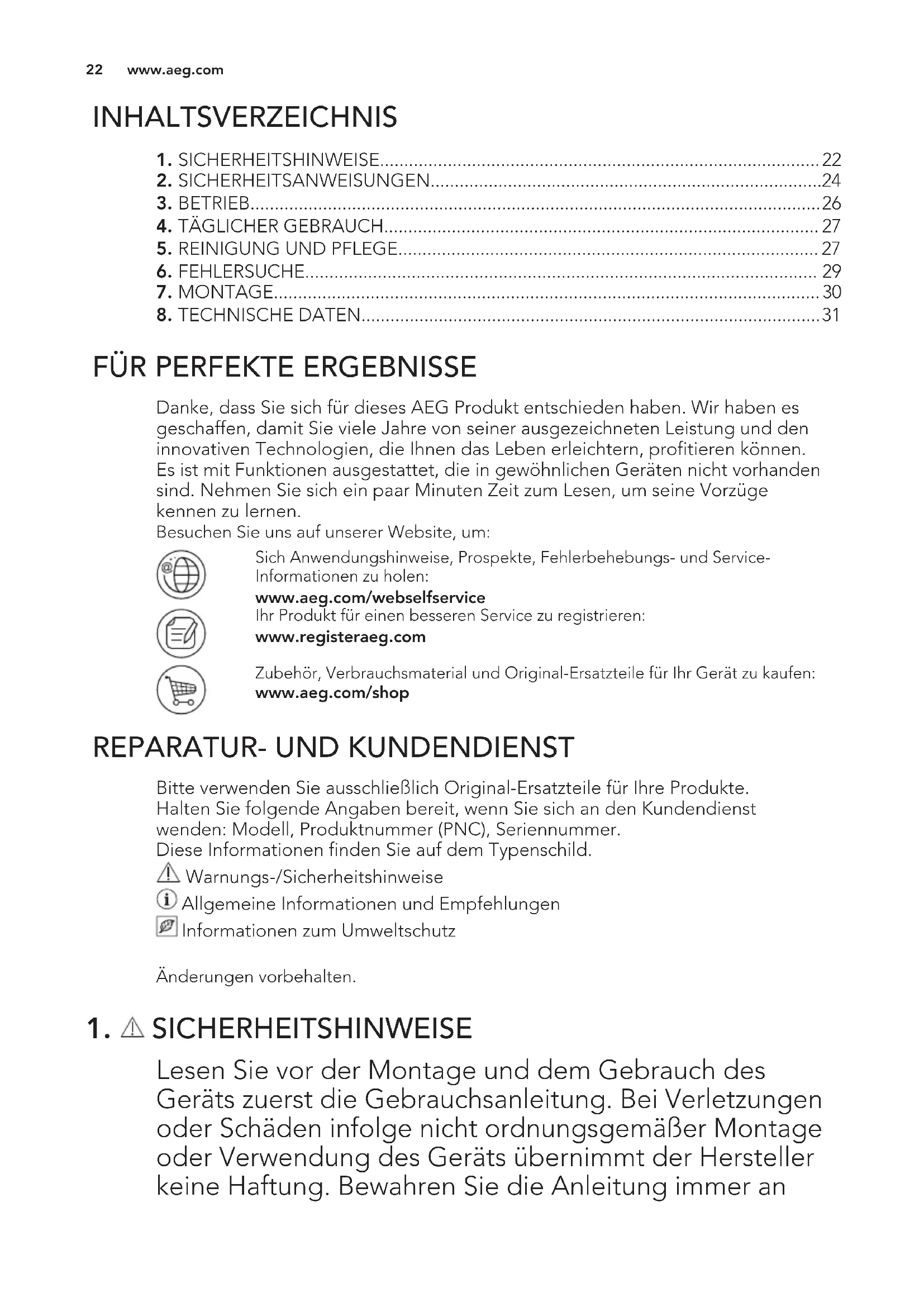 SICHERHEITSHINWEISE Lesen Sie vor der Montage und dem Gebrauch des Geräts zuerst die Gebrauchsanleitung. Bei Verletzungen oder Schäden infolge nicht ordnungsgemäßer Montage oder Verwendung des Geräts übernimmt der Hersteller keine Haftung. Bewahren Sie die Anleitung immer an www.aeg.com 22einem sicheren und zugänglichen Ort zum späteren Nachschlagen auf.