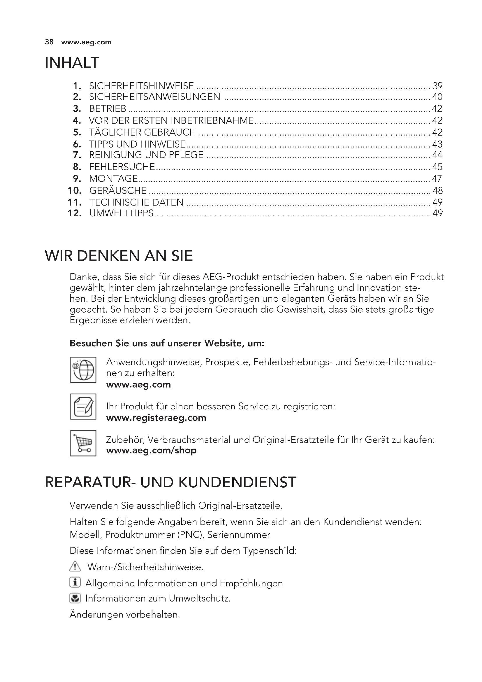 Danke, dass Sie sich für dieses AEG-Produkt entschieden haben. Sie haben ein Produkt gewählt, hinter dem jahrzehntelange professionelle Erfahrung und Innovation ste- hen. Bei der Entwicklung dieses großartigen und eleganten Geräts haben wir an Sie gedacht. So haben Sie bei jedem Gebrauch die Gewissheit, dass Sie stets großartige Ergebnisse erzielen werden. Besuchen Sie uns auf unserer Website, um: Anwendungshinweise, Prospekte, Fehlerbehebungs- und Service-Informatio- nen zu erhalten: www.aeg.com Ihr Produkt für einen besseren Service zu registrieren: www.registeraeg.com Zubehör, Verbrauchsmaterial und Original-Ersatzteile für Ihr Gerät zu kaufen: www.aeg.com/shop
