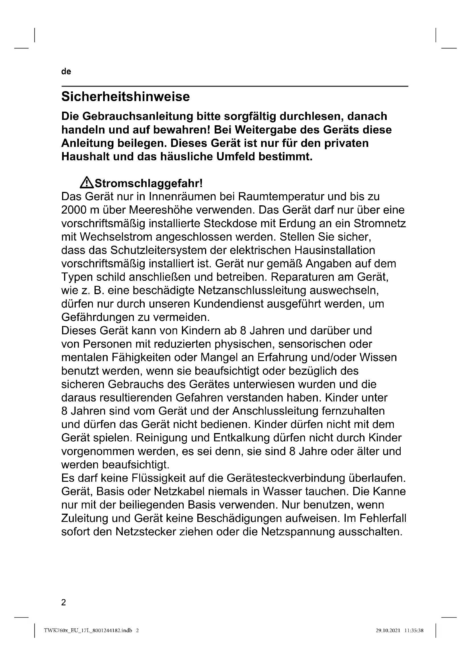 WARNUNG: Dieses Gerät nicht in der Nähe von Badewannen, Duschen, Waschbecken oder anderen Gefäßen benutzen, die Wasser enthalten. WErstickungsgefahr! Kinder nicht mit Verpackungsmaterial spielen lassen. WVerletzungsgefahr! Fehlanwendung des Gerätes kann zu Verletzungen führen. WAchtung! Reinigung von Oberächen, die mit Nahrungsmitteln in Berührung kommen! Die speziellen Hinweise zur Reinigung in der Anleitung sind zu beachten. TWK760x_EU_17L_8001244182.indb 2TWK760x_EU_17L_8001244182.indb 2 29.10.2021 11:35:3829.10.2021 11:35:383