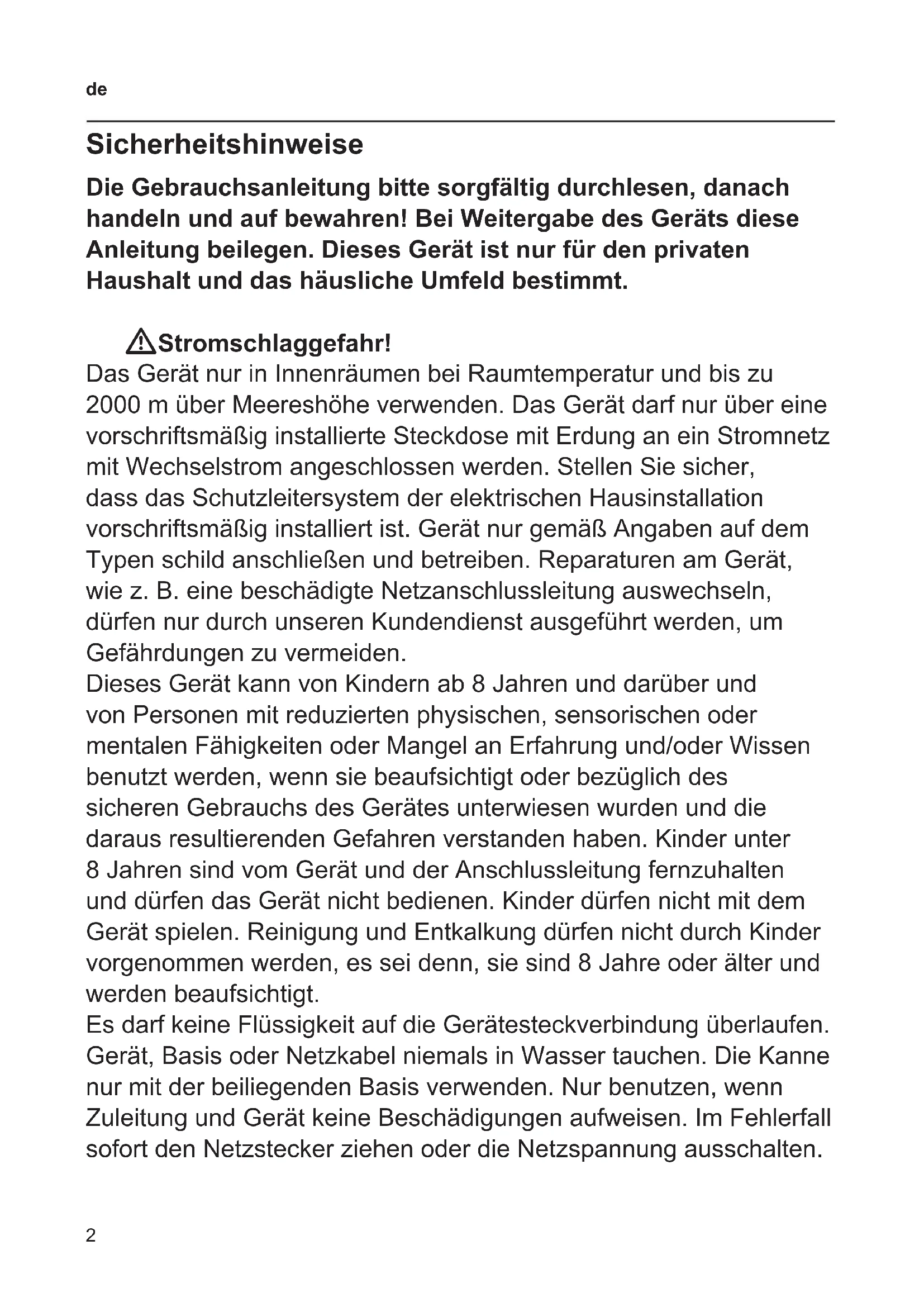 Sicherheitshinweise Die Gebrauchsanleitung bitte sorgfältig durchlesen, danach handeln und auf bewahren! Bei Weitergabe des Geräts diese Anleitung beilegen. Dieses Gerät ist nur für den privaten Haushalt und das häusliche Umfeld bestimmt. WStromschlaggefahr! Das Gerät nur in Innenräumen bei Raumtemperatur und bis zu 2000 m über Meereshöhe verwenden. Das Gerät darf nur über eine vorschriftsmäßig installierte Steckdose mit Erdung an ein Stromnetz mit Wechselstrom angeschlossen werden. Stellen Sie sicher, dass das Schutzleitersystem der elektrischen Hausinstallation vorschriftsmäßig installiert ist. Gerät nur gemäß Angaben auf dem Typen schild anschließen und betreiben. Reparaturen am Gerät, wie z. B. eine beschädigte Netzanschlussleitung auswechseln, dürfen nur durch unseren Kundendienst ausgeführt werden, um Gefährdungen zu vermeiden. Dieses Gerät kann von Kindern ab 8 Jahren und darüber und von Personen mit reduzierten physischen, sensorischen oder mentalen Fähigkeiten oder Mangel an Erfahrung und/oder Wissen benutzt werden, wenn sie beaufsichtigt oder bezüglich des sicheren Gebrauchs des Gerätes unterwiesen wurden und die daraus resultierenden Gefahren verstanden haben. Kinder unter 8 Jahren sind vom Gerät und der Anschlussleitung fernzuhalten und dürfen das Gerät nicht bedienen. Kinder dürfen nicht mit dem Gerät spielen. Reinigung und Entkalkung dürfen nicht durch Kinder vorgenommen werden, es sei denn, sie sind 8 Jahre oder älter und werden beaufsichtigt. Es darf keine Flüssigkeit auf die Gerätesteckverbindung überlaufen. Gerät, Basis oder Netzkabel niemals in Wasser tauchen. Die Kanne nur mit der beiliegenden Basis verwenden. Nur benutzen, wenn Zuleitung und Gerät keine Beschädigungen aufweisen. Im Fehlerfall sofort den Netzstecker ziehen oder die Netzspannung ausschalten.3