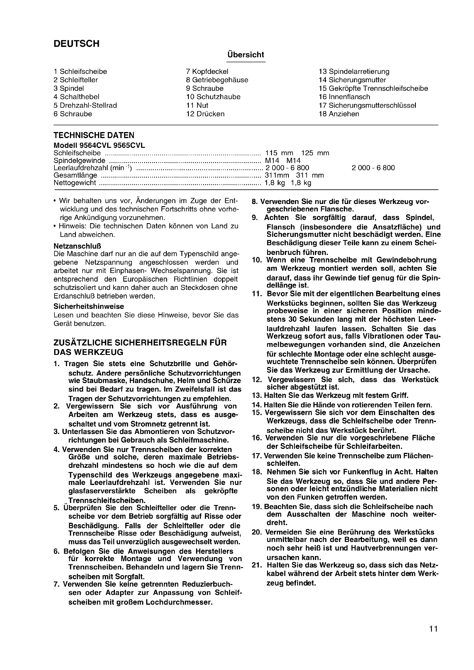 - Bei fortgesetztem Gebrauch einer abgenutzten Schleif- scheibe kann diese zerbersten und schwere Verletzun- gen verursachen. WARTUNG VORSICHT: Vor Arbeiten an der Maschine vergewissern Sie sich, daß sich der Schalter in der “OFF”-Position befindet und der Netzstecker gezogen ist. Reparatur und Wartung Das Werkzeug und seine Kühlluft-Ventilationsöffnungen müssen immer sauber gehalten werden. Falls Fremdkör- per (Staub usw.) in diese Öffnungen eindringen, müssen sie entfernt werden. Unterziehen Sie das Werkzeug einer regelmäßigen Reinigung, je nachdem, wieviel Staub erzeugt wurde und in das Werkzeug eingedrungen ist. Wenn die Kopfabdeckung an der Maschine angebracht ist, muss sie gemäß den Angaben unter “Entfernen der Kopfabdeckung” entfernt werden. Um die Sicherheit und Zuverlässigkeit dieses Gerätes zu gewährleisten, sollten Reparatur-, Wartungs-, und Eins- tellarbeiten nur von Makita autorisierten Werkstätten oder Kundendienstzentren unter ausschließlicher Verwendung von Makita-Originalersatzteilen ausgeführt werden.14 ITALIANO Visione generale 1 Disco abrasivo 2 Tampone 3 Alberino 4 Leva interruttore 5 Ghiera di regolazione velocità 6Vite 7 Coperchio testa 8 Alloggiamento ingranaggio 9Vite 10 Protezione disco 11 Tacca 12 Premere 13 Blocco albero 14 Controdado 15 Disco con centro depresso 16 Flangia interna 17 Chiave controdado 18 Per stringere DATI TECNICI Modello 9564CVL 9565CVL Disco abrasivo ............................................................................. 115 mm 125 mm Filettatura mandrino .................................................................... M14 M14 Velocità a vuoto (min