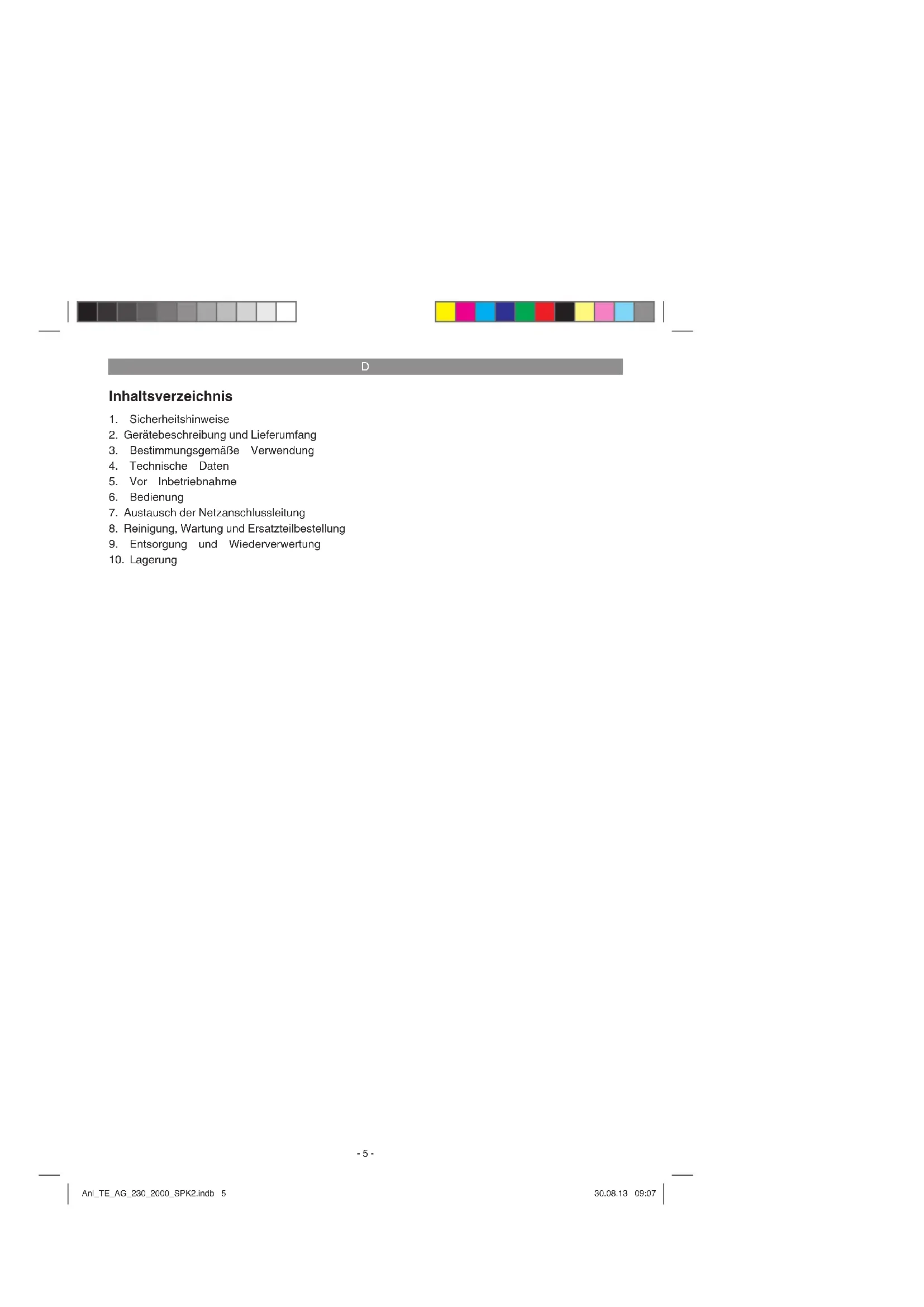Service Hotline kontaktieren oder bei iSC-Webadresse anmelden - es wird Ihnen eine Retourennummer zugeteilt l Ihre Anschrift eintragen Fehlerbeschreibung und Art.-Nr. und I.-Nr. angeben l Garantiefall JA/NEIN ankreuzen sowie Kaufbeleg-Nr. und Datum angeben und eine Kopie des Kaufbeleges beilegen Anl_TE_AG_230_2000_SPK2.indb 16Anl_TE_AG_230_2000_SPK2.indb 16 30.08.13 09:0730.08.13 09:07F