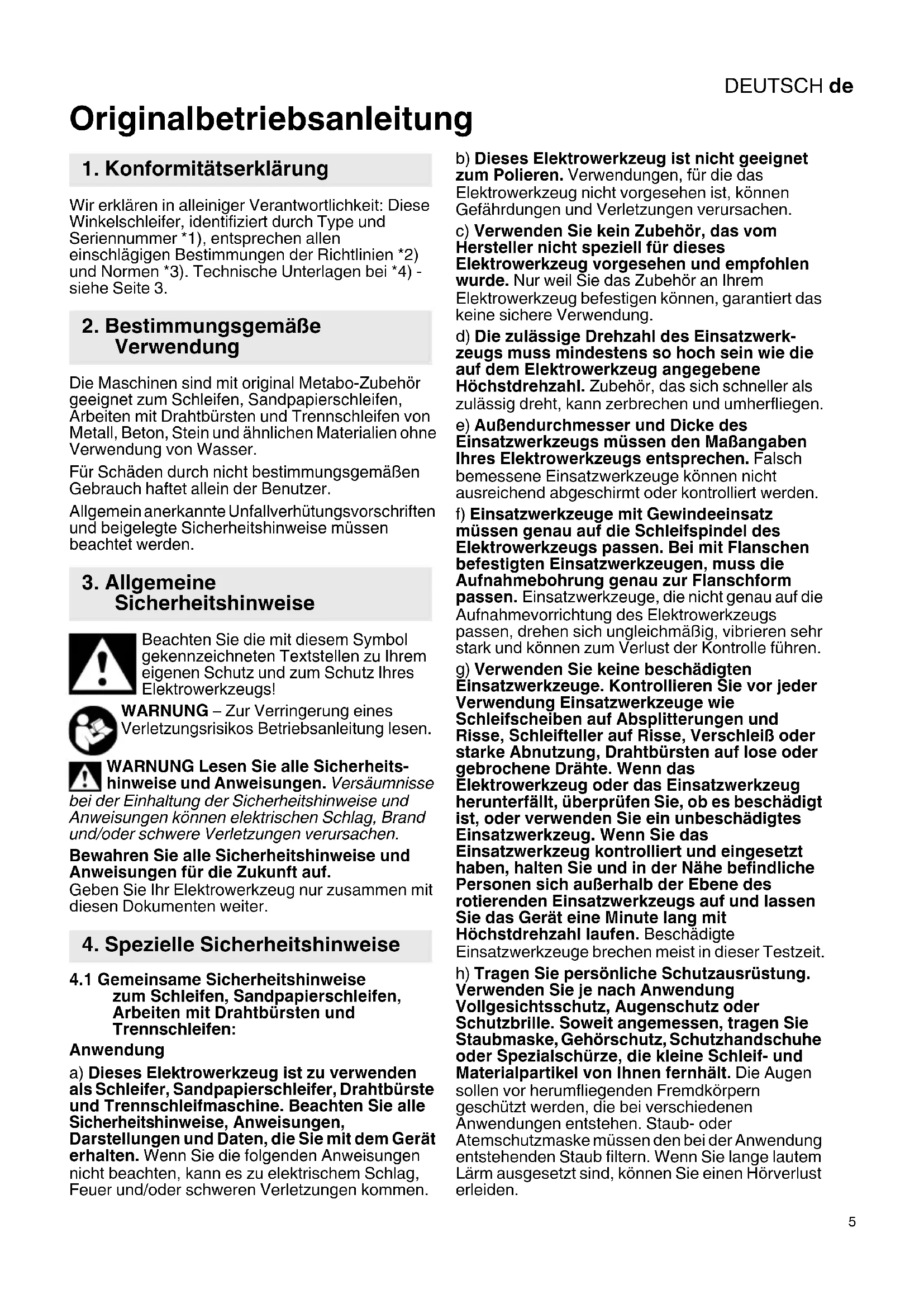 Originalbetriebsanleitung Wir erklären in alleiniger Verantwortlichkeit: Diese Winkelschleifer, identifiziert durch Type und Seriennummer *1), entsprechen allen einschlägigen Bestimmungen der Richtlinien *2) und Normen *3). Technische Unterlagen bei *4) - siehe Seite 3. Die Maschinen sind mit original Metabo-Zubehör geeignet zum Schleifen, Sandpapierschleifen, Arbeiten mit Drahtbürsten und Trennschleifen von Metall, Beton, Stein und ähnlichen Materialien ohne Verwendung von Wasser. Für Schäden durch nicht bestimmungsgemäßen Gebrauch haftet allein der Benutzer. Allgemein anerkannte Unfallverhütungsvorschriften und beigelegte Sicherheitshinweise müssen beachtet werden. Beachten Sie die mit diesem Symbol gekennzeichneten Textstellen zu Ihrem eigenen Schutz und zum Schutz Ihres Elektrowerkzeugs! WARNUNG – Zur Verringerung eines Verletzungsrisikos Betriebsanleitung lesen. WARNUNG Lesen Sie alle Sicherheits- hinweise und Anweisungen. Versäumnisse bei der Einhaltung der Sicherheitshinweise und Anweisungen können elektrischen Schlag, Brand und/oder schwere Verletzungen verursachen. Bewahren Sie alle Sicherheitshinweise und Anweisungen für die Zukunft auf. Geben Sie Ihr Elektrowerkzeug nur zusammen mit diesen Dokumenten weiter.