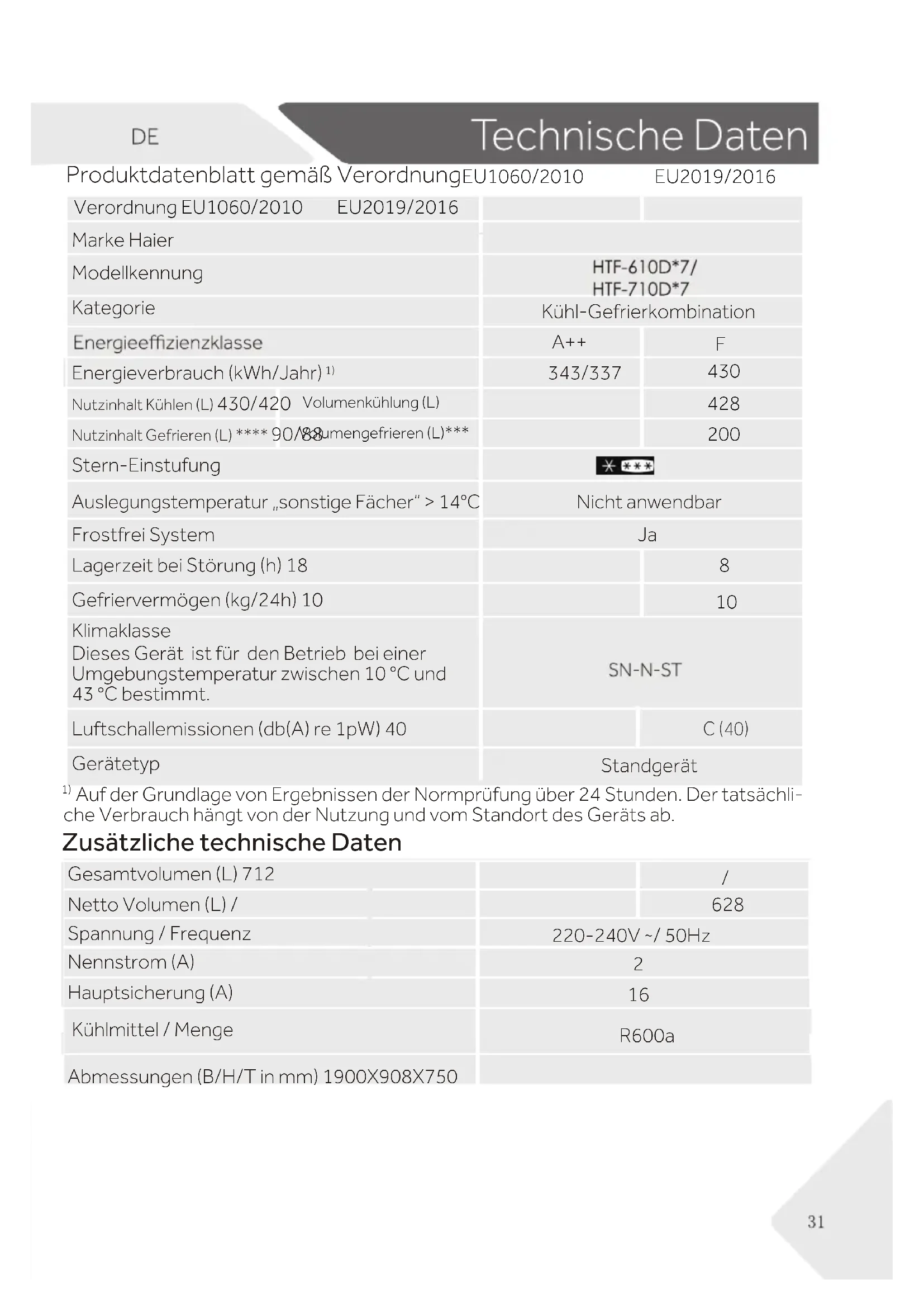 Auf der Grundlage von Ergebnissen der Normprüfung über 24 Stunden. Der tatsächli- che Verbrauch hängt von der Nutzung und vom Standort des Geräts ab. Zusätzliche technische Daten Marke Haier Modellkennung Kategorie Kühl-Gefrierkombination A++ Energieverbrauch (kWh/Jahr)