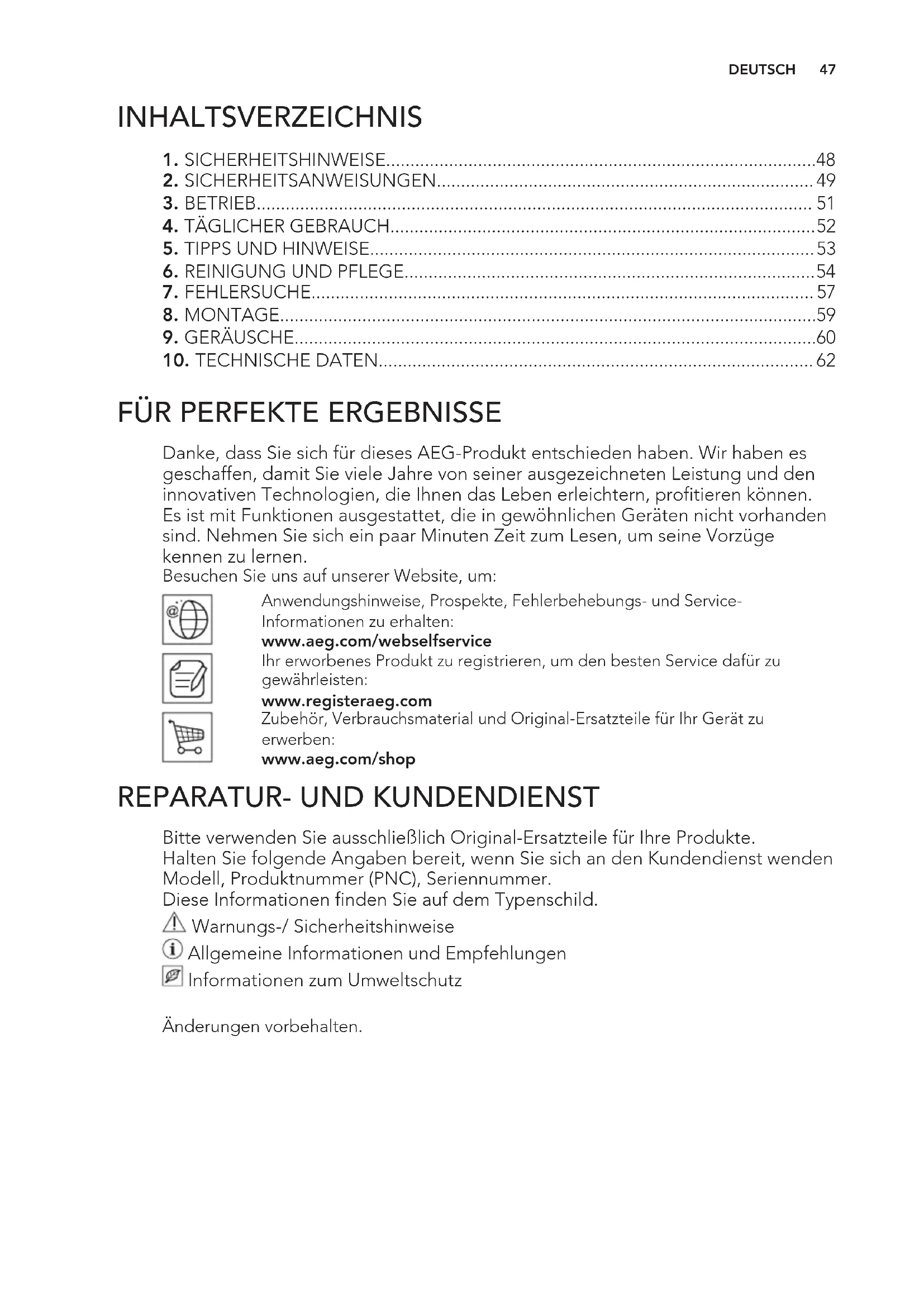 Danke, dass Sie sich für dieses AEG-Produkt entschieden haben. Wir haben es geschaffen, damit Sie viele Jahre von seiner ausgezeichneten Leistung und den innovativen Technologien, die Ihnen das Leben erleichtern, profitieren können. Es ist mit Funktionen ausgestattet, die in gewöhnlichen Geräten nicht vorhanden sind. Nehmen Sie sich ein paar Minuten Zeit zum Lesen, um seine Vorzüge kennen zu lernen. Besuchen Sie uns auf unserer Website, um: Anwendungshinweise, Prospekte, Fehlerbehebungs- und Service- Informationen zu erhalten: www.aeg.com/webselfservice Ihr erworbenes Produkt zu registrieren, um den besten Service dafür zu gewährleisten: www.registeraeg.com Zubehör, Verbrauchsmaterial und Original-Ersatzteile für Ihr Gerät zu erwerben: www.aeg.com/shop