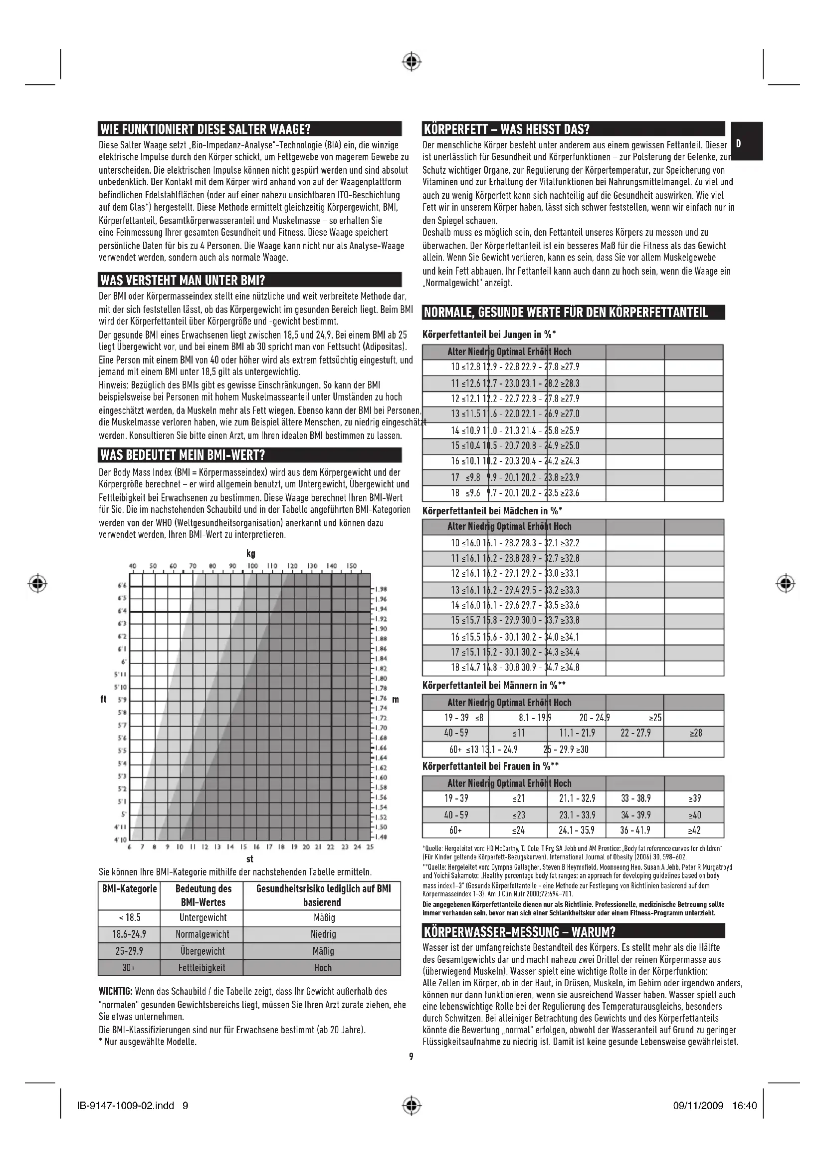 WIE FUNKTIONIERT DIESE SALTER WAAGE? Diese Salter Waage setzt „Bio-Impedanz-Analyse“-Technologie (BIA) ein, die winzige elektrische Impulse durch den Körper schickt, um Fettgewebe von magerem Gewebe zu unterscheiden. Die elektrischen Impulse können nicht gespürt werden und sind absolut unbedenklich. Der Kontakt mit dem Körper wird anhand von auf der Waagenplattform bendlichenEdelstahlächen(oderaufeinernahezuunsichtbarenITO-Beschichtung auf dem Glas*) hergestellt. Diese Methode ermittelt gleichzeitig Körpergewicht, BMI, Körperfettanteil, Gesamtkörperwasseranteil und Muskelmasse – so erhalten Sie eine Feinmessung Ihrer gesamten Gesundheit und Fitness. Diese Waage speichert persönliche Daten für bis zu 4 Personen. Die Waage kann nicht nur als Analyse-Waage verwendet werden, sondern auch als normale Waage. KÖRPERFETT – WAS HEISST DAS? Der menschliche Körper besteht unter anderem aus einem gewissen Fettanteil. Dieser ist unerlässlich für Gesundheit und Körperfunktionen – zur Polsterung der Gelenke, zum Schutz wichtiger Organe, zur Regulierung der Körpertemperatur, zur Speicherung von Vitaminen und zur Erhaltung der Vitalfunktionen bei Nahrungsmittelmangel. Zu viel und auch zu wenig Körperfett kann sich nachteilig auf die Gesundheit auswirken. Wie viel Fett wir in unserem Körper haben, lässt sich schwer feststellen, wenn wir einfach nur in den Spiegel schauen. Deshalb muss es möglich sein, den Fettanteil unseres Körpers zu messen und zu überwachen. Der Körperfettanteil ist ein besseres Maß für die Fitness als das Gewicht allein. Wenn Sie Gewicht verlieren, kann es sein, dass Sie vor allem Muskelgewebe und kein Fett abbauen. Ihr Fettanteil kann auch dann zu hoch sein, wenn die Waage ein „Normalgewicht“ anzeigt. KÖRPERWASSER-MESSUNG – WARUM? Wasser ist der umfangreichste Bestandteil des Körpers. Es stellt mehr als die Hälfte des Gesamtgewichts dar und macht nahezu zwei Drittel der reinen Körpermasse aus (überwiegend Muskeln). Wasser spielt eine wichtige Rolle in der Körperfunktion: Alle Zellen im Körper, ob in der Haut, in Drüsen, Muskeln, im Gehirn oder irgendwo anders, können nur dann funktionieren, wenn sie ausreichend Wasser haben. Wasser spielt auch eine lebenswichtige Rolle bei der Regulierung des Temperaturausgleichs, besonders durch Schwitzen. Bei alleiniger Betrachtung des Gewichts und des Körperfettanteils könnte die Bewertung „normal“ erfolgen, obwohl der Wasseranteil auf Grund zu geringer Flüssigkeitsaufnahme zu niedrig ist. Damit ist keine gesunde Lebensweise gewährleistet. NORMALE, GESUNDE WERTE FÜR DEN KÖRPERFETTANTEIL Körperfettanteil bei Jungen in %* Alter Niedrig Optimal Erhöht Hoch 10 ≤12.8 12.9 - 22.8 22.9 - 27.8 ≥27.9 11 ≤12.6 12.7 - 23.0 23.1 - 28.2 ≥28.3 12 ≤12.1 12.2 - 22.7 22.8 - 27.8 ≥27.9 13 ≤11.5 11.6 - 22.0 22.1 - 26.9 ≥27.0 14 ≤10.9 11.0 - 21.3 21.4 - 25.8 ≥25.9 15 ≤10.4 10.5 - 20.7 20.8 - 24.9 ≥25.0 16 ≤10.1 10.2 - 20.3 20.4 - 24.2 ≥24.3 17 ≤9.8 9.9 - 20.1 20.2 - 23.8 ≥23.9 18 ≤9.6 9.7 - 20.1 20.2 - 23.5 ≥23.6 Körperfettanteil bei Mädchen in %* Alter Niedrig Optimal Erhöht Hoch 10 ≤16.0 16.1 - 28.2 28.3 - 32.1 ≥32.2 11 ≤16.1 16.2 - 28.8 28.9 - 32.7 ≥32.8 12 ≤16.1 16.2 - 29.1 29.2 - 33.0 ≥33.1 13 ≤16.1 16.2 - 29.4 29.5 - 33.2 ≥33.3 14 ≤16.0 16.1 - 29.6 29.7 - 33.5 ≥33.6 15 ≤15.7 15.8 - 29.9 30.0 - 33.7 ≥33.8 16 ≤15.5 15.6 - 30.1 30.2 - 34.0 ≥34.1 17 ≤15.1 15.2 - 30.1 30.2 - 34.3 ≥34.4 18 ≤14.7 14.8 - 30.8 30.9 - 34.7 ≥34.8 Körperfettanteil bei Männern in %** Alter Niedrig Optimal Erhöht Hoch