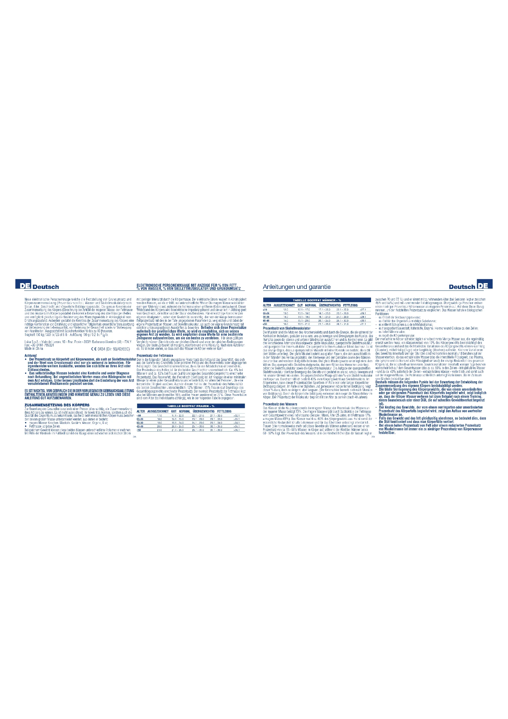 - Fettmasse:adipöseZellen. Bei gleichem Gewicht können diese beiden Massen unterschiedliche Volumen einnehmen. Mit Hilfe der Elektrode im Fußbrett sendet die Waage einen schwachen elektrischen Strom mit geringer Intensität durch die Körpermasse. Der elektrische Strom reagiert in Abhängigkeit von den Massen, auf die er trifft, auf unterschiedliche Weise: Die magere Masse weist einen geringen Widerstand auf, während die Fettmasse einen größeren Widerstand aufweist. Dieser Widerstand des Körpers wird bioelektrische Impedanz genannt und sie variiert in Abhängigkeit vom Geschlecht, dem Alter und der Statur des Benutzers. Für eine richtige Kontrolle vom eigenen Idealgewicht, neben dem Gewicht ist es wichtig, den von der Waage bemessenen Fettprozentsatz mit den in der Tafel angegebenen Parametern zu vergleichen und dabei der eigene Prozentsatz an Wasser und Skelettmuskulatur, als auch der eigene Grundumsatz mit den hier unten angegebenen Auskünften zu bewerten. BefindensichdieseProzentsätze außerhalbdergewöhnlichenWerte,sowirdesempfohlen,sichanseinen eigenenArztzuwenden.EswirdempfohlendieseWertefüreinebestimmte Zeitspanneaufzuschreiben,umsieambestenzuverstehen. Für einen gültigen Vergleich müssen Sie sich stets zur gleichen Uhrzeit und unter den gleichen Bedingungen wiegen. Der beste Zeitpunkt ist morgens, nüchtern und ohne Kleidung. Nach dem Aufstehen ca. 15 Minuten warten, so dass sich das Wasser im Körper verteilen kann. ProzentsatzderFettmasse Der in der folgenden Tabelle angegebene Prozentsatz des Fettes ist das Gesamtfett, das sich aus der Summe des Grundfetts (oder primären Fetts) und des Reservefetts (oder abgelagerten Fetts) ergibt. Das Grundfett ist unverzichtbar, da es für den Metabolismus erforderlich ist. Der Prozentsatz des Fettes ist für die beiden Geschlechter unterschiedlich: Ca. 4% bei Männern und ca. 12% bei Frauen (auf Grundlage des Gesamtkörpergewichts errechneter Prozentsatz). Das Reservefett, das theoretisch überflüssig ist, ist hingegen in einer minimalen Menge für einen guten Gesundheitszustand erforderlich, vor allem bei Personen, die eine körperliche Tätigkeit ausüben. Auch in diesem Fall ist der Prozentsatz des Fettes ist für die beiden Geschlechter unterschiedlich: 12% Männer, 15% Frauen (auf Grundlage des Gesamtkörpergewichts errechneter Prozentsatz). Der normale Prozentsatz der Fettmasse liegt also bei Männern annährend bei 16% und bei Frauen annährend bei 27%. Diese Prozentsätze sind vom Alter des Individuums abhängig, wie in der folgenden Tabelle angegeben. ProzentsatzvonSkelettmuskulatur Die Muskeln sind die Motoren des Knochenskeletts und durch die Energie, die sie während der Kontraktion freisetzen, gestatten sie es uns, uns zu bewegen und Bewegungen des Kopfes, des Rumpfes sowie der oberen und unteren Gliedmaßen auszuführen und zu kontrollieren. Es gibt drei verschiedene Arten von Muskelgewebe: glatte Muskulatur, quergestreifte Skelettmuskulatur und quergestreiften Herzmuskulatur. Die quergestreifte Herzmuskulatur bildet das Herz. Es ist das einzige Organ, das aus quergestreiften Muskeln mit einer Kontraktion besteht, die nicht dem Willen unterliegt. Der glatte Muskel besteht aus glatten Fasern, die sich ausschließlich in den Wänden des Verdauungstrakts, der Atemwege und der Genitalien sowie den Wänden der arteriöse und venösen Blutgefäße befinden. Das glatte Muskelgewebe unterliegt nicht dem Willen. Das quergestreifte Skelettmuskelgewebe, das dem Willen des Menschen unterliegt, bildet die Skelettmuskulatur sowie die Gesichtsmuskulatur. Die Aufgabe der quergestreiften Skelettmuskulatur dient zur Bewegung des Skeletts und gestattet es uns so, uns zu bewegen und mit unserer Umwelt mitzuteilen. Die gegenständliche Waage gibt den % von Skelettmuskulatur im Körper an. Durchschnittlich besteht 40% vom Körpergewicht aus Skelettmuskeln. Im Allgemeinen, kann dieser Prozentsatz bei Sportlern im Falle von sehr langer körperlicher Betätigung steigern. Im Falle einer täglichen und gemessenen körperlichen Betätigung neigt dieser % dazu, doch zu steigern, aber langsam. (Der Unterschied bemerkt sich nach Monaten von Betätigung). Durch die körperliche Betätigung verbessert sich sogar die Wasserbilanz im Körper. Der Prozentsatz der Muskulatur beginnt mit der Alter zu senken (nach 40 Jahren). ProzentsatzdesWassers Das Wasser ist die Hauptkomponente der mageren Masse; der Prozentsatz des Wassers an der mageren Masse beträgt 73%. Die magere Masse ergibt durch Subtraktion der Fettmasse vom Gesamtgewicht eines Individuums (Beispiel: Mann, Alter 25 Jahre, mit Fettmasse 17% = magere Masse 83%). Das Wasser macht ca. 60% des Körpergewichts aus: Es ist somit der wesentliche Bestandteil für alle Lebewesen und für das Überleben unbedingt erforderlich. Frauen (die normalerweise mehr adipöses Gewebe als Männer aufweisen) weisen einen Prozentsatz von ca. 55 -58% Wasser im Körper auf, während der Wert bei Männer bei ca.