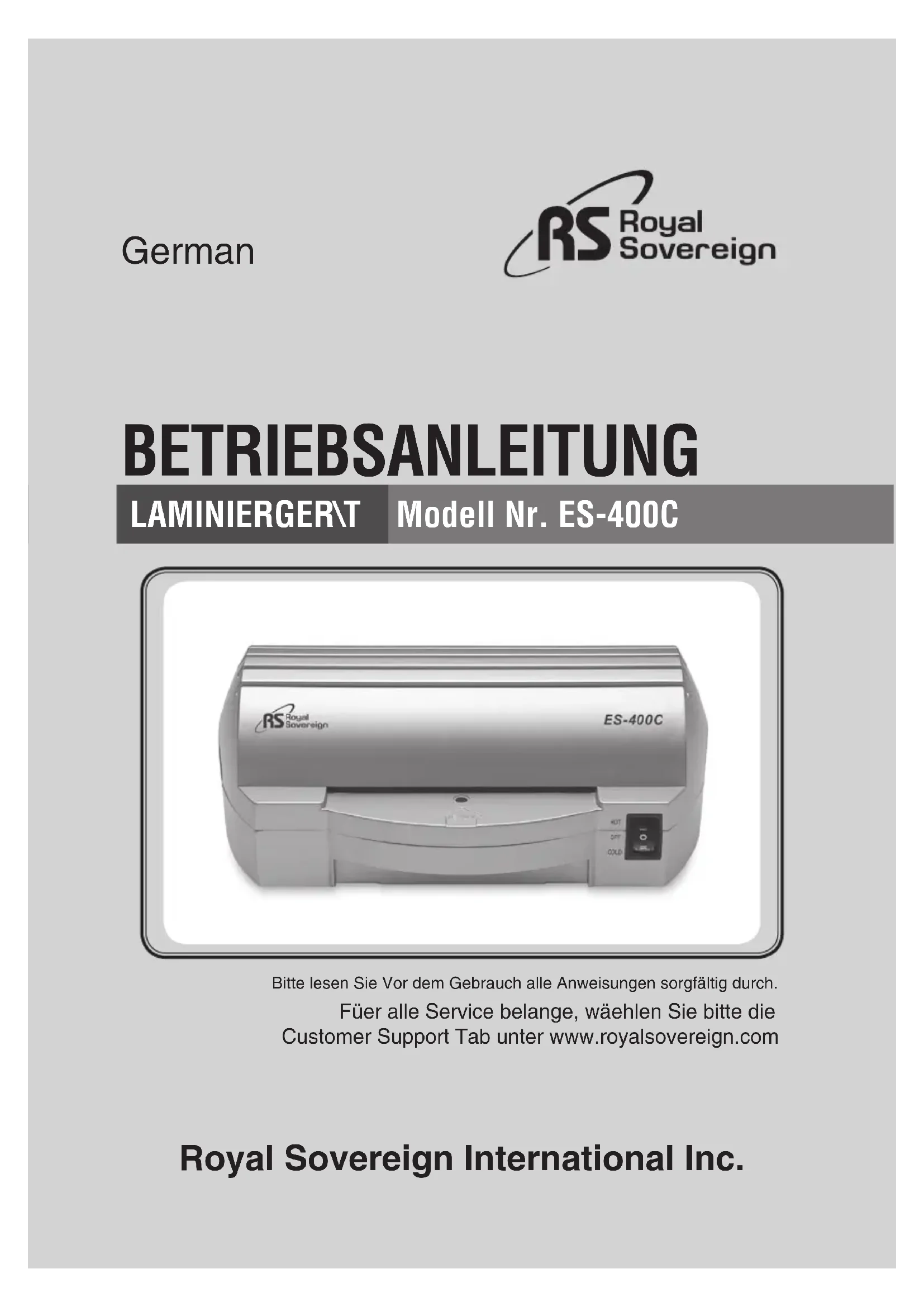 E-mail : info@royalsovereign.comLAMINIERGER\T Modell Nr. ES-400C BETRIEBSANLEITUNG Royal Sovereign International Inc. German Bitte lesen Sie Vor dem Gebrauch alle Anweisungen sorgfältig durch. Füer alle Service belange, wäehlen Sie bitte die Customer Support Tab unter www.royalsovereign.comHAUPTKOMPONENTEN 27