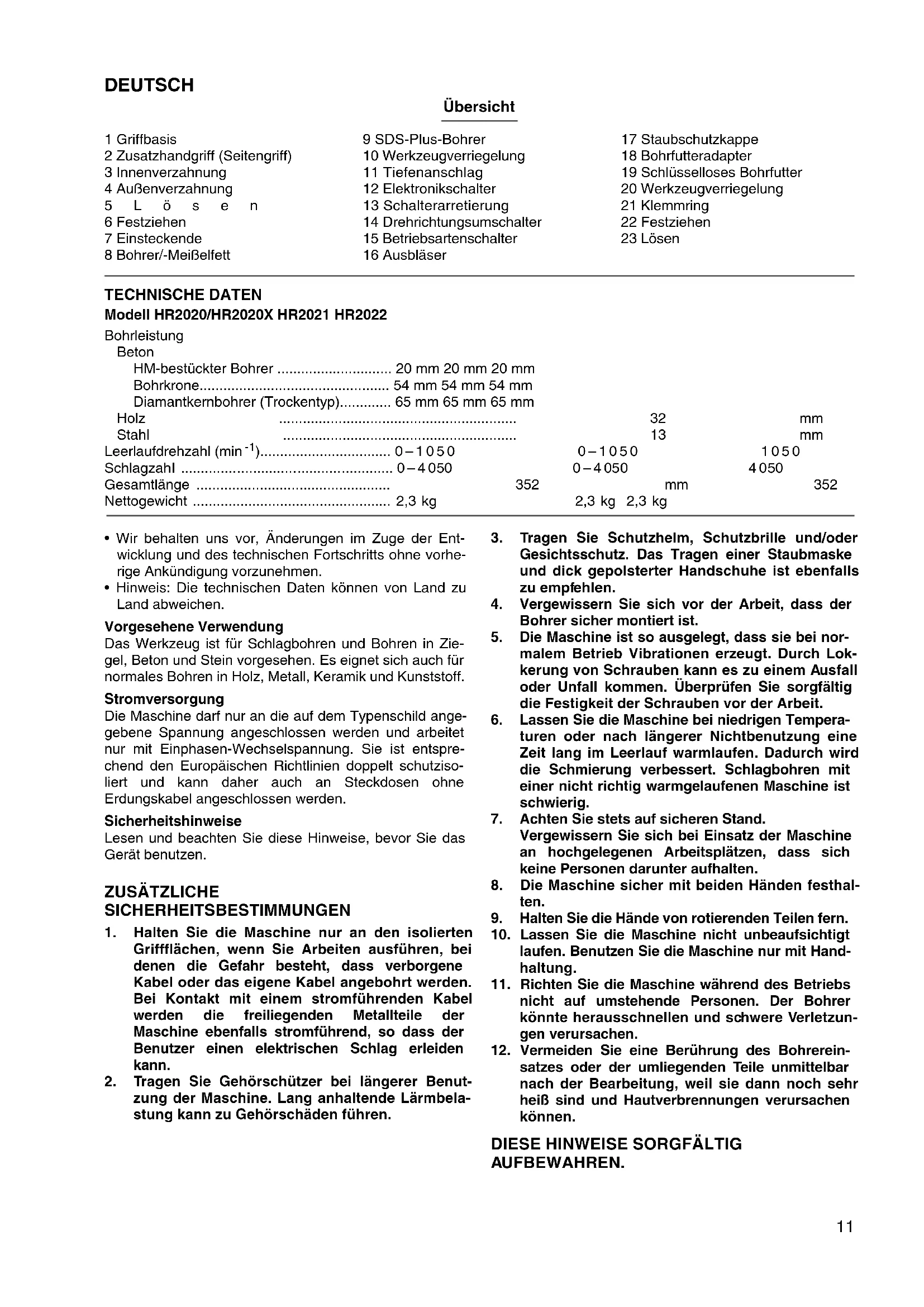 - Lochsägen sind für den Einsatz in dieser Maschine nicht geeignet, da diese Einsatzwerkzeuge zu hohe Drehmomente abverlangen. Betrieb: Hammerbohren Den Bohrer erst an die gewünschte Position setzen und den Bohrvorgang dann durch Drücken des Elektronik- schalters beginnen. Das Gerät im rechten Winkel zur Werkstückoberfläche sicher führen, um ein Abrutschen des Bohrers zu verhin- dern. Während des Bohrbetriebs nur den erforderlichen Gegendruck halten, der unmittelbar der Schlagenergie des Gerätes entgegenwirkt. Sollte die Bohrmehlabfuhr (z. B. durch feuchtes Gestein) gestört sein, ziehen Sie den Bohrer aus der Bohrung heraus und entfernen Sie das Bohrmehl aus der Bohrung bzw. den Spiralnuten des Bohrers. VORSICHT: Beim Bohren in eisenbewehrtem Beton kann der Bohrer blockieren und so die Rutschkupplung der Maschine aus- lösen. Achten Sie daher auf sicheren Stand und benut- zen Sie immer den Seitengriff, um die hohen Rückdrehmomente aufzufangen.13 Schmierung der Einsatzwerkzeuge Den Aufnahmeschaft vor dem Einsetzen in das Gerät säubern und anschließend mit Bohrerfett schmieren (ca. 0,5 – 1,0 g). Dies gewährleistet eine einwandfreie Funktion der Werk- zeugaufnahme und einen minimalen Verschleiß des Auf- nahmeschaftes. Ausbläser (Abb. 9) Verwenden Sie den Ausbläser, um das Bohrloch von Spänen und Partikeln zu säubern. Staubschutzkappe (Abb. 10) Bei Überkopfarbeiten die Staubschutzkappe verwenden, um zu verhindern, daß Staub auf den Bedienenden und die Werkzeugaufnahme fällt. Die Staubschutzkappe, wie in Abb. 10 gezeigt, auf dem Bohrer befestigen. Die Staubschutzkappe kann für folgende Bohrergrößen ver- wendet werden. Bohren in Holz oder Metall (Abb. 11 und 12) Verwenden Sie den gesonderten Bohrfuttersatz (Stan- dardausstattung für Modell HR2020X). Nehmen Sie zur Montage auf den Abschnitt “Montage und Demontage des Bohrers” auf der vorhergehenden Seite Bezug. Halten Sie den Klemmring fest und drehen Sie die Werk- zeugverriegelung entgegen dem Uhrzeigersinn, um die Bohrfutterbacken zu öffnen. Führen Sie das Einsatzwerk- zeug bis zum Anschlag in das Spannfutter ein. Halten Sie den Klemmring fest und drehen Sie die Werkzeug- verriegelung im Uhrzeigersinn, um das Bohrfutter festzu- ziehen. Zum Entfernen des Einsatzwerkzeugs halten Sie den Klemmring und drehen die Werkzeugverriegelung entge- gen dem Uhrzeigersinn. Stellen Sie den Betriebsarten- schalter auf die Position “Bohren”. Sie können Löcher von bis zu 13 mm Durchmesser in Metall und von bis zu 32 mm Durchmesser in Holz bohren. VORSICHT: