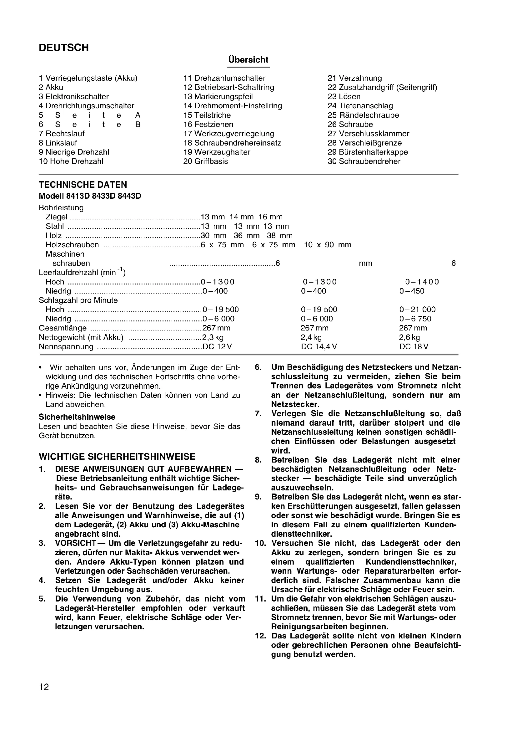 - Wenn die Maschine im Dauerbetrieb verwendet wird, und der Akku vollständig entladen wurde, lassen Sie die Maschine vor Verwendung eines geladenen Akkus 15 min abkühlen. Schlagbohrbetrieb Drehen Sie zunächst den Betriebsart-Schaltring, bis das Symbol X des Schaltrings auf den Markierungspfeil des Maschinengehäuses zeigt. Der Drehmoment-Ein- stellring kann für diese Anwendung auf eine beliebige Drehmomentstufe eingestellt werden. Setzen Sie den Bohrer auf die gewünschte Bohrstelle und drücken Sie den Elektronikschlter. Üben Sie keinen übermäßigen Druck auf die Maschine aus. Leichter Anpressdruck liefert die besten Ergebnisse. Halten Sie die Maschine rechtwinklig zum Bohrloch, damit der Boh- rer nicht abrutscht. Üben Sie keinen stärkeren Druck aus, wenn das Bohrloch durch Späne oder Bohrmehl zuge- setzt wird. Lassen Sie die Maschine eingeschaltet, und ziehen Sie den Bohrer teilweise aus dem Bohrloch her- aus. Durch mehrmaliges Wiederholen dieses Vorgangs wird das Bohrloch ausgeräumt, so dass der normale Bohrbetrieb fortgesetzt werden kann. VORSICHT: Beim Durchbruch der Bohrung durch das Werkstück, bei Verstopfung der Bohrung durch Späne und Bohrmehl, oder beim Auftreffen auf Betonstahl wirkt ein starkes, plötzlich auftretendes Rückdrehmoment auf Maschine und Bohrer. Montieren Sie stets den Zusatzhandgriff (Seitengriff), und halten Sie die Maschine während der Arbeit mit beiden Händen am Zusatzhandgriff und Schal- tergriff fest. Eine Missachtung dieser Vorsichtsmaß- nahme kann den Verlust der Kontrolle über die Maschine und mögliche schwere Verletzungen zur Folge haben. Ausbläser (Abb. 12) Verwenden Sie den Ausbläser zum Ausblasen der Boh- rung. Anbringen der Verschlussklammer (Abb. 13) Für 8413D Montieren Sie stets die Verschlussklammer bei Verwen- dung der Akkus 1200, 1202 oder 1202A. Befestigen Sie die Verschlussklammer mit der mitgelieferten Schraube an der Maschine. WARTUNG VORSICHT: Vor Arbeiten am Gerät vergewissern Sie sich, dass sich der Schalter in der “OFF”- Position befindet und der Akku aus dem Gerät entfernt ist. Kohlebürsten wechseln (Abb. 14 u. 15) Kohlebürsten ersetzen, wenn sie bis auf die Verschleiß- grenze abgenutzt sind. Kohlebürsten nur paarweise ersetzen. Um die Sicherheit und Zuverlässigkeit dieses Gerätes zu gewährleisten, sollten Reparatur-, Wartungs-, und Ein- stellarbeiten nur von durch Makita autorisierten Werk- stätten oder Kundendienstzentren unter ausschließlicher Verwendung von Makita-Originalersatzteilen ausgeführt werden. Nenndurchmesser der Holzschraube (mm) Empfohlene Größe der Vorbohrung (mm) 3,1 2,0 – 2,2 3,5 2,2 – 2,5 3,8 2,5 – 2,8 4,5 2,9 – 3,2 4,8 3,1 – 3,4 5,1 3,3 – 3,6 5,5 3,6 – 3,9 5,8 4,0 – 4,2 6,1 4,2 – 4,416 ITALIANO Visione generale 1Bottone 2 Cartuccia batteria 3 Interruttore 4 Leva interruttore di inversione 5Lato A 6Lato B 7 Senso orario 8 Senso antiorario 9 Velocità bassa 10 Velocità alta 11 Leva di cambio velocità 12 Anello di cambio modo di funzionamento 13 Freccia 14 Anello di registro 15 Graduazioni 16 Per stringere 17 Manicotto 18 Punta 19 Portapunta 20 Base manico 21 Denti 22 Manico laterale 23 Per allentare 24 Asta di profondità 25 Vite con testa ad alette 26 Vite 27 Piastrina di fissaggio 28 Segno limite 29 Tappo portaspazzole 30 Cavviavite DATI TECNICI Modello 8413D 8433D 8443D Capacità Calcestruzzo ................................................13 mm 14 mm 16 mm Acciaio .........................................................13 mm 13 mm 13 mm Legno ..........................................................30 mm 36 mm 38 mm Vite per legno ..............................................6 x 75 mm 6 x 75 mm 10 x 90 mm Vite comune ................................................6 mm 6 mm 6 mm Velocità a vuoto (min