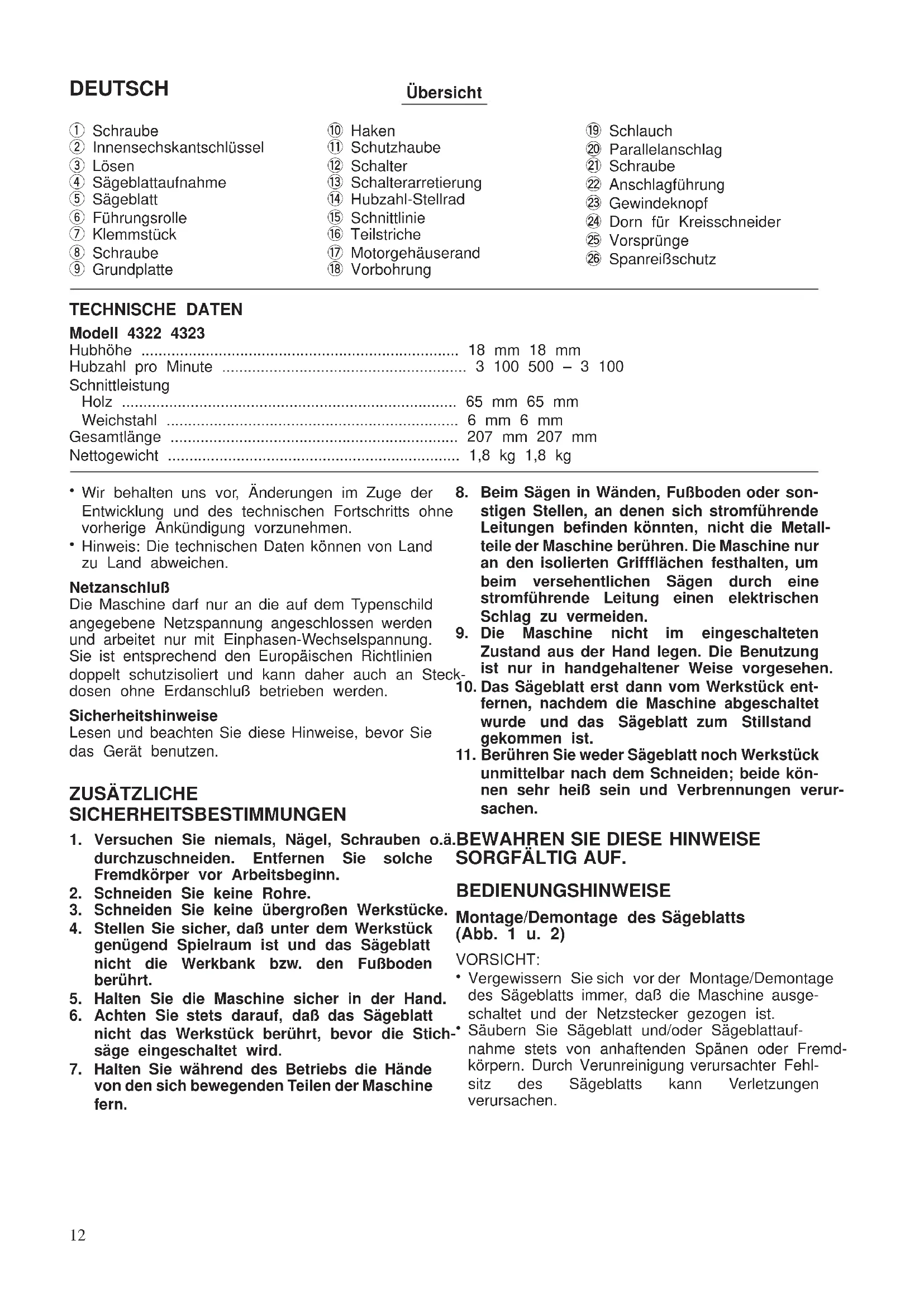 4322/4323 (G) (’99. 8. 6)Lösen Sie zur Montage des Sägeblatts die Innen- sechskantschraube an der Sägeblattaufnahme. Set- zen Sie das Sägeblatt mit nach vorn zeigenden Zähnen bis zum Anschlag in die Sägeblattaufnahme ein. Achten Sie darauf, daß die Hinterkante des Sägeblatts in der Mitte der Führungsrolle sitzt. Ziehen Sie dann die Innensechskantschraube zur Befesti- gung des Sägeblatts an. Zur Demontage des Sägeblatts wenden Sie das Montageverfahren in umgekehrter Reihenfolge an. Einstellen der Führungsrolle (Abb. 3) Lösen Sie die Schraube auf der Rückseite der Grund- platte mit dem Innensechskantschlüssel. Verschie- ben Sie das Klemmstück, so daß die Rolle das Sägeblatt leicht berührt. Ziehen Sie dann die Schraube zur Befestigung von Grundplatte und Klemmstück an. HINWEIS: Die Führungsrolle von Zeit zu Zeit schmieren. Aufbewahrung des Innensechskantschlüssels (Abb. 4) Der Innensechskantschlüssel kann bei Nichtge- brauch griffbereit an der Stichsäge aufbewahrt wer- den, wie in Abb. 4 gezeigt. Schutzhaube (Abb. 5) VORSICHT: Tragen Sie stets eine Schutzbrille, wenn Sie die Stichsäge mit abgesenkter Schutzhaube betreiben. Senken Sie die Schutzhaube ab, um Herausfliegen von Spänen zu verhüten. Zum Ausführen von Gehrungsschnitten muß sie jedoch ganz angehoben werden. Schalterfunktion (Abb. 6) VORSICHT: Überprüfen Sie vor dem Anschließen der Maschine an das Stromnetz stets, ob der Schalter ordnungs- gemäßfunktioniert und beim Loslassen in die ‘‘AUS’’ -Stellung zurückkehrt. Zum Einschalten der Maschine einfach den Schalter drücken. Zum Ausschalten den Schalter loslassen. Für Dauerbetrieb den Schalter drücken, und dann die Schalterarretierung hineindrücken. Zum Ausschalten der Schalterarretierung den Schalter ganz hinein- drücken und dann loslassen. Hubzahl-Stellrad (Abb. 7) Nur für 4323 Die Hubzahl kann durch Drehen des Hubzahl- Stellrads zwischen 500 und 3 100 Hüben pro Minute eingestellt werden. Auf dem Hubzahl-Stellrad sind die Positionen 1 (niedrigste Hubzahl) bis 6 (höchste Hubzahl) markiert. Hinweise auf die richtige, werk- stoffgerechte Hubzahl entnehmen Sie der nachste- henden Tabelle. Die geeignete Hubzahl kann jedoch je nach Art und Dicke des Werkstücks unterschiedlich sein. Höhere Hubzahlen ermöglichen im allgemeinen schnelleren Arbeitsfortschritt, verkürzen jedoch auch die Lebensdauer des Sägeblatts. Werkstoff Hubzahl-Einstellung Holz 5 – 6 Weichstahl 3 – 6 Edelstahl 3 – 4 Aluminium 3 – 6 Kunststoff 1 – 4 VORSICHT: Das Hubzahl-Stellrad lä ßt sich nur bis zur Position 6 vor- und bis zur Position 1 zurückdrehen. Drehen Sie es nicht gewaltsam über die Position 6 oder 1 hinaus, weil sonst eine genaue Einstellung der Hubzahl nicht mehr möglich ist. Arbeiten mit der Stichsäge (Abb. 8) VORSICHT: Setzen Sie die Grundplatte der Stichsäge stets flach auf das Werkstück auf. Anderenfalls besteht die Gefahr eines Sägeblattbruchs, was zu schweren Ver- letzungen führen kann. Schalten Sie die Stichsäge ein und warten Sie, bis das Sägeblatt die voreingestellte Hubzahl erreicht. Setzen Sie die Grundplatte flach auf das Werkstück,. und bewegen Sie die Maschine vorwärts entlang der vorher markierten Schnittlinie. Der Vorschub sollte bei Kurvenschnitten gering gehalten werden. Gehrungsschnitte VORSICHT: