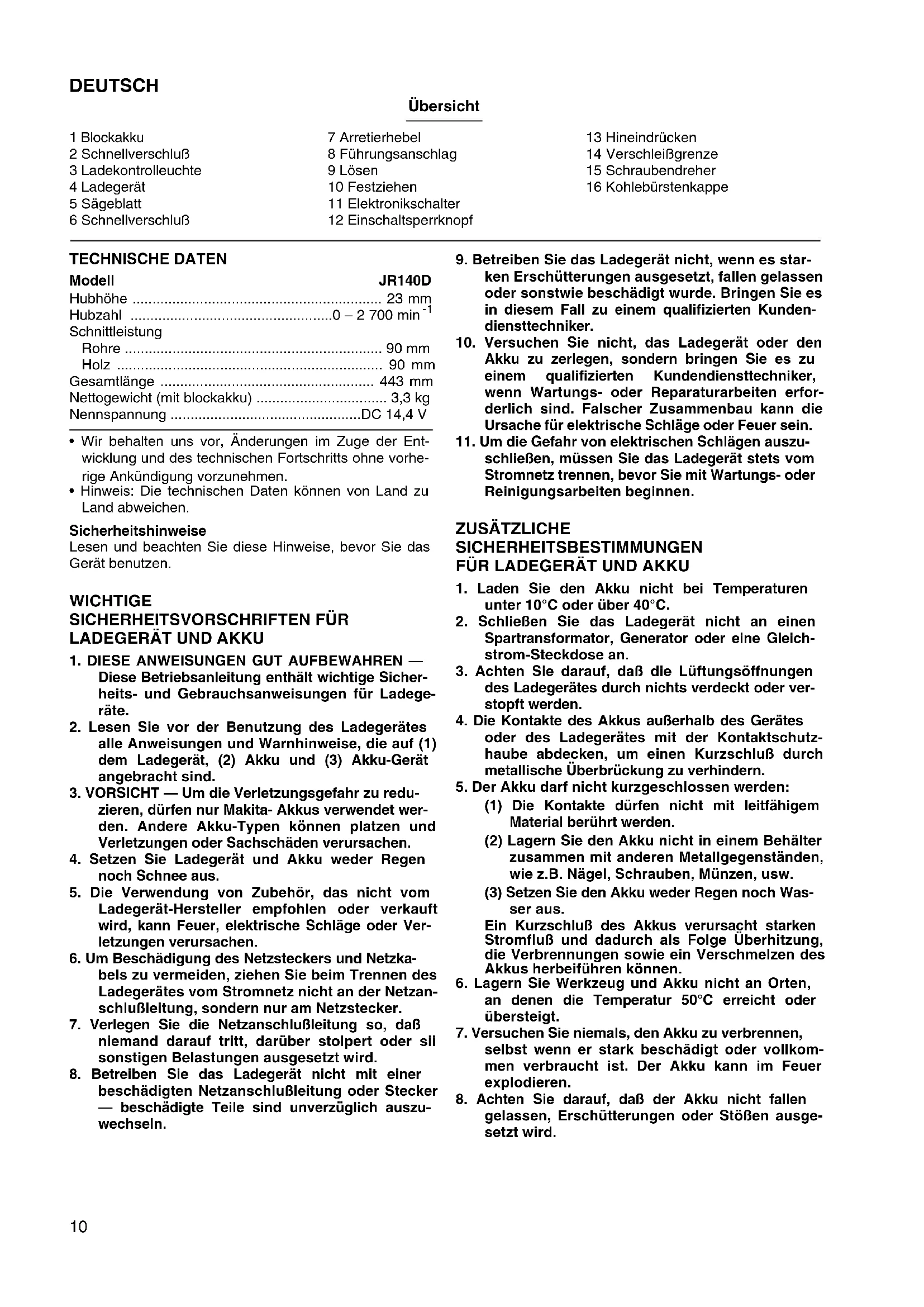 - Für einen vibrationsarmen Lauf drücken Sie beim Sägen den Führungsanschlag immer fest gegen das Werkstück. Wenn der Führungsanschlag beim Sägen nicht am Werkstück liegt, kommt es zu heftigen Rück- schlägen und/oder zu Verdrehungen der Säge und zu einem gefährlichen Springen des Sägeblatts. WARTUNG VORSICHT: Vor Arbeiten am Gerät vergewissern Sie sich, daß sich der Schalter in der “OFF”- Position befindet und der Akku aus dem Gerät entfernt ist. Kohlebürsten wechseln (Abb. 10 u. 11) Kohlebürsten ersetzen, wenn sie bis auf die Verschleiß- grenze abgenutzt sind. Beide Kohlebürsten nur paar- weise ersetzen. Um die Sicherheit und Zuverlässigkeit dieses Gerätes zu gewährleisten, sollten Reparatur-, Wartungs-, und Ein- stellarbeiten nur von durch Makita autorisierten Werk- stätter oder Kundendienstzentren unter ausschließlicher Verwendung von Makita-Originalersatzteilen ausgeführt werden.14 ITALIANO Visione Generale 1 Cartuccia batteria 2Bottone 3 Spia di carica 4 Caricabatteria 5 Lama 6Bottone 7Leva 8Scarpa 9 Per allentare 10 Per stringere 11 Interruttore 12 Bottone di sicurezza 13 Spingere dentro 14 Segno limite 15 Cacciavite 16 Tappo portaspazzole DATI TECNICI Modello JR140D Lunghezza della corsa ......................................... 23 mm N°. corse/min. ................................................... 0 – 2.700 Capacità di taglio Tubazione .......................................................... 90 mm Legno ................................................................ 90 mm Lunghezza totale ................................................ 443 mm Peso netto (Con cartuccia batteria) ....................... 3,3 kg Tensione nominale .........................................C.c. 14,4 V