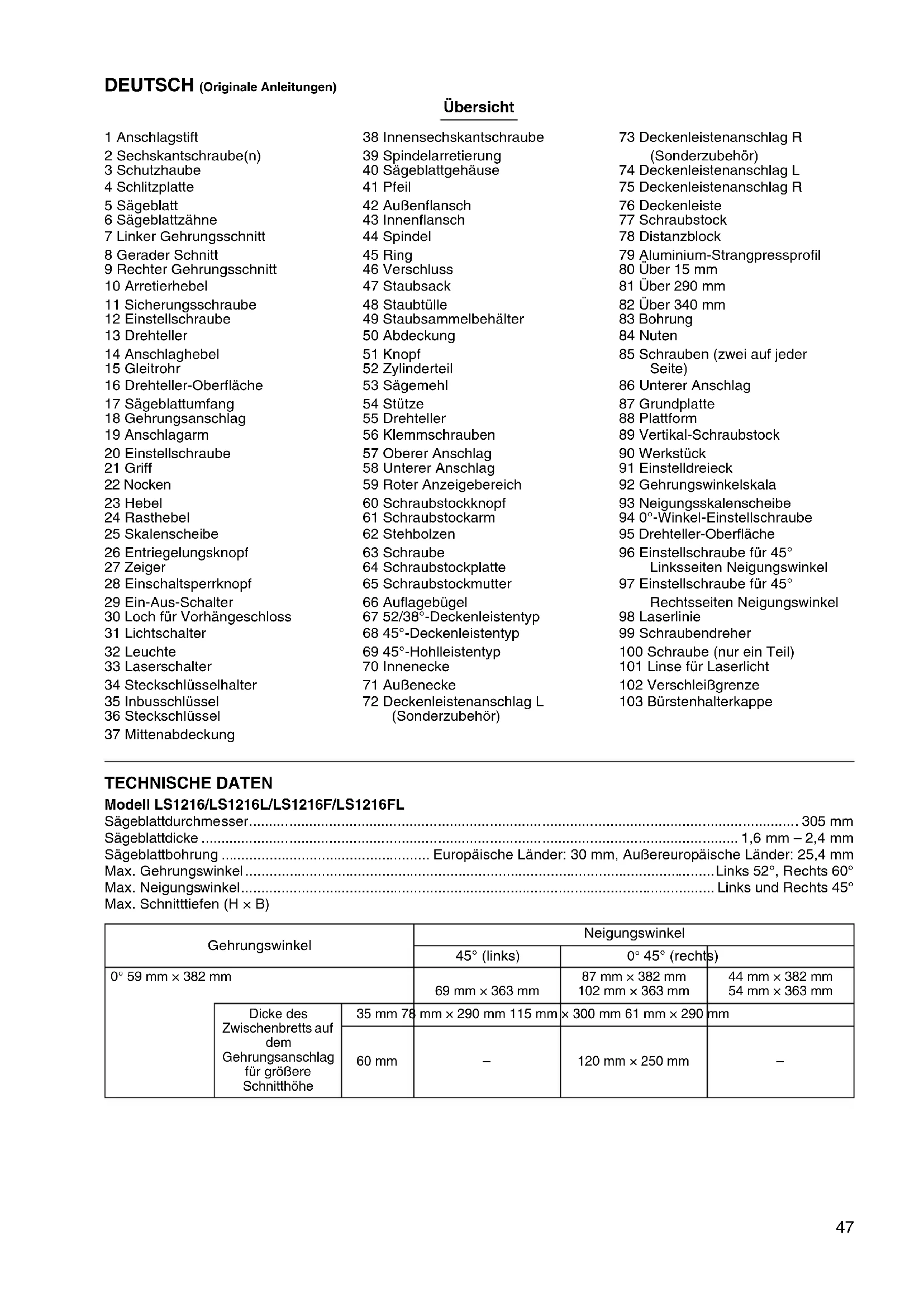 Yasushi Fukaya Directeur Makita, Jan-Baptist Vinkstraat 2, 3070, Belgique Lames pour scie d’onglet Pour des coupes effectuées en douceur et avec précision dans divers matériaux. Combinaison Lame d’usage général pour effectuer rapidement et en douceur des coupes longitudinales, des coupes en travers et des coupes d’onglet. Coupe en travers Pour des coupes plus en douceur dans le sens opposé au grain. Permet un découpage propre dans le sens opposé au grain. Coupes en travers de précision Pour des coupes propres et sans ponçage dans le sens opposé au grain. Lames pour coupe d’onglet sur métaux non ferreux Pour les coupes d’onglet dans l’aluminium, le cuivre, le laiton, les tubes et autres métaux non ferreux.47 DEUTSCH (Originale Anleitungen) Übersicht 1 Anschlagstift 2 Sechskantschraube(n) 3 Schutzhaube 4 Schlitzplatte 5 Sägeblatt 6 Sägeblattzähne 7 Linker Gehrungsschnitt 8 Gerader Schnitt 9 Rechter Gehrungsschnitt 10 Arretierhebel 11 Sicherungsschraube 12 Einstellschraube 13 Drehteller 14 Anschlaghebel 15 Gleitrohr 16 Drehteller-Oberfläche 17 Sägeblattumfang 18 Gehrungsanschlag 19 Anschlagarm 20 Einstellschraube 21 Griff 22 Nocken 23 Hebel 24 Rasthebel 25 Skalenscheibe 26 Entriegelungsknopf 27 Zeiger 28 Einschaltsperrknopf 29 Ein-Aus-Schalter 30 Loch für Vorhängeschloss 31 Lichtschalter 32 Leuchte 33 Laserschalter 34 Steckschlüsselhalter 35 Inbusschlüssel 36 Steckschlüssel 37 Mittenabdeckung 38 Innensechskantschraube 39 Spindelarretierung 40 Sägeblattgehäuse 41 Pfeil 42 Außenflansch 43 Innenflansch 44 Spindel 45 Ring 46 Verschluss 47 Staubsack 48 Staubtülle 49 Staubsammelbehälter 50 Abdeckung 51 Knopf 52 Zylinderteil 53 Sägemehl 54 Stütze 55 Drehteller 56 Klemmschrauben 57 Oberer Anschlag 58 Unterer Anschlag 59 Roter Anzeigebereich 60 Schraubstockknopf 61 Schraubstockarm 62 Stehbolzen 63 Schraube 64 Schraubstockplatte 65 Schraubstockmutter 66 Auflagebügel 67 52/38°-Deckenleistentyp 68 45°-Deckenleistentyp 69 45°-Hohlleistentyp 70 Innenecke 71 Außenecke 72 Deckenleistenanschlag L (Sonderzubehör) 73 Deckenleistenanschlag R (Sonderzubehör) 74 Deckenleistenanschlag L 75 Deckenleistenanschlag R 76 Deckenleiste 77 Schraubstock 78 Distanzblock 79 Aluminium-Strangpressprofil 80 Über 15 mm 81 Über 290 mm 82 Über 340 mm 83 Bohrung 84 Nuten 85 Schrauben (zwei auf jeder Seite) 86 Unterer Anschlag 87 Grundplatte 88 Plattform 89 Vertikal-Schraubstock 90 Werkstück 91 Einstelldreieck 92 Gehrungswinkelskala 93 Neigungsskalenscheibe 94 0°-Winkel-Einstellschraube 95 Drehteller-Oberfläche 96 Einstellschraube für 45° Linksseiten Neigungswinkel 97 Einstellschraube für 45° Rechtsseiten Neigungswinkel 98 Laserlinie 99 Schraubendreher 100 Schraube (nur ein Teil) 101 Linse für Laserlicht 102 Verschleißgrenze 103 Bürstenhalterkappe TECHNISCHE DATEN Modell LS1216/LS1216L/LS1216F/LS1216FL Sägeblattdurchmesser......................................................................................................................................... 305 mm Sägeblattdicke ...................................................................................................................................... 1,6 mm – 2,4 mm Sägeblattbohrung .................................................... Europäische Länder: 30 mm, Außereuropäische Länder: 25,4 mm Max. Gehrungswinkel.....................................................................................................................Links 52°, Rechts 60° Max. Neigungswinkel...................................................................................................................... Links und Rechts 45° Max. Schnitttiefen (H × B) Gehrungswinkel Neigungswinkel 45° (links) 0° 45° (rechts) 0° 59 mm × 382 mm 69 mm × 363 mm 87 mm × 382 mm 102 mm × 363 mm 44 mm × 382 mm 54 mm × 363 mm Dicke des Zwischenbretts auf dem Gehrungsanschlag für größere Schnitthöhe 35 mm 78 mm × 290 mm 115 mm × 300 mm 61 mm × 290 mm 60 mm – 120 mm × 250 mm –48 Spezielle max. Schnitttiefen Spezielle Maximalbreiten-Schnittleistung (bei Verwendung einer 38 mm (1-1/2”) dicken Plattform) Siehe BETRIEB für den Schneidvorgang. Leerlaufdrehzahl (min