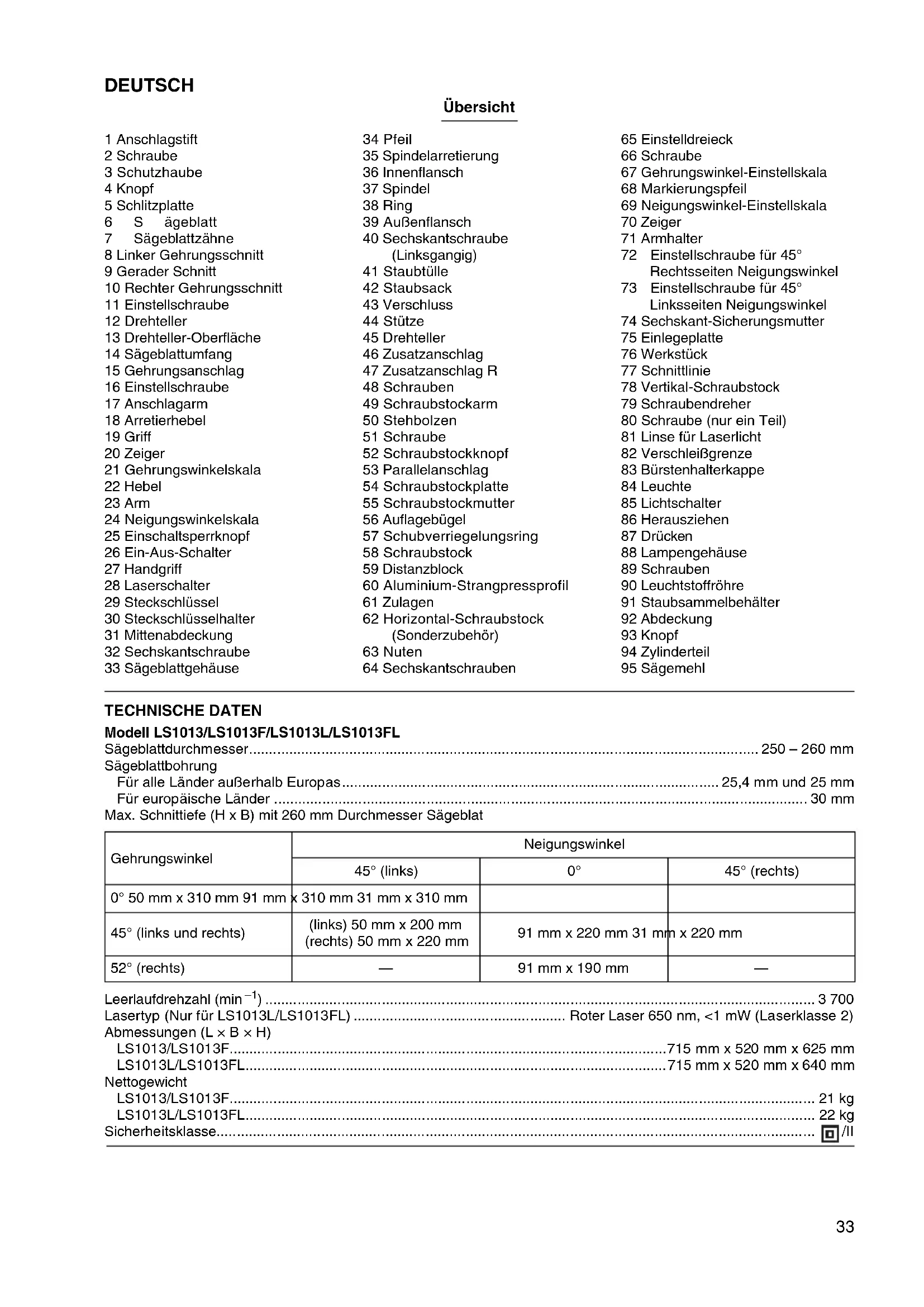 - Clé hexagonale (pour le modèle LS1013L, LS1013FL)33 DEUTSCH Übersicht 1 Anschlagstift 2 Schraube 3 Schutzhaube 4 Knopf 5 Schlitzplatte 6Sägeblatt 7Sägeblattzähne 8 Linker Gehrungsschnitt 9 Gerader Schnitt 10 Rechter Gehrungsschnitt 11 Einstellschraube 12 Drehteller 13 Drehteller-Oberfläche 14 Sägeblattumfang 15 Gehrungsanschlag 16 Einstellschraube 17 Anschlagarm 18 Arretierhebel 19 Griff 20 Zeiger 21 Gehrungswinkelskala 22 Hebel 23 Arm 24 Neigungswinkelskala 25 Einschaltsperrknopf 26 Ein-Aus-Schalter 27 Handgriff 28 Laserschalter 29 Steckschlüssel 30 Steckschlüsselhalter 31 Mittenabdeckung 32 Sechskantschraube 33 Sägeblattgehäuse 34 Pfeil 35 Spindelarretierung 36 Innenflansch 37 Spindel 38 Ring 39 Außenflansch 40 Sechskantschraube (Linksgangig) 41 Staubtülle 42 Staubsack 43 Verschluss 44 Stütze 45 Drehteller 46 Zusatzanschlag 47 Zusatzanschlag R 48 Schrauben 49 Schraubstockarm 50 Stehbolzen 51 Schraube 52 Schraubstockknopf 53 Parallelanschlag 54 Schraubstockplatte 55 Schraubstockmutter 56 Auflagebügel 57 Schubverriegelungsring 58 Schraubstock 59 Distanzblock 60 Aluminium-Strangpressprofil 61 Zulagen 62 Horizontal-Schraubstock (Sonderzubehör) 63 Nuten 64 Sechskantschrauben 65 Einstelldreieck 66 Schraube 67 Gehrungswinkel-Einstellskala 68 Markierungspfeil 69 Neigungswinkel-Einstellskala 70 Zeiger 71 Armhalter 72 Einstellschraube für 45° Rechtsseiten Neigungswinkel 73 Einstellschraube für 45° Linksseiten Neigungswinkel 74 Sechskant-Sicherungsmutter 75 Einlegeplatte 76 Werkstück 77 Schnittlinie 78 Vertikal-Schraubstock 79 Schraubendreher 80 Schraube (nur ein Teil) 81 Linse für Laserlicht 82 Verschleißgrenze 83 Bürstenhalterkappe 84 Leuchte 85 Lichtschalter 86 Herausziehen 87 Drücken 88 Lampengehäuse 89 Schrauben 90 Leuchtstoffröhre 91 Staubsammelbehälter 92 Abdeckung 93 Knopf 94 Zylinderteil 95 Sägemehl TECHNISCHE DATEN Modell LS1013/LS1013F/LS1013L/LS1013FL Sägeblattdurchmesser............................................................................................................................... 250 – 260 mm Sägeblattbohrung Für alle Länder außerhalb Europas.............................................................................................. 25,4 mm und 25 mm Für europäische Länder ..................................................................................................................................... 30 mm Max. Schnittiefe (H x B) mit 260 mm Durchmesser Sägeblat Leerlaufdrehzahl (min
