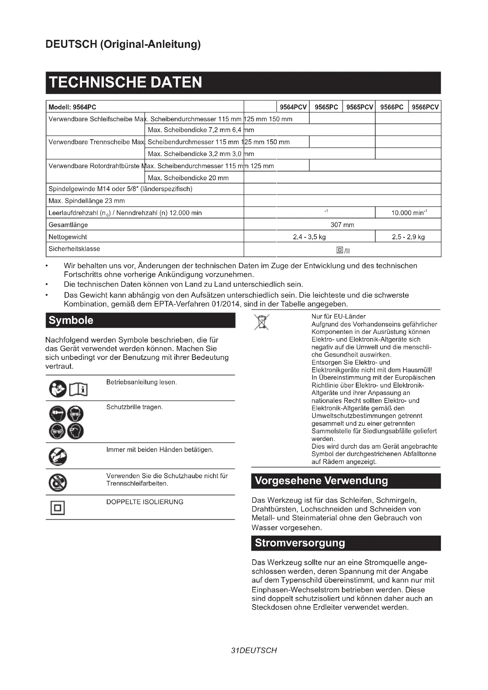 NOTE : Il se peut que certains éléments de la liste soient compris dans l’emballage de l’outil en tant qu’accessoires standard. Ils peuvent varier d’un pays à l’autre.31 DEUTSCH DEUTSCH (Original-Anleitung) TECHNISCHE DATEN Modell: 9564PC 9564PCV 9565PC 9565PCV 9566PC 9566PCV Verwendbare Schleifscheibe Max. Scheibendurchmesser 115 mm 125 mm 150 mm Max. Scheibendicke 7,2 mm 6,4 mm Verwendbare Trennscheibe Max. Scheibendurchmesser 115 mm 125 mm 150 mm Max. Scheibendicke 3,2 mm 3,0 mm Verwendbare Rotordrahtbürste Max. Scheibendurchmesser 115 mm 125 mm Max. Scheibendicke 20 mm Spindelgewinde M14 oder 5/8″ (länderspezisch) Max. Spindellänge 23 mm Leerlaufdrehzahl (n