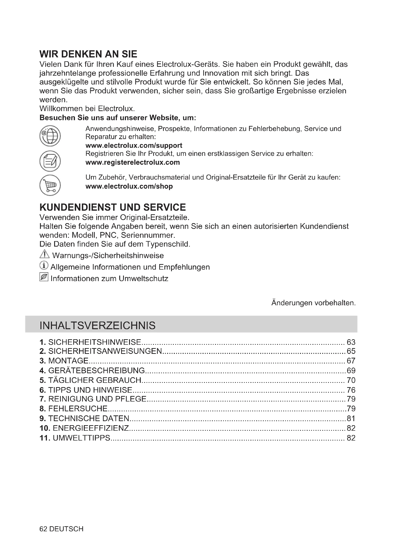 Vielen Dank für Ihren Kauf eines Electrolux-Geräts. Sie haben ein Produkt gewählt, das jahrzehntelange professionelle Erfahrung und Innovation mit sich bringt. Das ausgeklügelte und stilvolle Produkt wurde für Sie entwickelt. So können Sie jedes Mal, wenn Sie das Produkt verwenden, sicher sein, dass Sie großartige Ergebnisse erzielen werden. Willkommen bei Electrolux. Besuchen Sie uns auf unserer Website, um: Anwendungshinweise, Prospekte, Informationen zu Fehlerbehebung, Service und Reparatur zu erhalten: www.electrolux.com/support Registrieren Sie Ihr Produkt, um einen erstklassigen Service zu erhalten: www.registerelectrolux.com Um Zubehör, Verbrauchsmaterial und Original-Ersatzteile für Ihr Gerät zu kaufen: www.electrolux.com/shop