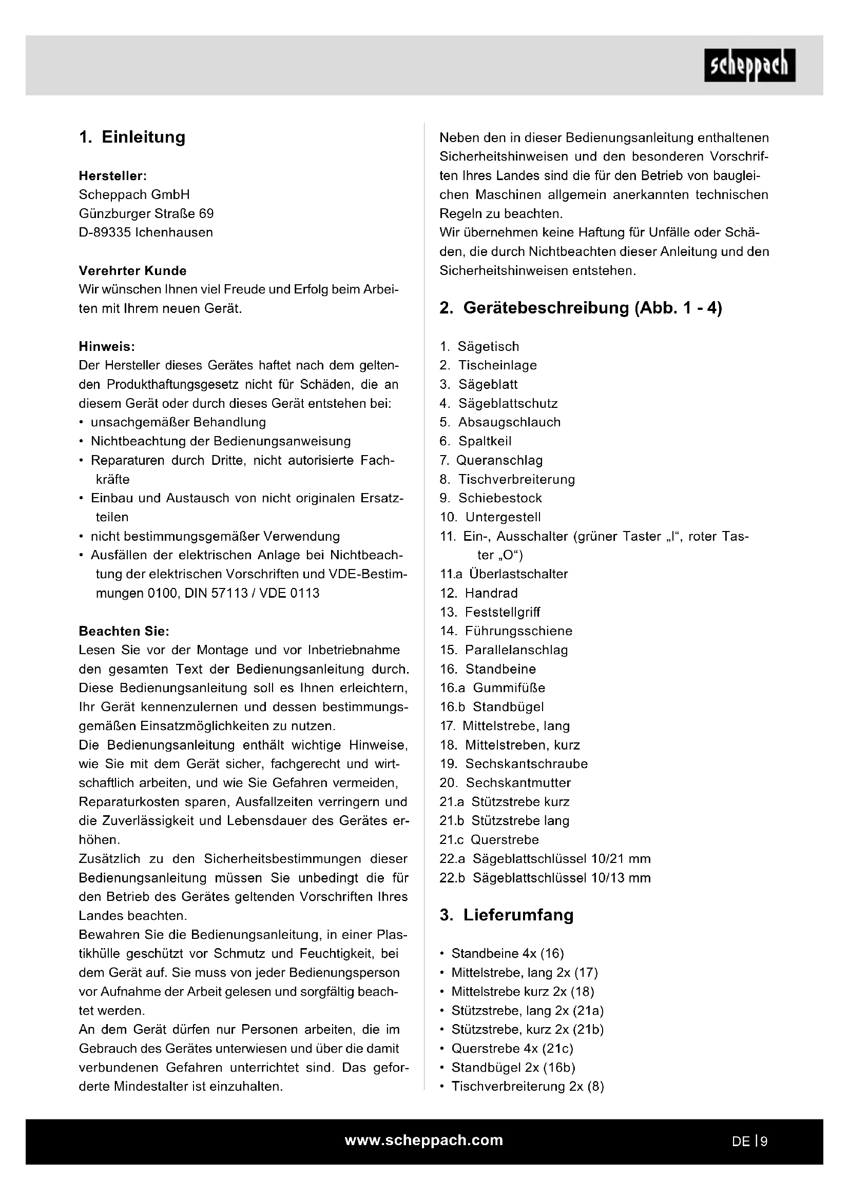 Die Tischkreissäge dient zum Längs- und Querschnei- den (nur mit Queranschlag) von Hölzern aller Art, ent- sprechend der Maschinengröße. Rundhölzer aller Art dürfen nicht geschnitten werden. Die Maschine darf nur nach ihrer Bestimmung ver- wendet werden. Jede weitere darüber hinausgehende Verwendung ist nicht bestimmungsgemäß. Für daraus hervorgehende Schäden oder Verletzungen aller Art haftet der Benut- zer/Bediener und nicht der Hersteller. Es dürfen nur für die Maschine geeignete Sägeblätter (HM- oder CV-Sägeblätter) verwendet werden. Die Verwendung von HSS-Sägeblättern und Trenn- scheiben aller Art ist untersagt. Bestandteil der bestim- mungsgemäßen Verwendung ist auch die Beachtung der Sicherheitshinweise, sowie der Montageanleitung und Betriebshinweise in der Bedienungsanleitung. Personen, die die Maschine bedienen und warten, müs- sen mit dieser vertraut und über mögliche Gefahren un- terrichtet sein. Darüber hinaus sind die geltenden Un- fallverhütungsvorschriften genauestens einzuhalten. Sonstige allgemeine Regeln in arbeitsmedizinischen und sicherheitstechnischen Bereichen sind zu beachten. m Achtung! Beim Benutzen von Geräten müssen einige Sicher- heitsvorkehrungen eingehalten werden, um Verlet- zungen und Schäden zu verhindern. Lesen Sie diese Bedienungsanleitung / Sicherheitshinweise deshalb sorgfältig durch. Bewahren Sie diese gut auf, damit Ih- nen die Informationen jederzeit zur Verfügung stehen. Falls Sie das Gerät an andere Personen übergeben sollten, händigen Sie diese Bedienungsanleitung / Si- cherheitshinweise bitte mit aus.www.scheppach.com