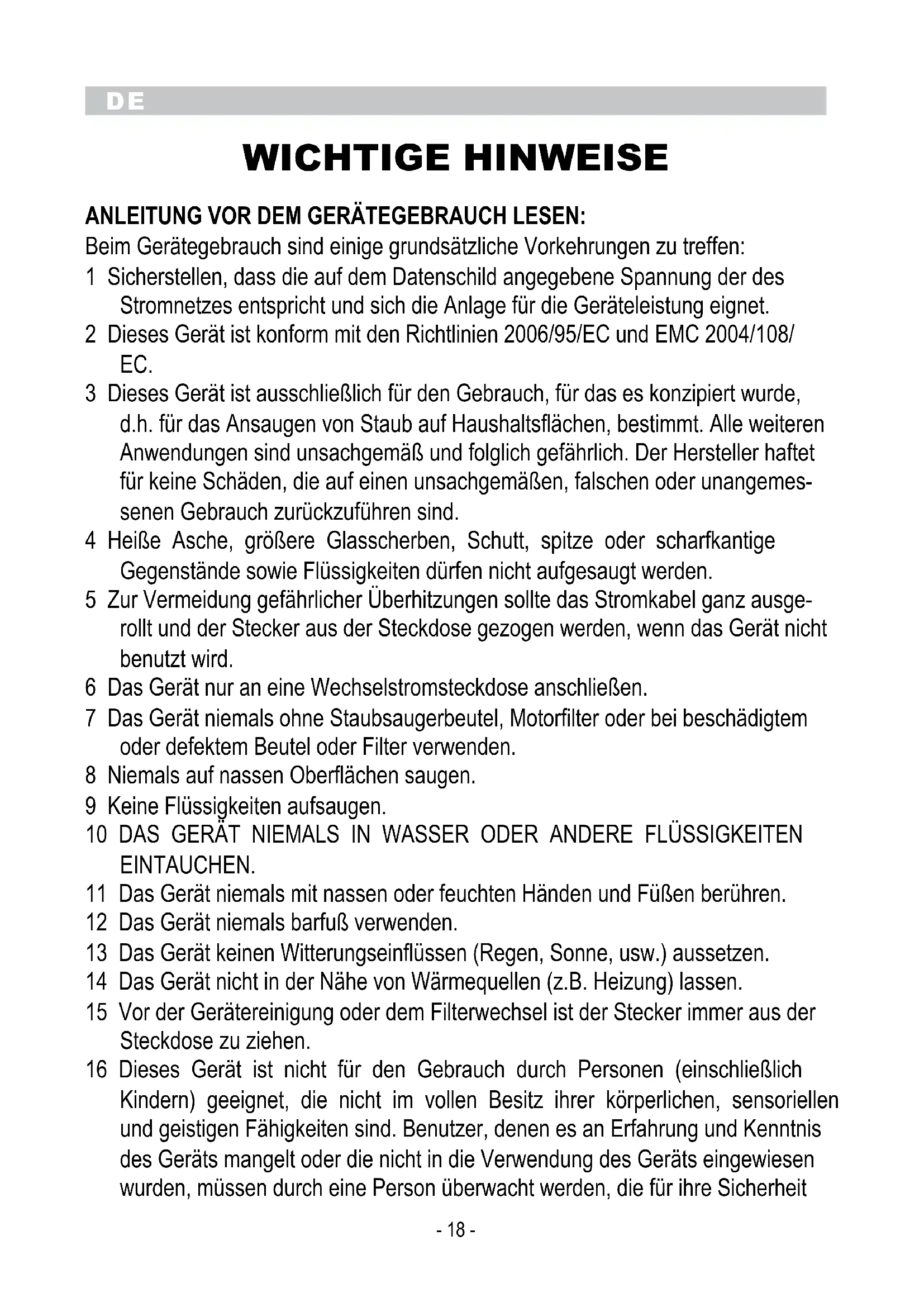 WICHTIGE HINWEISE ANLEITUNG VOR DEM GERÄTEGEBRAUcH LESEN: Beim Gerätegebrauch sind einige grundsätzliche Vorkehrungen zu treffen: 1 Sicherstellen, dass die auf dem Datenschild angegebene Spannung der des Stromnetzes entspricht und sich die Anlage für die Geräteleistung eignet. 2 Dieses Gerät ist konform mit den Richtlinien 2006/95/EC und EMC 2004/108/ EC. 3 Dieses Gerät ist ausschließlich für den Gebrauch, für das es konzipiert wurde, d.h. für das Ansaugen von Staub auf Haushaltsflächen, bestimmt. Alle weiteren Anwendungen sind unsachgemäß und folglich gefährlich. Der Hersteller haftet für keine Schäden, die auf einen unsachgemäßen, falschen oder unangemes- senen Gebrauch zurückzuführen sind. 4 Heiße Asche, größere Glasscherben, Schutt, spitze oder scharfkantige Gegenstände sowie Flüssigkeiten dürfen nicht aufgesaugt werden. 5 Zur Vermeidung gefährlicher Überhitzungen sollte das Stromkabel ganz ausge- rollt und der Stecker aus der Steckdose gezogen werden, wenn das Gerät nicht benutzt wird. 6 Das Gerät nur an eine Wechselstromsteckdose anschließen. 7 Das Gerät niemals ohne Staubsaugerbeutel, Motorfilter oder bei beschädigtem oder defektem Beutel oder Filter verwenden. 8 Niemals auf nassen Oberflächen saugen. 9 Keine Flüssigkeiten aufsaugen. 10 DAS GERÄT NIEMALS IN WASSER ODER ANDERE FLÜSSIGKEITEN EINTAUCHEN. 11 Das Gerät niemals mit nassen oder feuchten Händen und Füßen berühren. 12 Das Gerät niemals barfuß verwenden. 13 Das Gerät keinen Witterungseinflüssen (Regen, Sonne, usw.) aussetzen. 14 Das Gerät nicht in der Nähe von Wärmequellen (z.B. Heizung) lassen. 15 Vor der Gerätereinigung oder dem Filterwechsel ist der Stecker immer aus der Steckdose zu ziehen. 16 Dieses Gerät ist nicht für den Gebrauch durch Personen (einschließlich Kindern) geeignet, die nicht im vollen Besitz ihrer körperlichen, sensoriellen und geistigen Fähigkeiten sind. Benutzer, denen es an Erfahrung und Kenntnis des Geräts mangelt oder die nicht in die Verwendung des Geräts eingewiesen wurden, müssen durch eine Person überwacht werden, die für ihre SicherheitDE