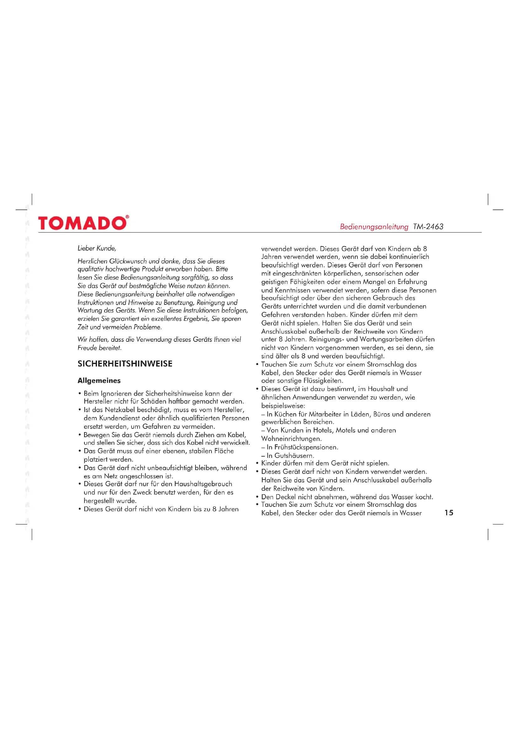Herzlichen Glückwunsch zum Kauf eines Gerätes aus dem TOMADO-Sortiment.