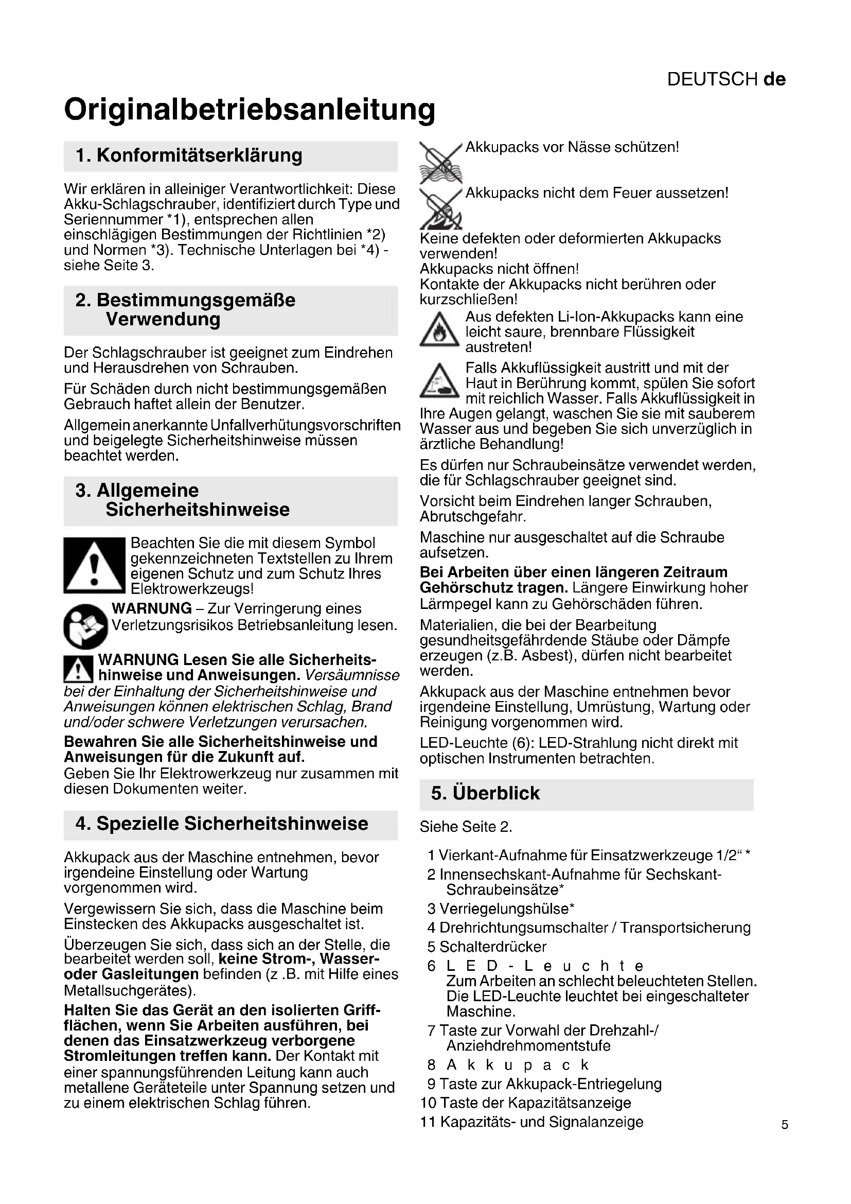 Originalbetriebsanleitung Wir erklären in alleiniger Verantwortlichkeit: Diese Akku-Schlagschrauber, identifiziert durch Type und Seriennummer *1), entsprechen allen einschlägigen Bestimmungen der Richtlinien *2) und Normen *3). Technische Unterlagen bei *4) - siehe Seite 3. Der Schlagschrauber ist geeignet zum Eindrehen und Herausdrehen von Schrauben. Für Schäden durch nicht bestimmungsgemäßen Gebrauch haftet allein der Benutzer. Allgemein anerkannte Unfallverhütungsvorschriften und beigelegte Sicherheitshinweise müssen beachtet werden. Beachten Sie die mit diesem Symbol gekennzeichneten Textstellen zu Ihrem eigenen Schutz und zum Schutz Ihres Elektrowerkzeugs! WARNUNG – Zur Verringerung eines Verletzungsrisikos Betriebsanleitung lesen. WARNUNG Lesen Sie alle Sicherheits- hinweise und Anweisungen. Versäumnisse bei der Einhaltung der Sicherheitshinweise und Anweisungen können elektrischen Schlag, Brand und/oder schwere Verletzungen verursachen. Bewahren Sie alle Sicherheitshinweise und Anweisungen für die Zukunft auf. Geben Sie Ihr Elektrowerkzeug nur zusammen mit diesen Dokumenten weiter. Akkupack aus der Maschine entnehmen, bevor irgendeine Einstellung oder Wartung vorgenommen wird. Vergewissern Sie sich, dass die Maschine beim Einstecken des Akkupacks ausgeschaltet ist. Überzeugen Sie sich, dass sich an der Stelle, die bearbeitet werden soll, keine Strom-, Wasser- oder Gasleitungen befinden (z .B. mit Hilfe eines Metallsuchgerätes). Halten Sie das Gerät an den isolierten Griff- flächen, wenn Sie Arbeiten ausführen, bei denen das Einsatzwerkzeug verborgene Stromleitungen treffen kann. Der Kontakt mit einer spannungsführenden Leitung kann auch metallene Geräteteile unter Spannung setzen und zu einem elektrischen Schlag führen. Akkupacks vor Nässe schützen! Akkupacks nicht dem Feuer aussetzen! Keine defekten oder deformierten Akkupacks verwenden! Akkupacks nicht öffnen! Kontakte der Akkupacks nicht berühren oder kurzschließen! Aus defekten Li-Ion-Akkupacks kann eine leicht saure, brennbare Flüssigkeit austreten! Falls Akkuflüssigkeit austritt und mit der Haut in Berührung kommt, spülen Sie sofort mit reichlich Wasser. Falls Akkuflüssigkeit in Ihre Augen gelangt, waschen Sie sie mit sauberem Wasser aus und begeben Sie sich unverzüglich in ärztliche Behandlung! Es dürfen nur Schraubeinsätze verwendet werden, die für Schlagschrauber geeignet sind. Vorsicht beim Eindrehen langer Schrauben, Abrutschgefahr. Maschine nur ausgeschaltet auf die Schraube aufsetzen. Bei Arbeiten über einen längeren Zeitraum Gehörschutz tragen. Längere Einwirkung hoher Lärmpegel kann zu Gehörschäden führen. Materialien, die bei der Bearbeitung gesundheitsgefährdende Stäube oder Dämpfe erzeugen (z.B. Asbest), dürfen nicht bearbeitet werden. Akkupack aus der Maschine entnehmen bevor irgendeine Einstellung, Umrüstung, Wartung oder Reinigung vorgenommen wird. LED-Leuchte (6): LED-Strahlung nicht direkt mit optischen Instrumenten betrachten. Siehe Seite 2. 1 Vierkant-Aufnahme für Einsatzwerkzeuge 1/2“ * 2 Innensechskant-Aufnahme für Sechskant- Schraubeinsätze* 3 Verriegelungshülse* 4 Drehrichtungsumschalter / Transportsicherung 5 Schalterdrücker 6LED-Leuchte Zum Arbeiten an schlecht beleuchteten Stellen. Die LED-Leuchte leuchtet bei eingeschalteter Maschine. 7 Taste zur Vorwahl der Drehzahl-/ Anziehdrehmomentstufe 8Akkupack 9 Taste zur Akkupack-Entriegelung 10 Taste der Kapazitätsanzeige 11 Kapazitäts- und Signalanzeige