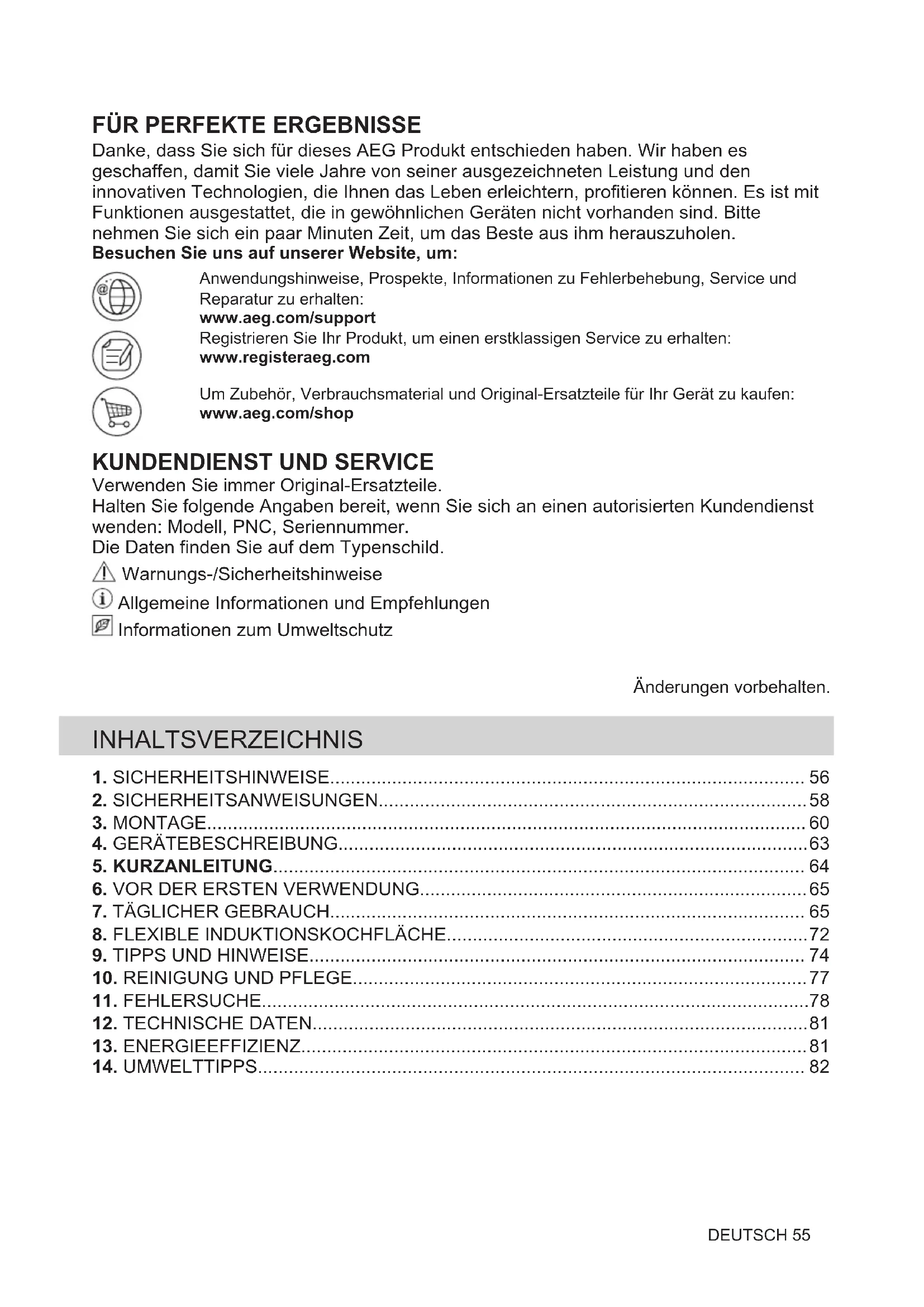 Danke, dass Sie sich für dieses AEG Produkt entschieden haben. Wir haben es geschaffen, damit Sie viele Jahre von seiner ausgezeichneten Leistung und den innovativen Technologien, die Ihnen das Leben erleichtern, profitieren können. Es ist mit Funktionen ausgestattet, die in gewöhnlichen Geräten nicht vorhanden sind. Bitte nehmen Sie sich ein paar Minuten Zeit, um das Beste aus ihm herauszuholen. Besuchen Sie uns auf unserer Website, um: Anwendungshinweise, Prospekte, Informationen zu Fehlerbehebung, Service und Reparatur zu erhalten: www.aeg.com/support Registrieren Sie Ihr Produkt, um einen erstklassigen Service zu erhalten: www.registeraeg.com Um Zubehör, Verbrauchsmaterial und Original-Ersatzteile für Ihr Gerät zu kaufen: www.aeg.com/shop
