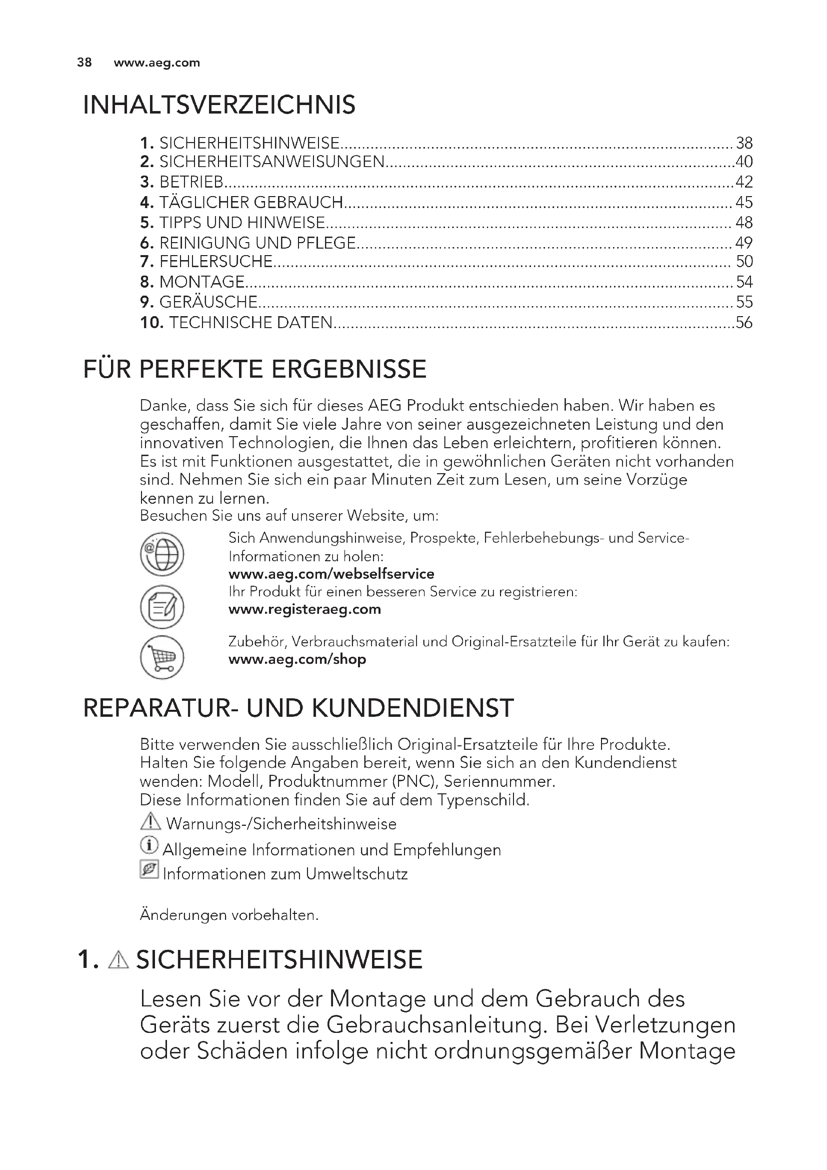 SICHERHEITSHINWEISE Lesen Sie vor der Montage und dem Gebrauch des Geräts zuerst die Gebrauchsanleitung. Bei Verletzungen oder Schäden infolge nicht ordnungsgemäßer Montage www.aeg.com 38oder Verwendung des Geräts übernimmt der Hersteller keine Haftung. Bewahren Sie die Anleitung immer an einem sicheren und zugänglichen Ort zum späteren Nachschlagen auf.